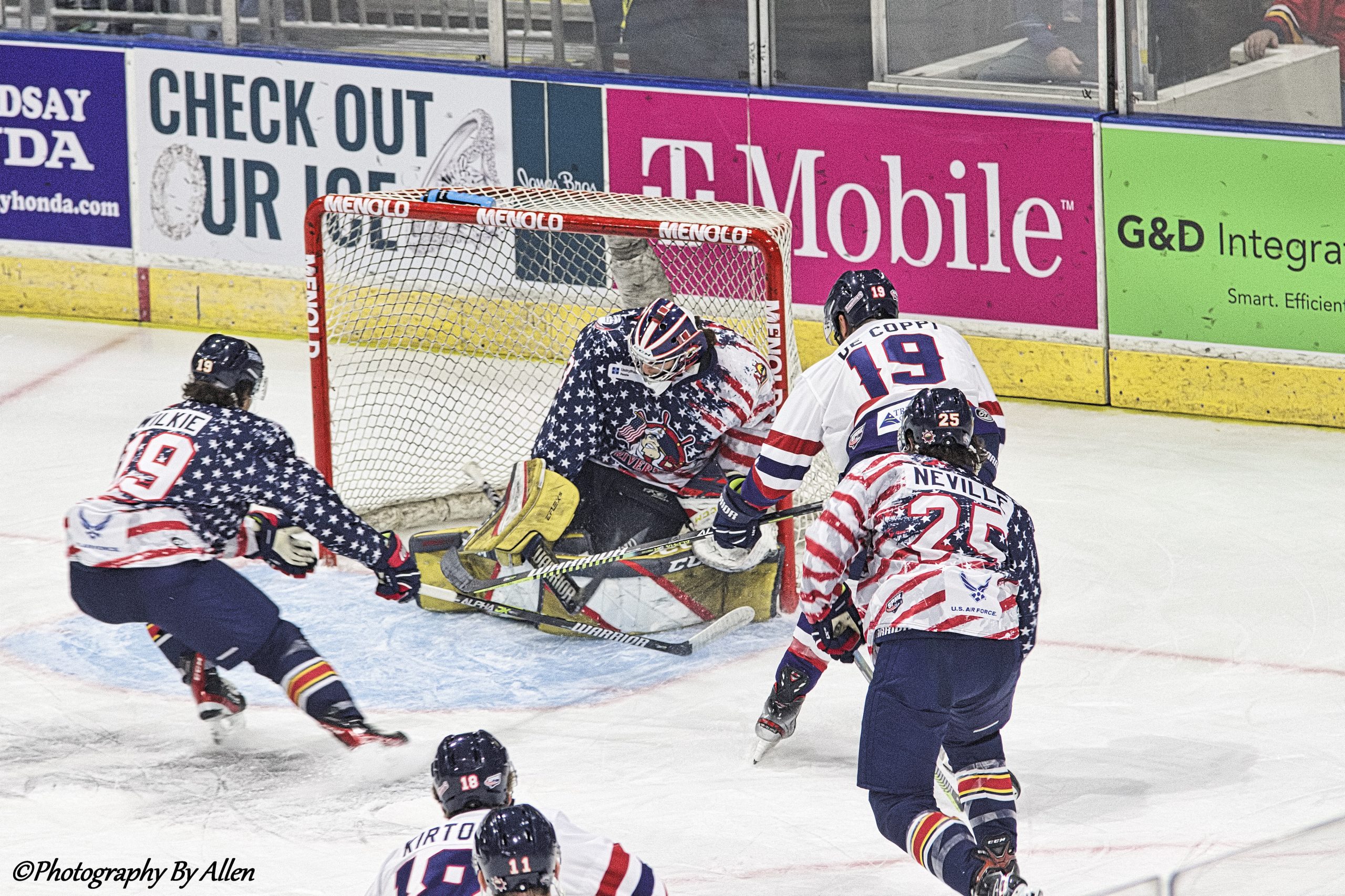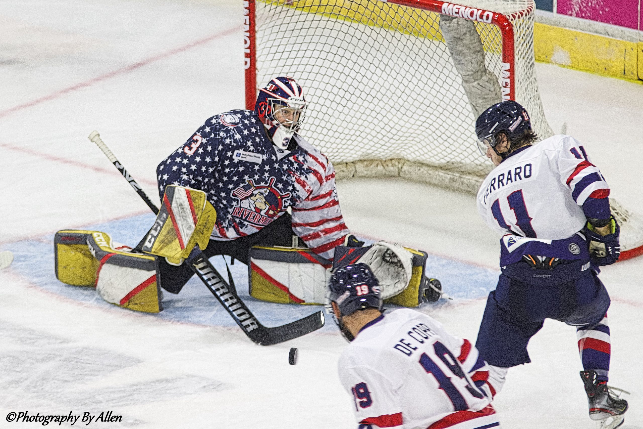 It was a scoreless first period between the two rivals, both of whom are undefeated when scoring the first goal of a game. It was during a period of four-on-four play in the second, that the Rivermen broke through when they needed to the most. A long stretch pass from Paul Deslauriers, in his own zone, found Hagaman in stride at the Thunderbolt blue line. In on a breakaway, Hagaman elected to shoot instead of deke and his shot found the back of the net as it zipped past Evansville netminder Brian Billett.