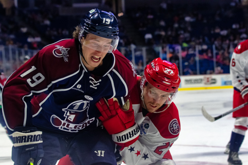 Tulsa Oilers forward Carson Focht (19), Allen Americans defenseman Justin Allen (27)