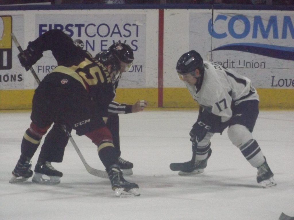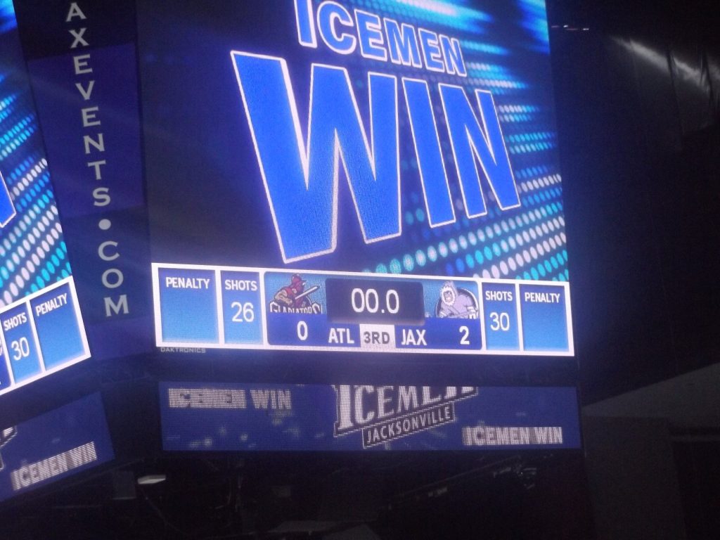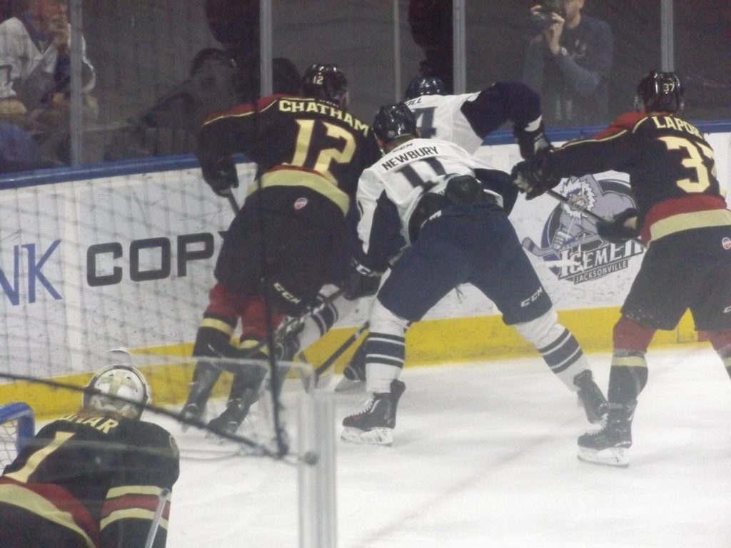 Both teams skated hard and took part in a competitive, but scoreless first 20 minutes of play. However, it took just 54 seconds into the second period to break up the scoreless tie. Jacksonville’s Jack Glover delivered the puck behind the to net to Kris Newbury. Newbury immediately redirected the puck between his legs to David Broll at the left wing circle. Broll then launched a wrist shot that beat Atlanta goaltender Sean Bonar to give the Icemen a 1-0 edge.