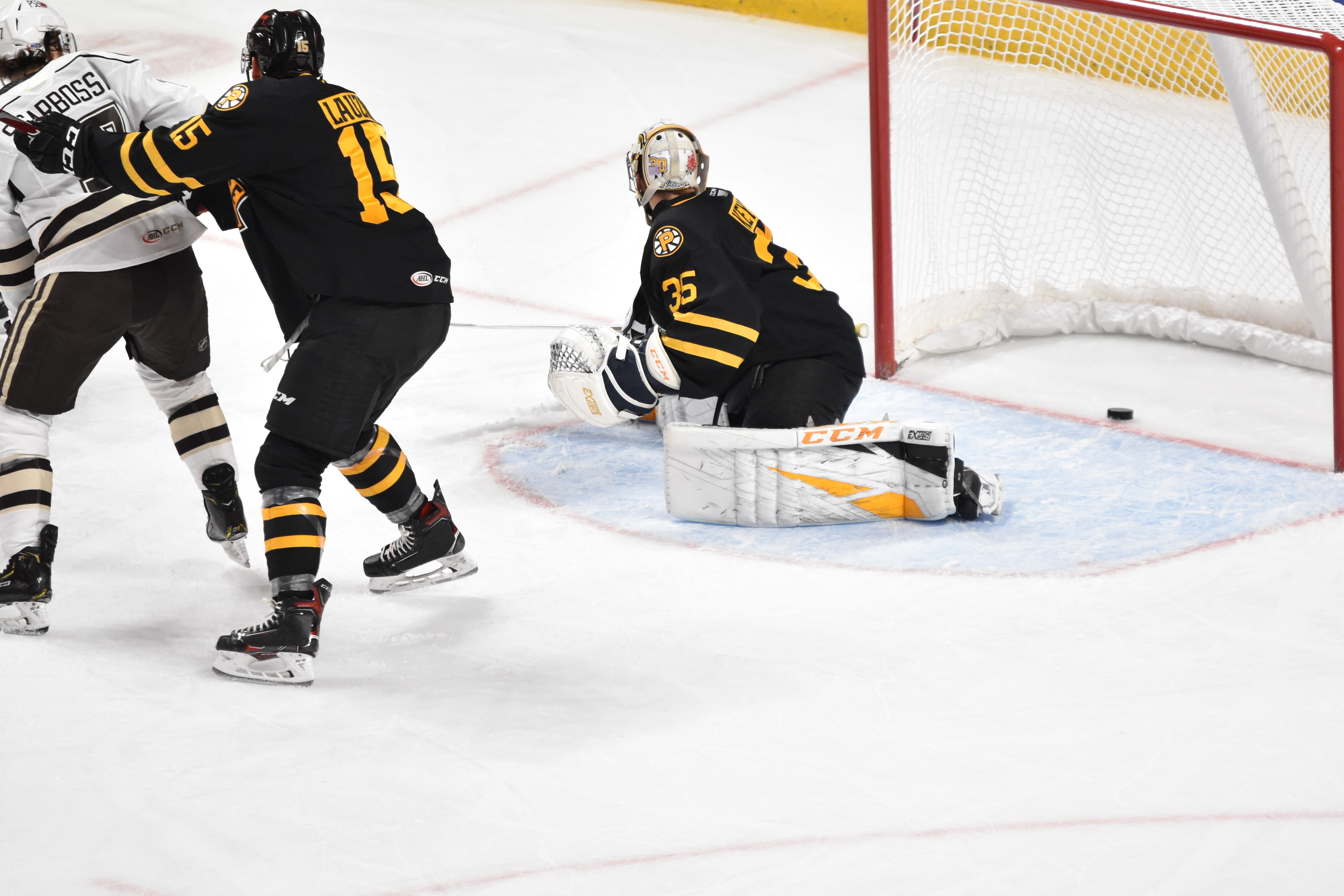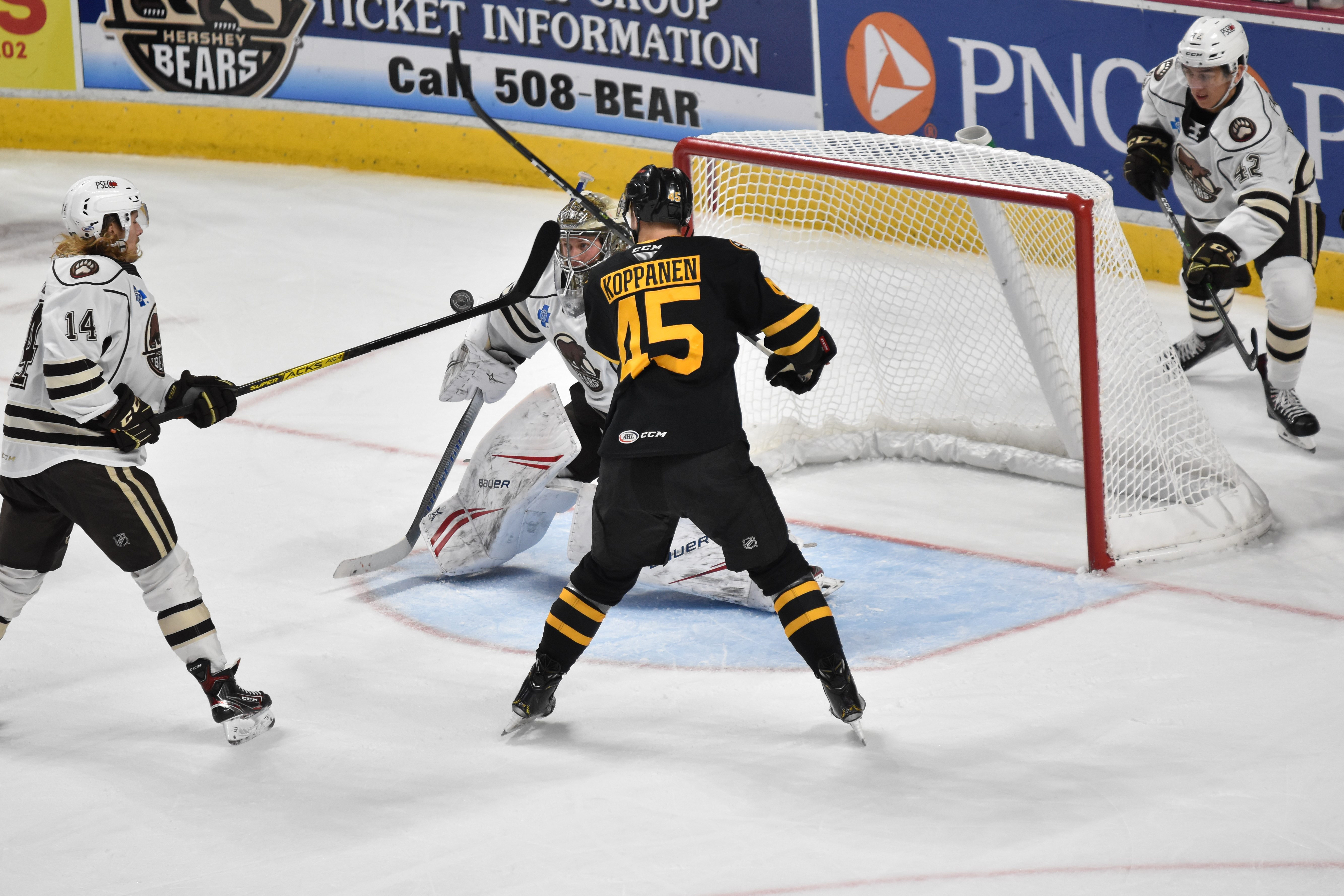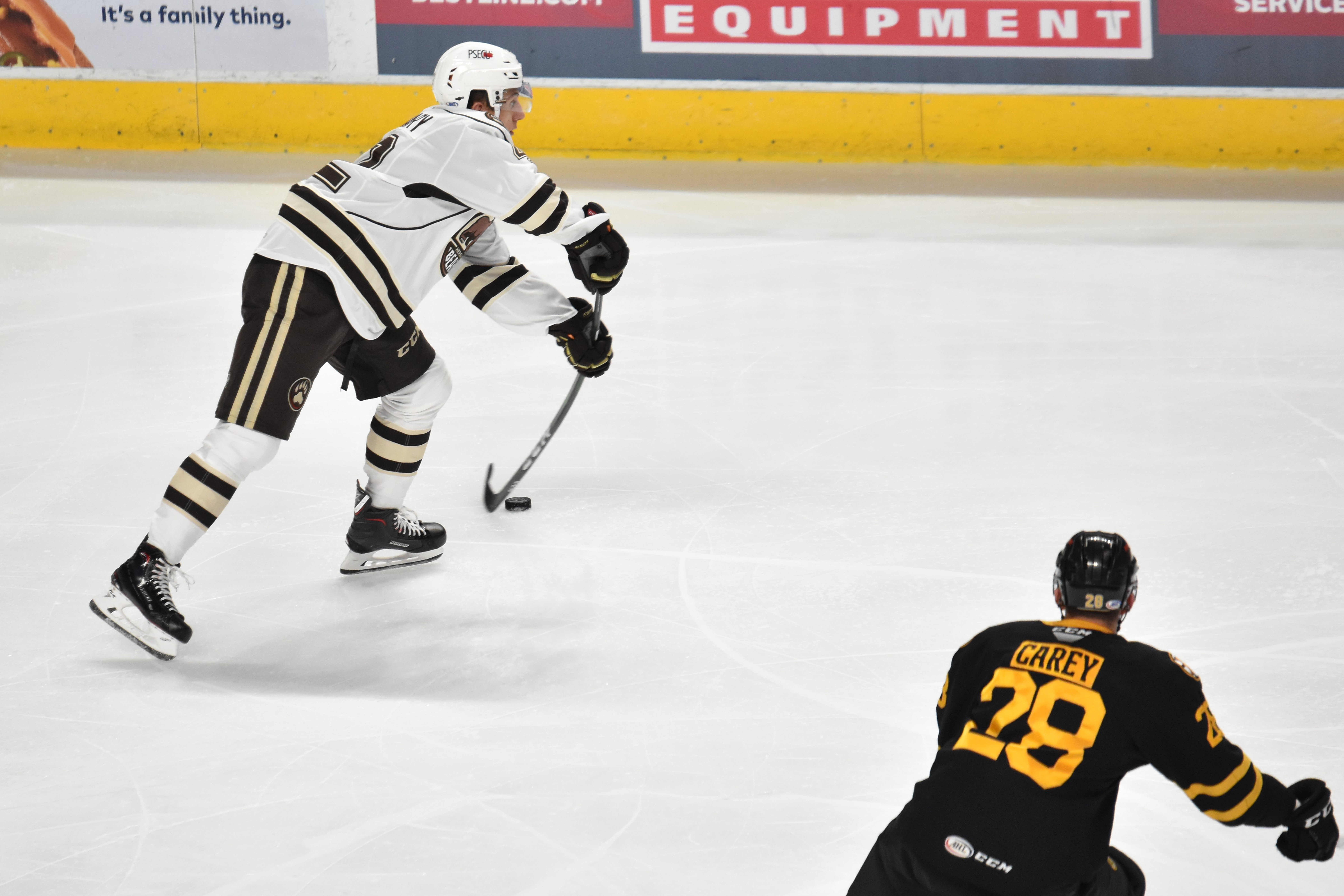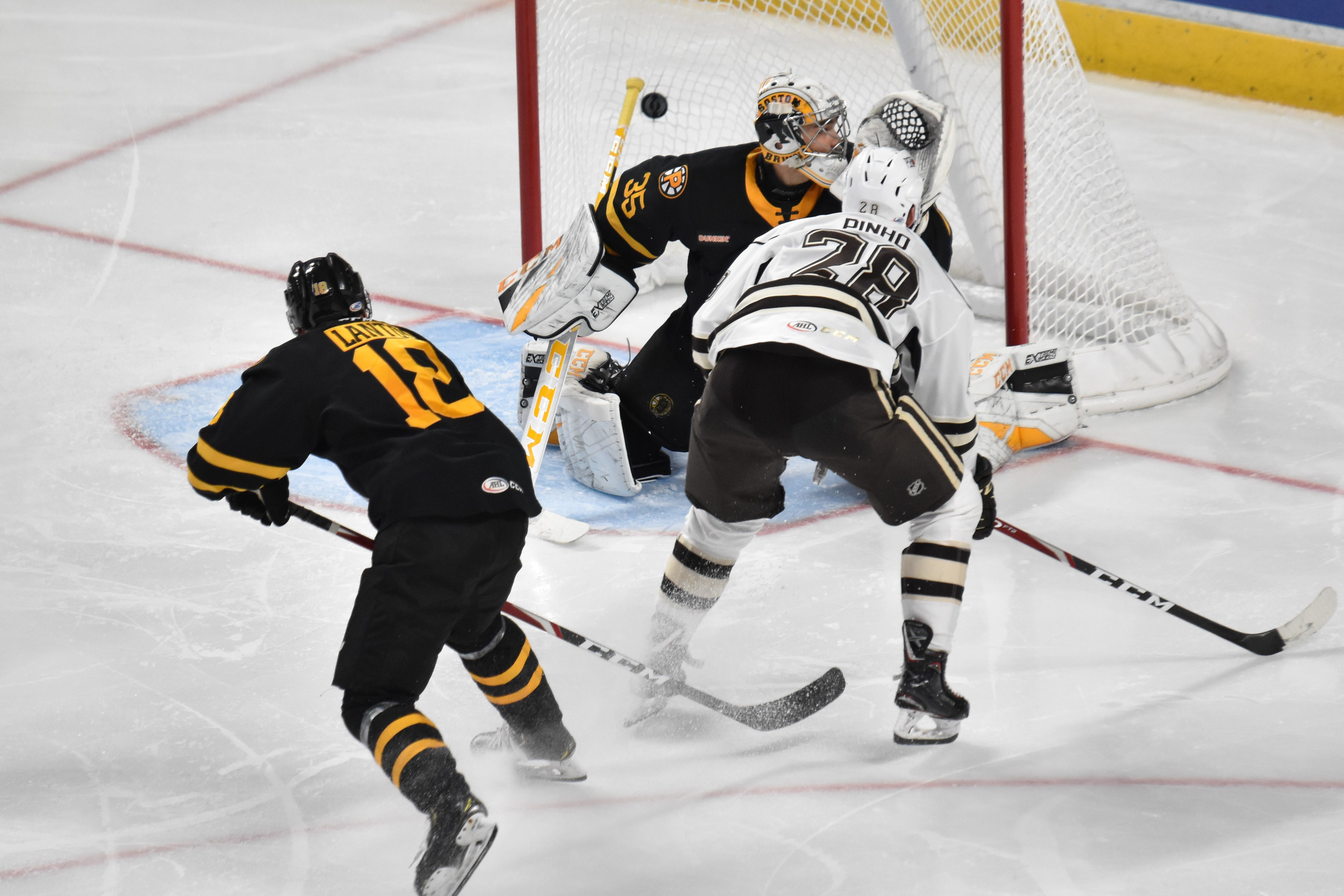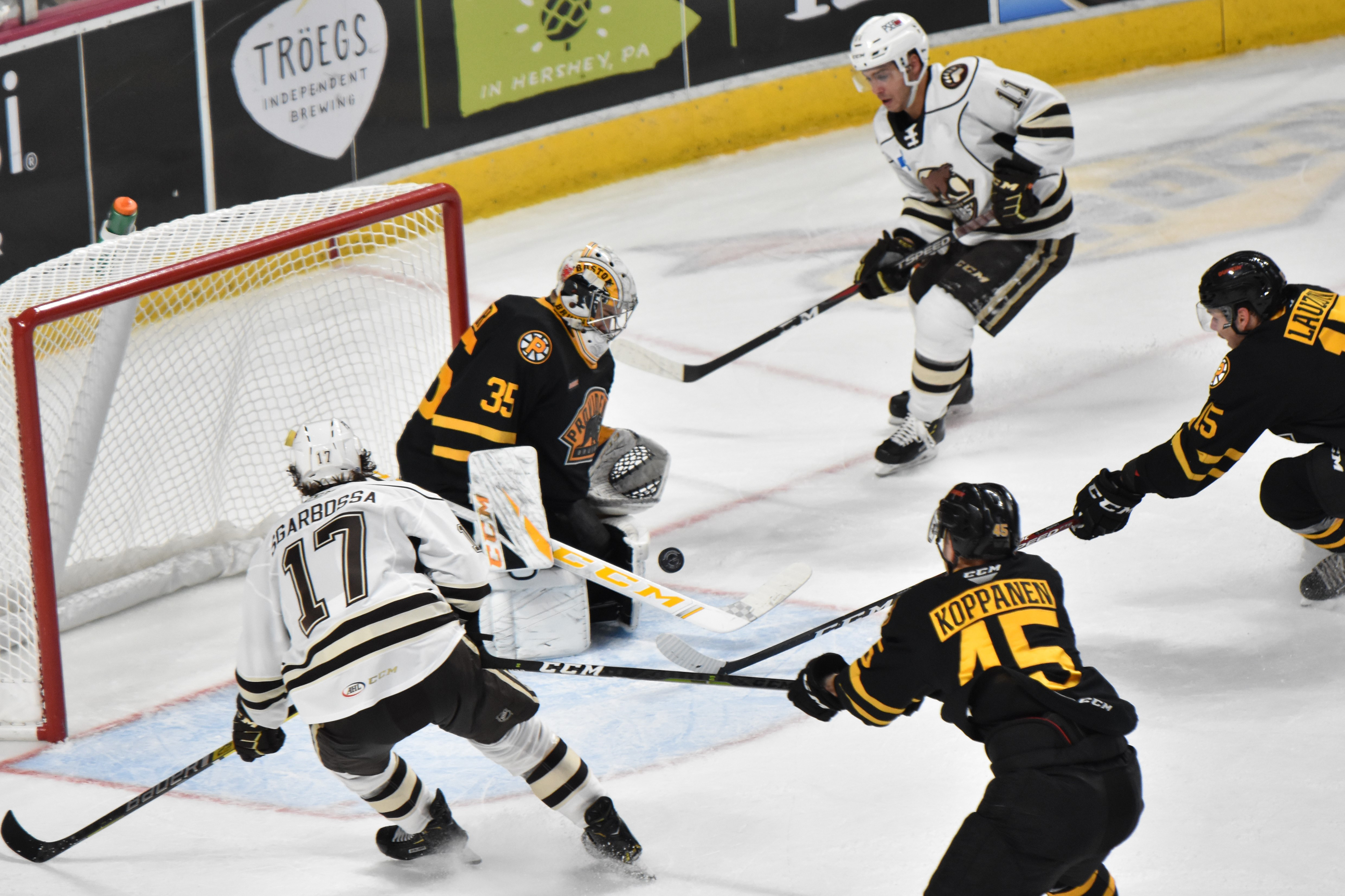 In the third period, Pinho and Pilon both hit paydirt on transition plays to reclaim Hershey’s two-goal edge. At 3:15, Pinho scored his second goal, and second game-winning goal of the season after roofing a shot bar-down from the right wing. Only 17 seconds later, Pilon tallied his first goal of the season after blasting a one-timer into the cage following a perfect pass from Christian Djoos. Vanecek stopped all nine shots faced in the final period, and 20 of 23 overall.