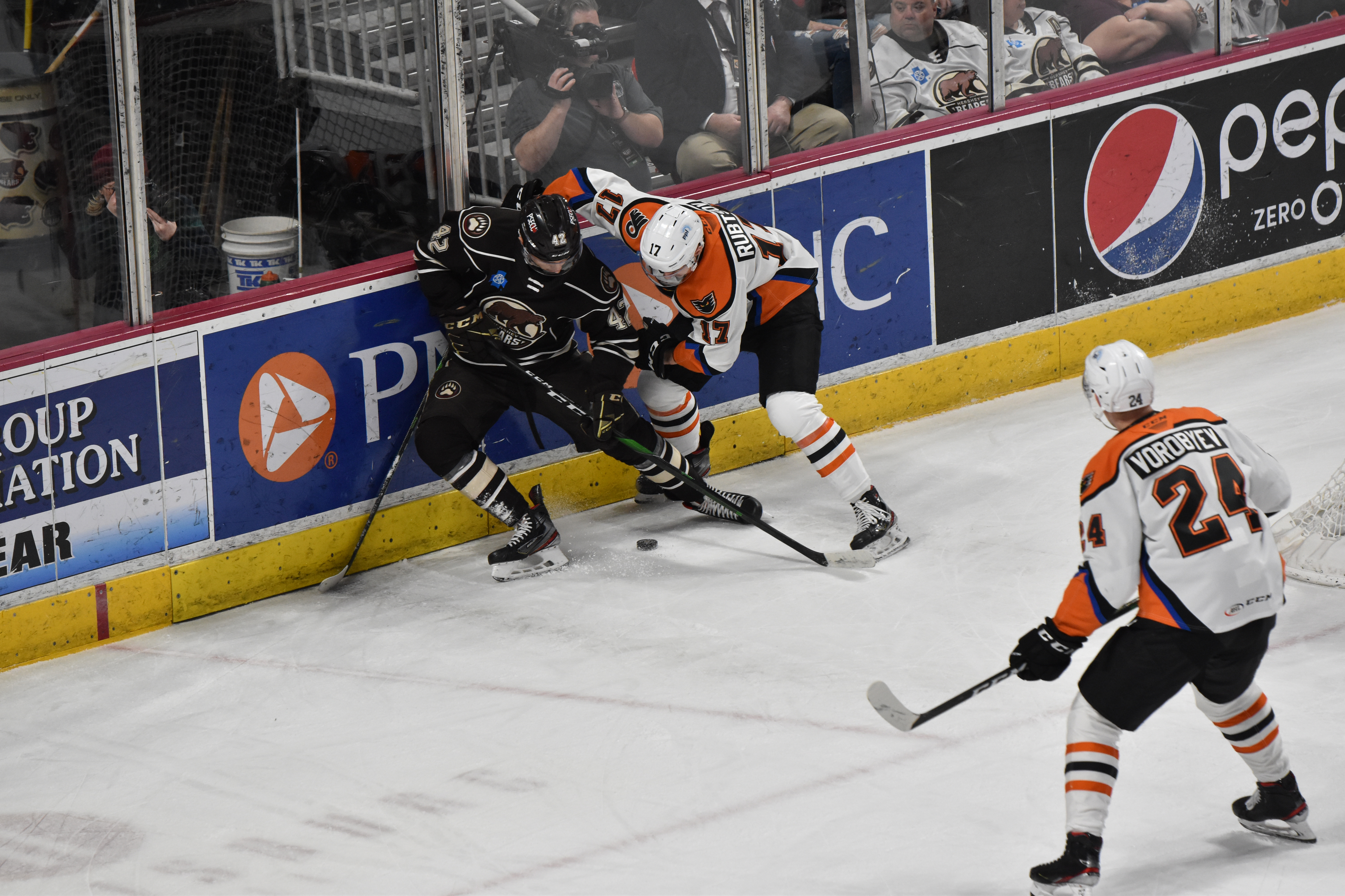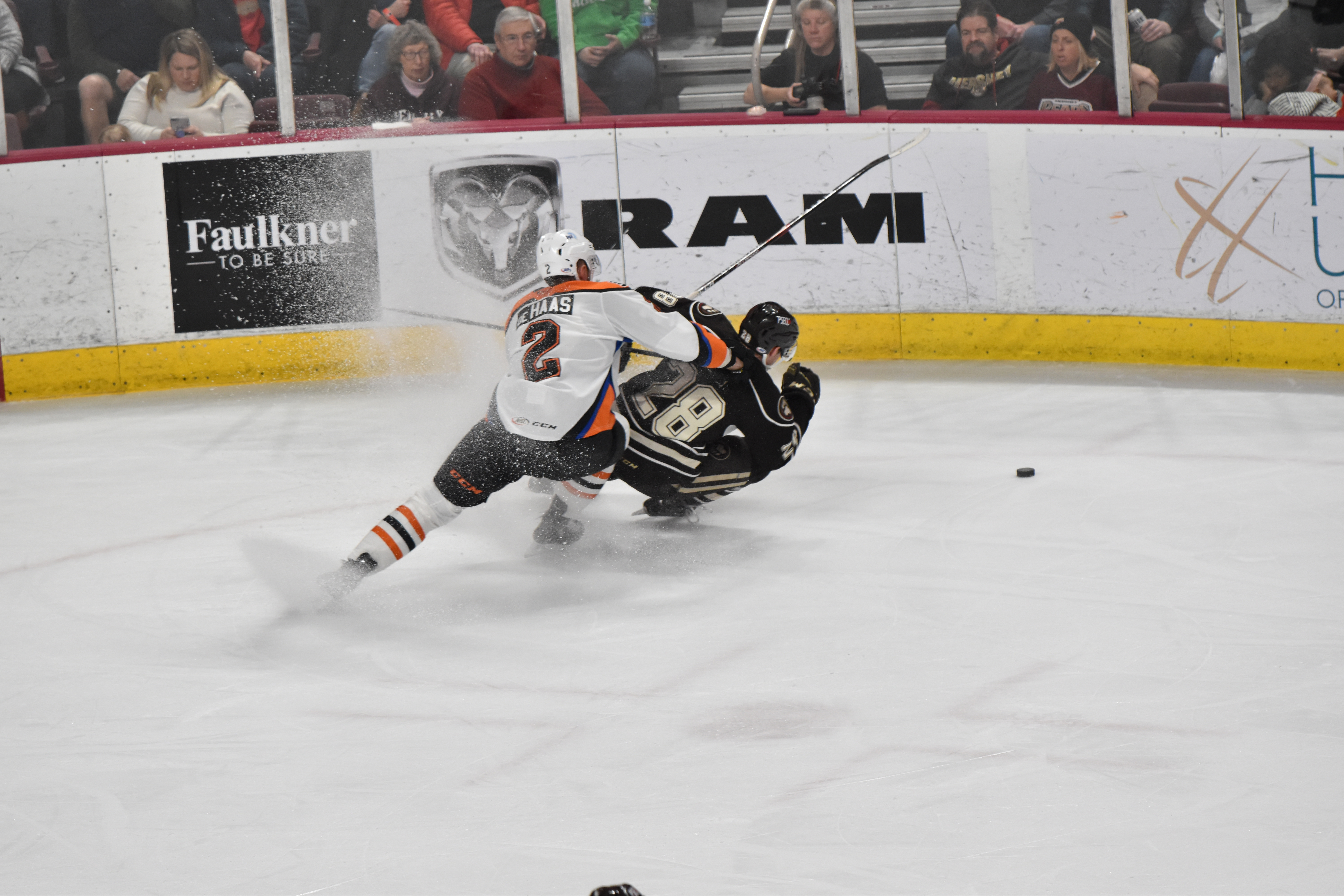 In the second period, the Chocolate and White were held to only three shots on goal, but converted on their first attempt. Hershey started the frame on a power play after Issac Ratcliffe was guilty of elbowing at 19:52 in the previous period. On the ensuing man-advantage, Christian Djoos unleashed a shot from the blueline which alluded Berube and doubled his team’s lead at 1:26.