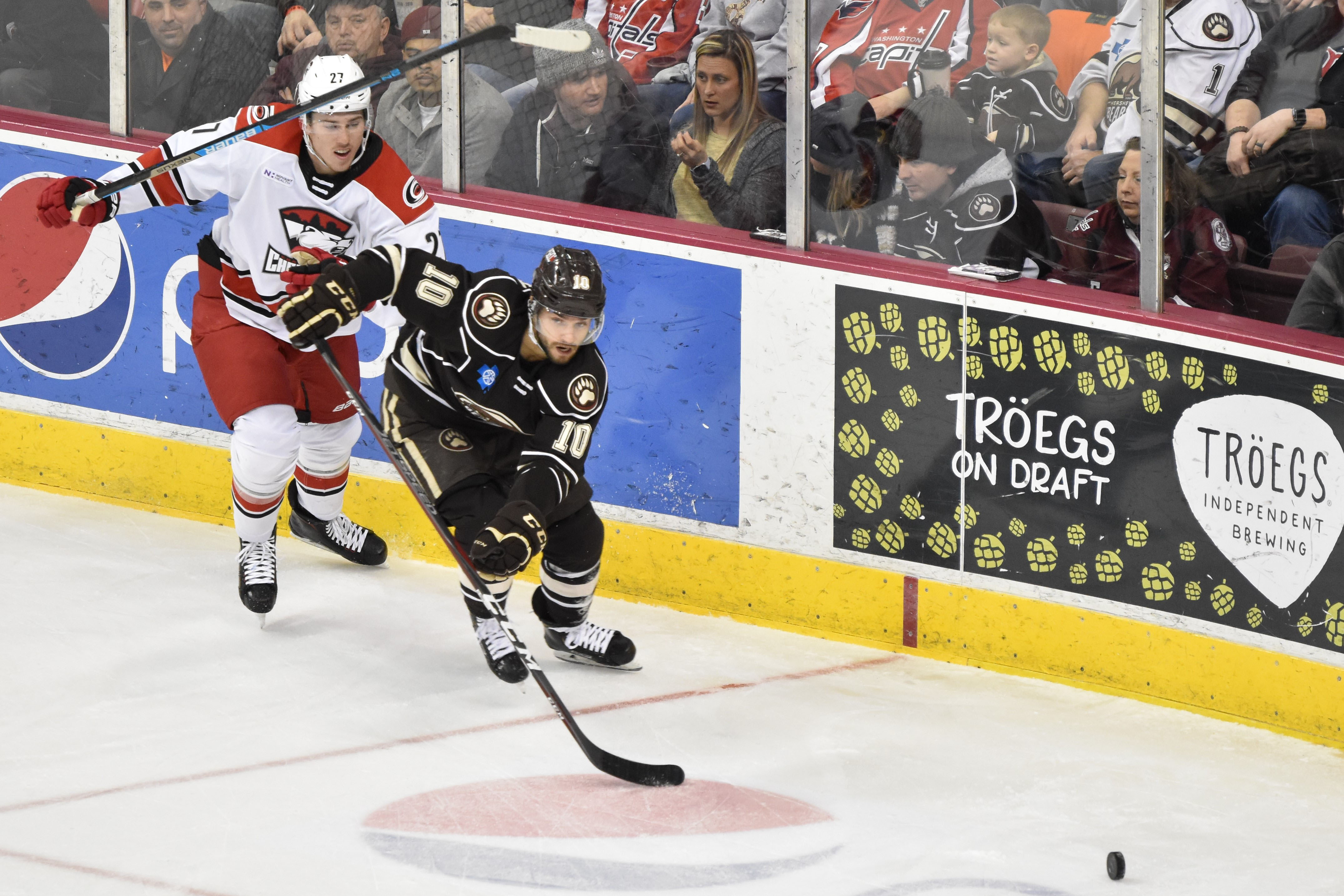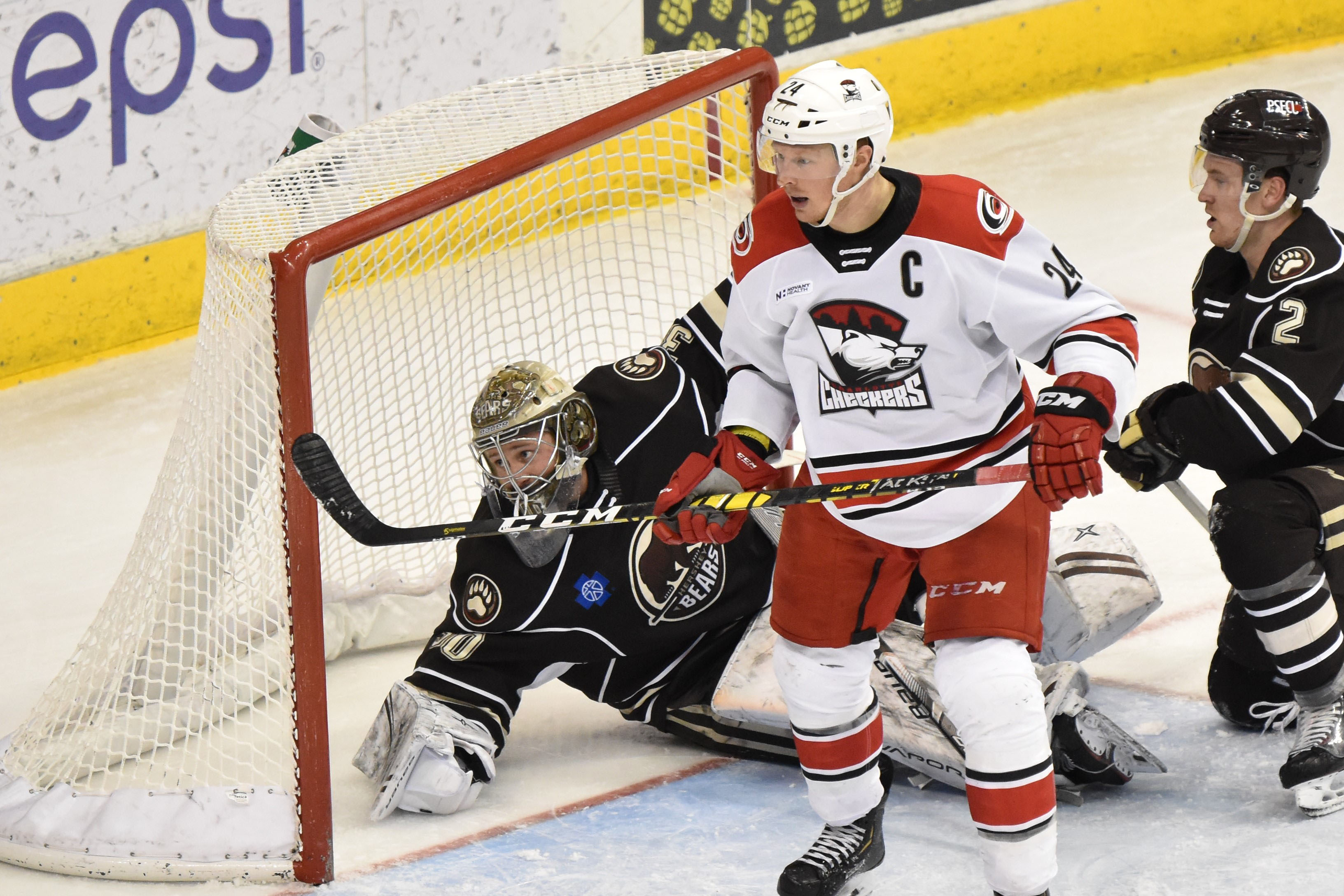Into the third period, the Checkers grabbed a late 2-1 lead courtesy of another special teams goal. On Hershey’s third minor penalty of the frame, Jake Beam took advantage and blasted his 10th goal of the season at 12:48. In the final two minutes, Vanecek vacated the Bears net in favor of the extra attacker. Barber sent a crowd of 9,182 at Giant Center into a frenzy with his 20th goal of the season in a clutch moment.