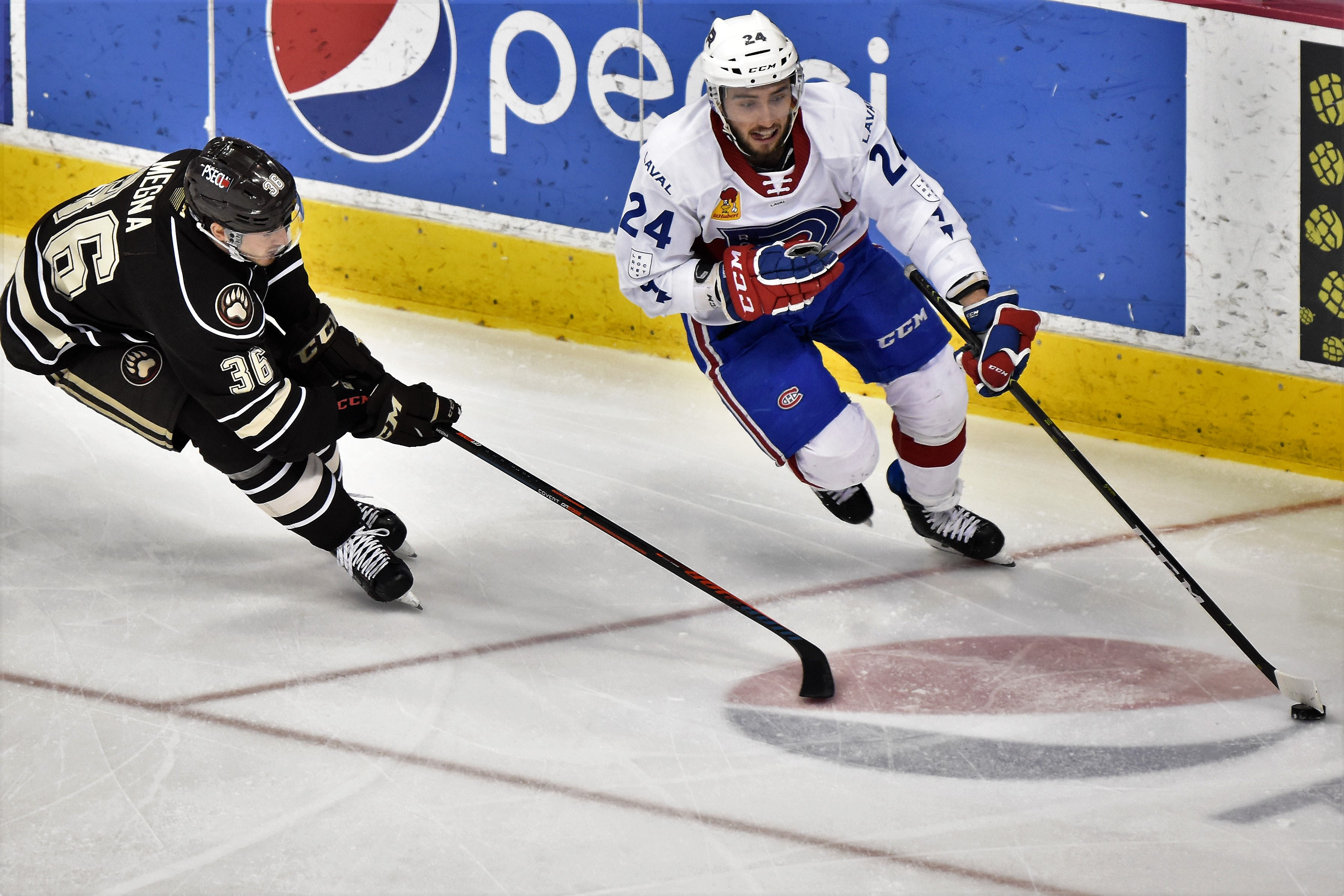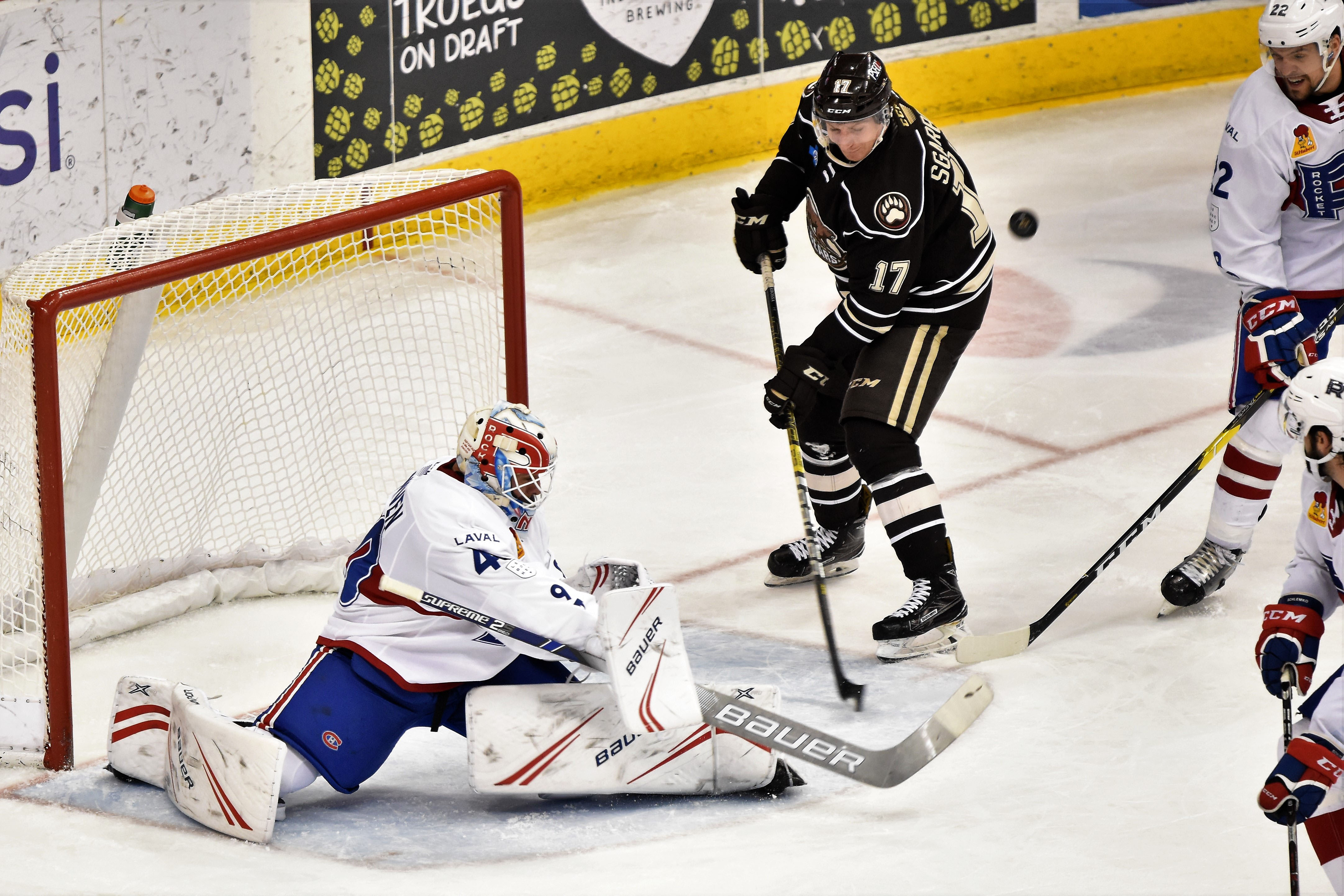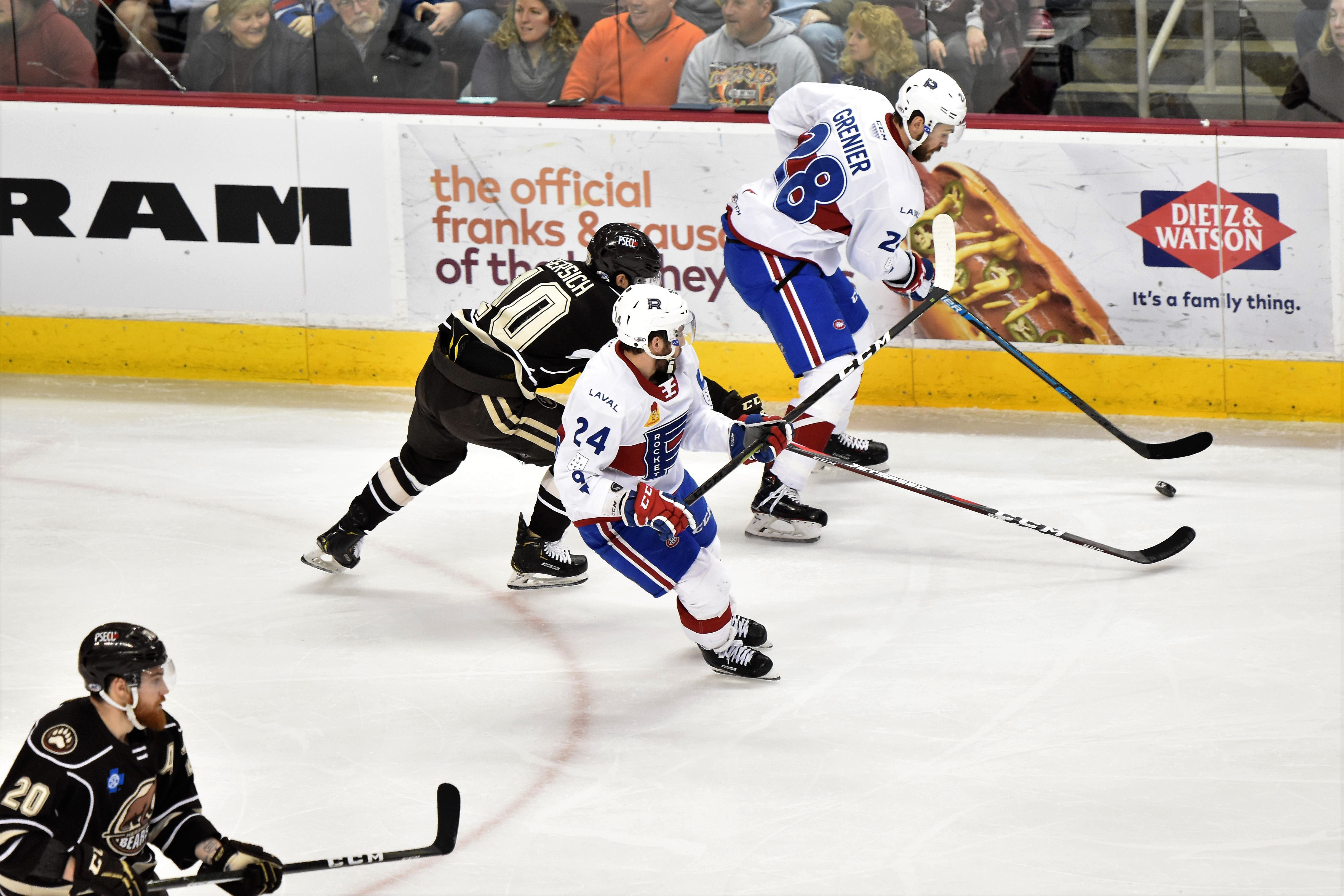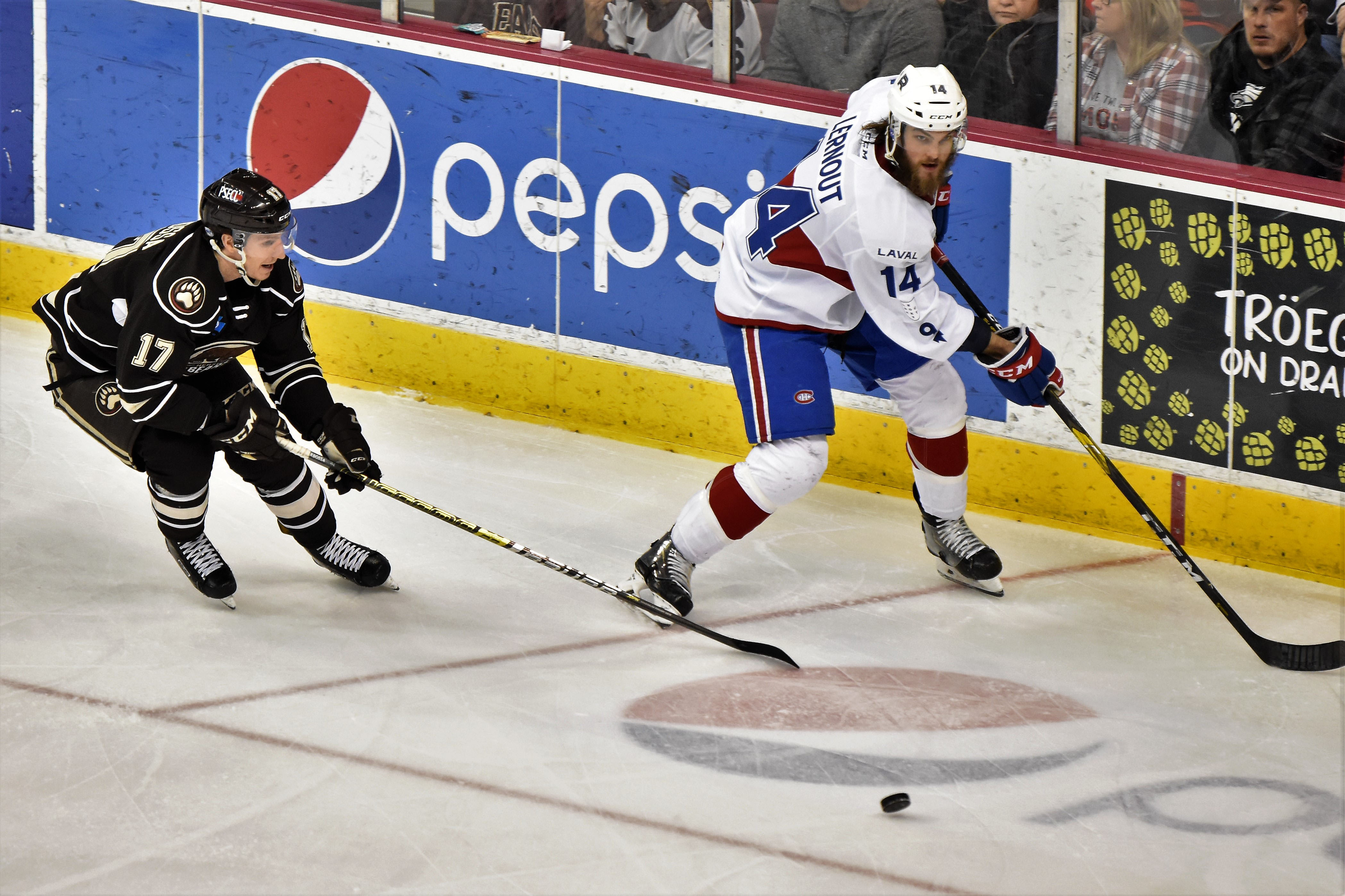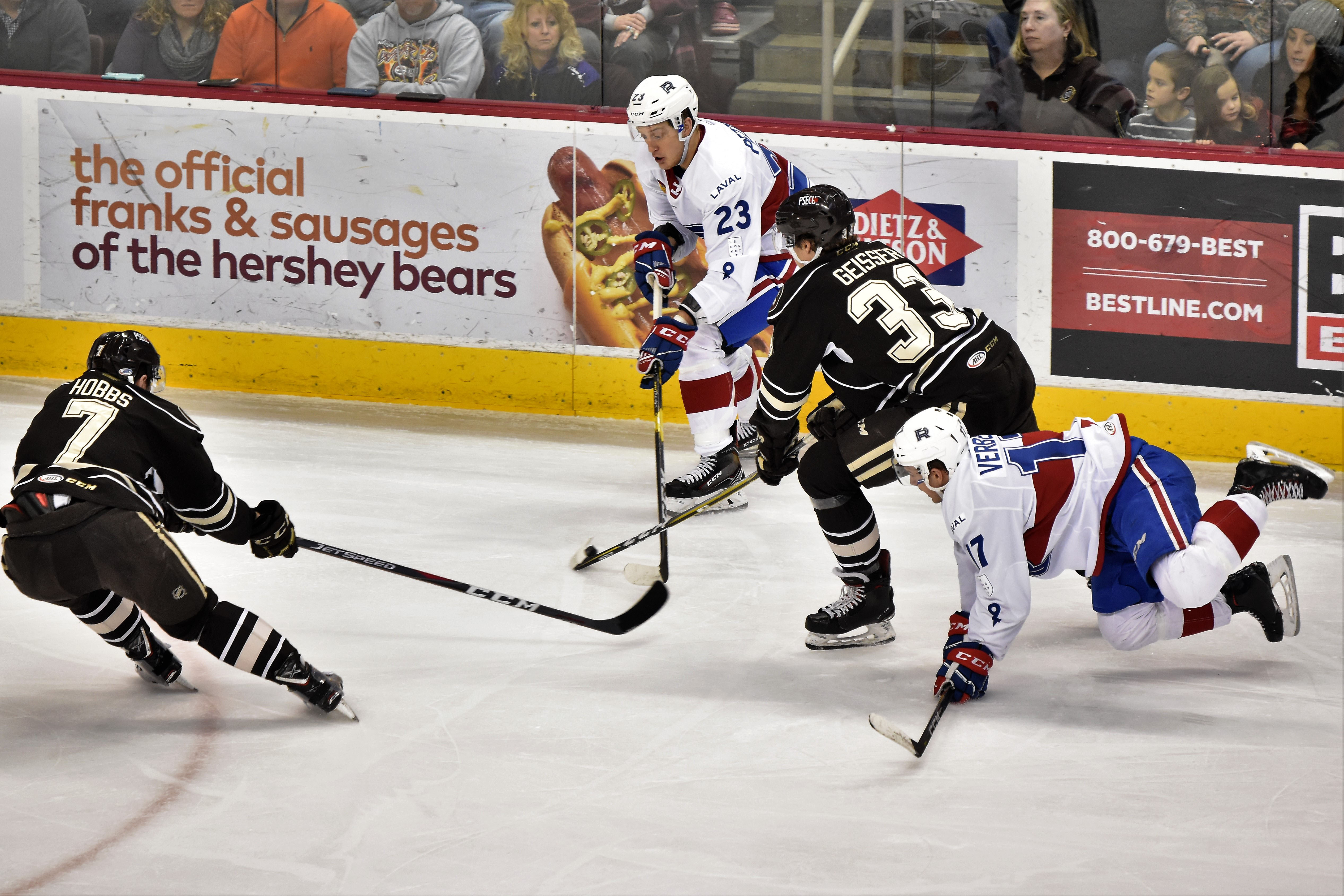 Laval began their comeback attempt at 14:49 after winning an offensive zone face-off. David Schlemko scored his first goal of the season after snapping a shot from the left point through Vitek Vanecek’s five-hole. Shots after 40 minutes were 25-16 Hershey with a 3-1 advantage in hand.