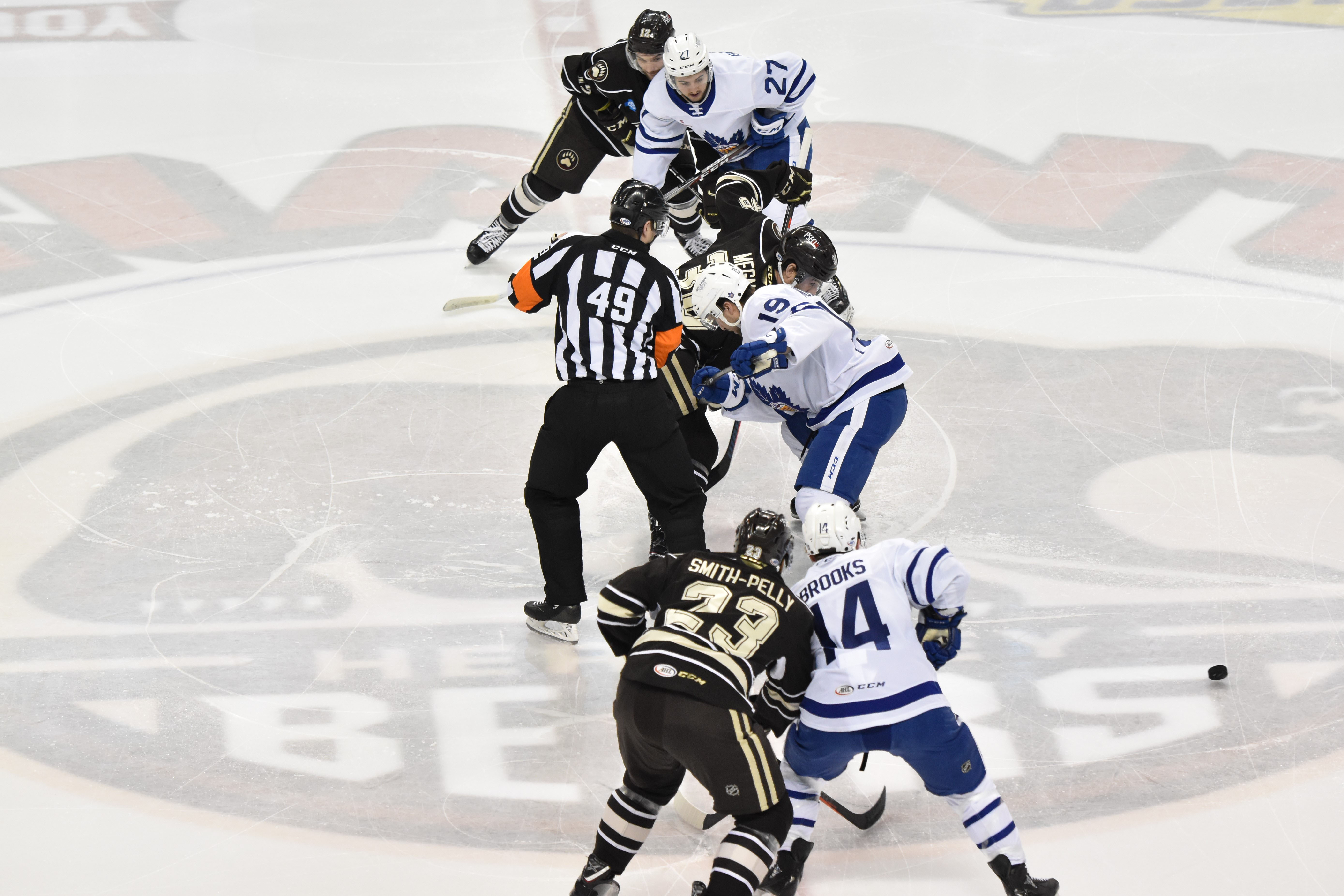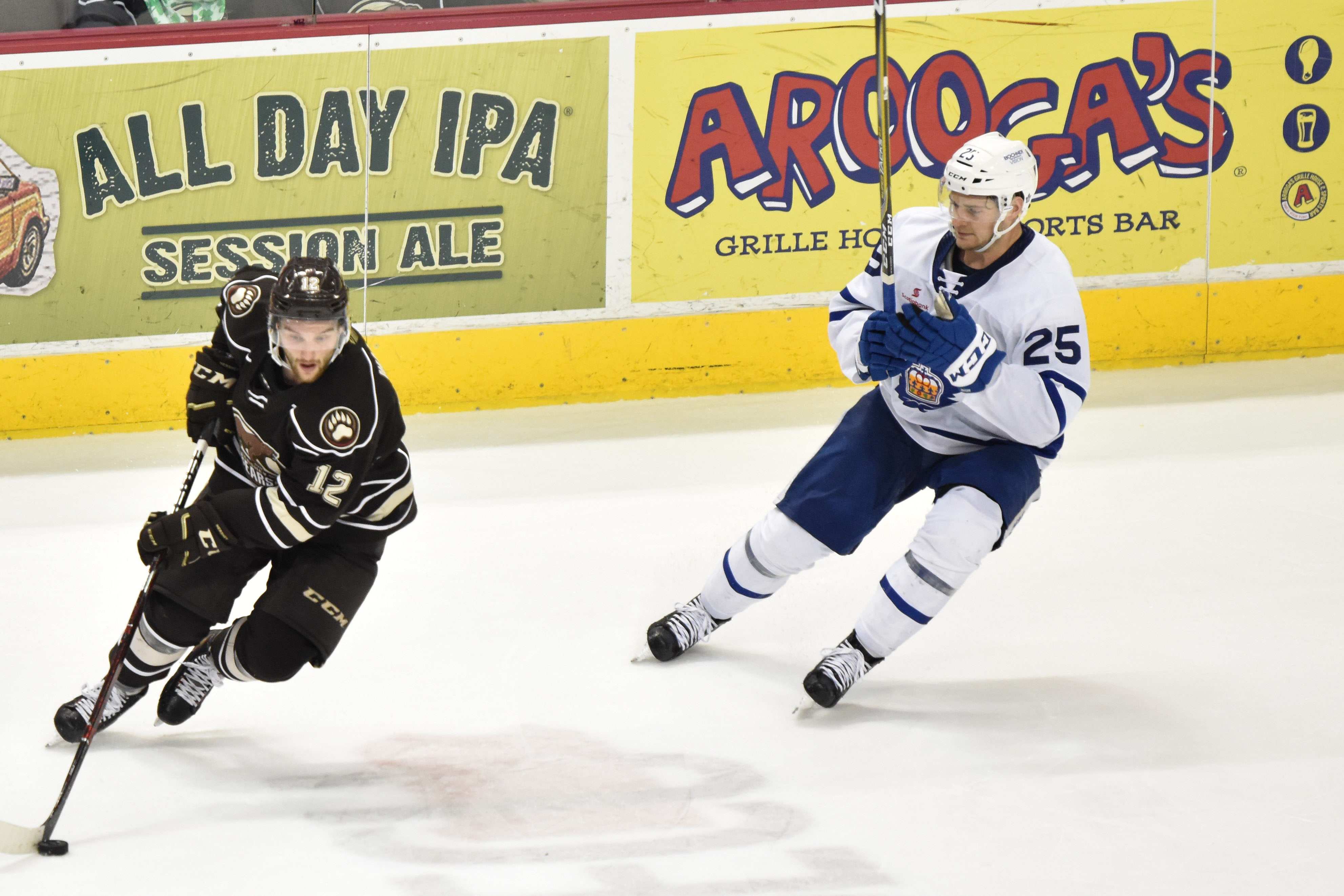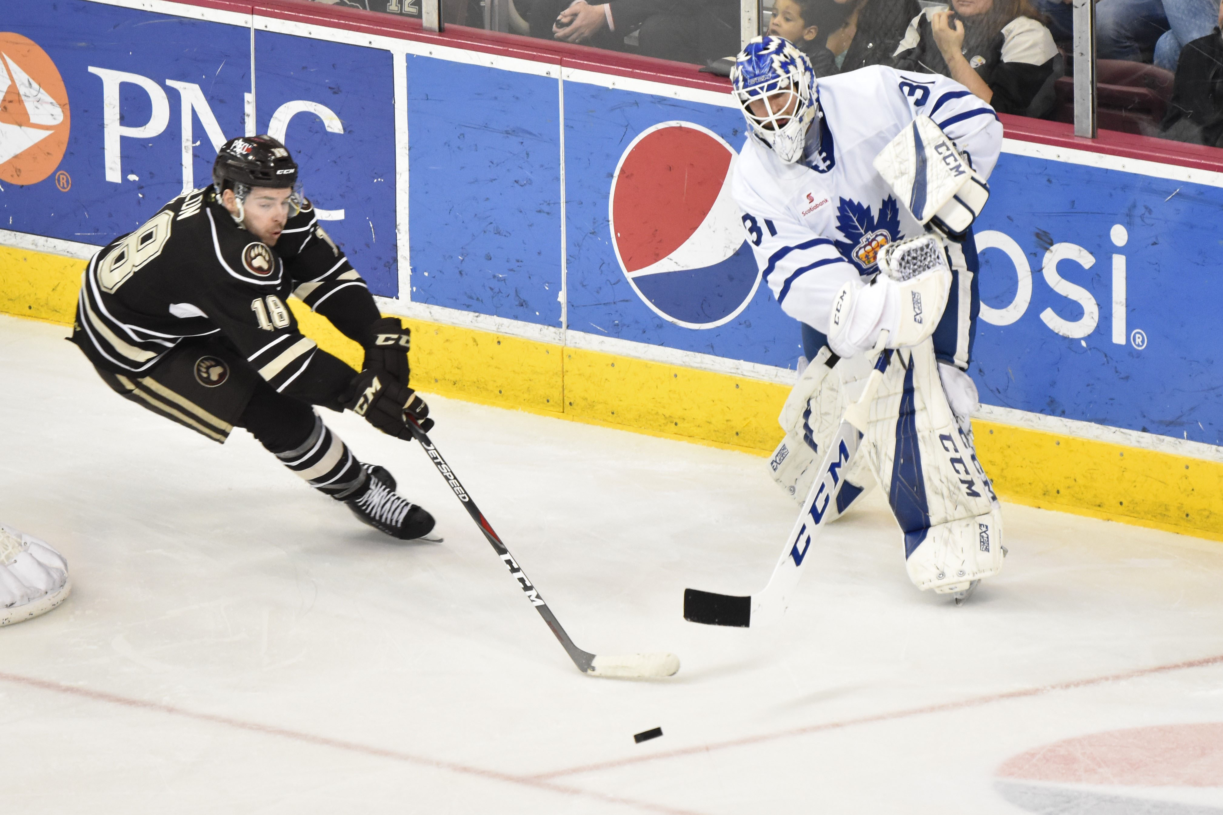 After a scoreless opening stanza where the Bears went 3-for-3 on the penalty kill, both teams exploded for six combined goals in the second period. Riley Barber was whistled for tripping at 7:03, and Adam Brooks capitalized on Toronto’s fifth power play chance of the game. Brooks buried a centering pass in the slot from Chris Mueller for his 17th goal of the season only 25 seconds after Barber’s penalty.
