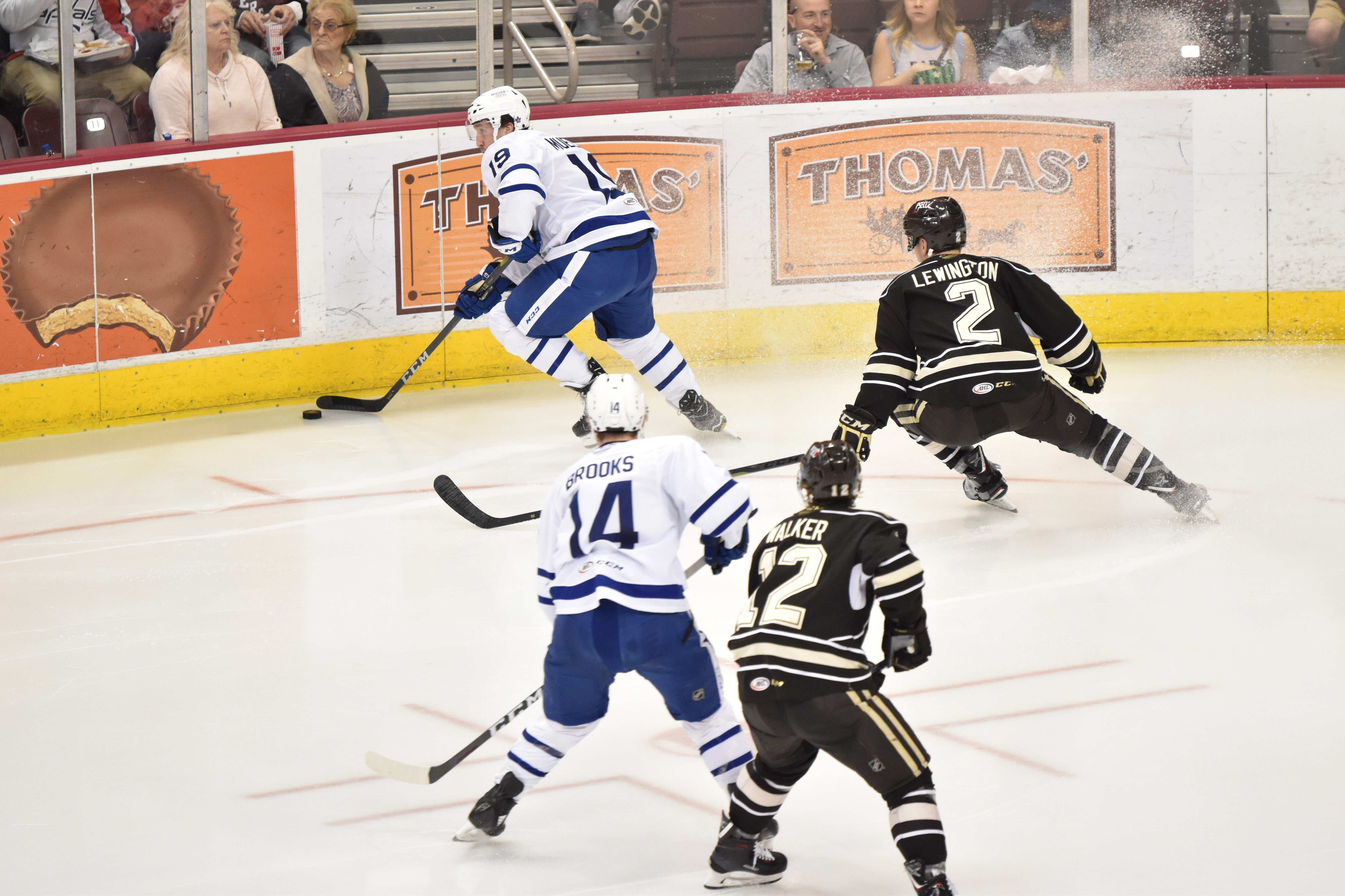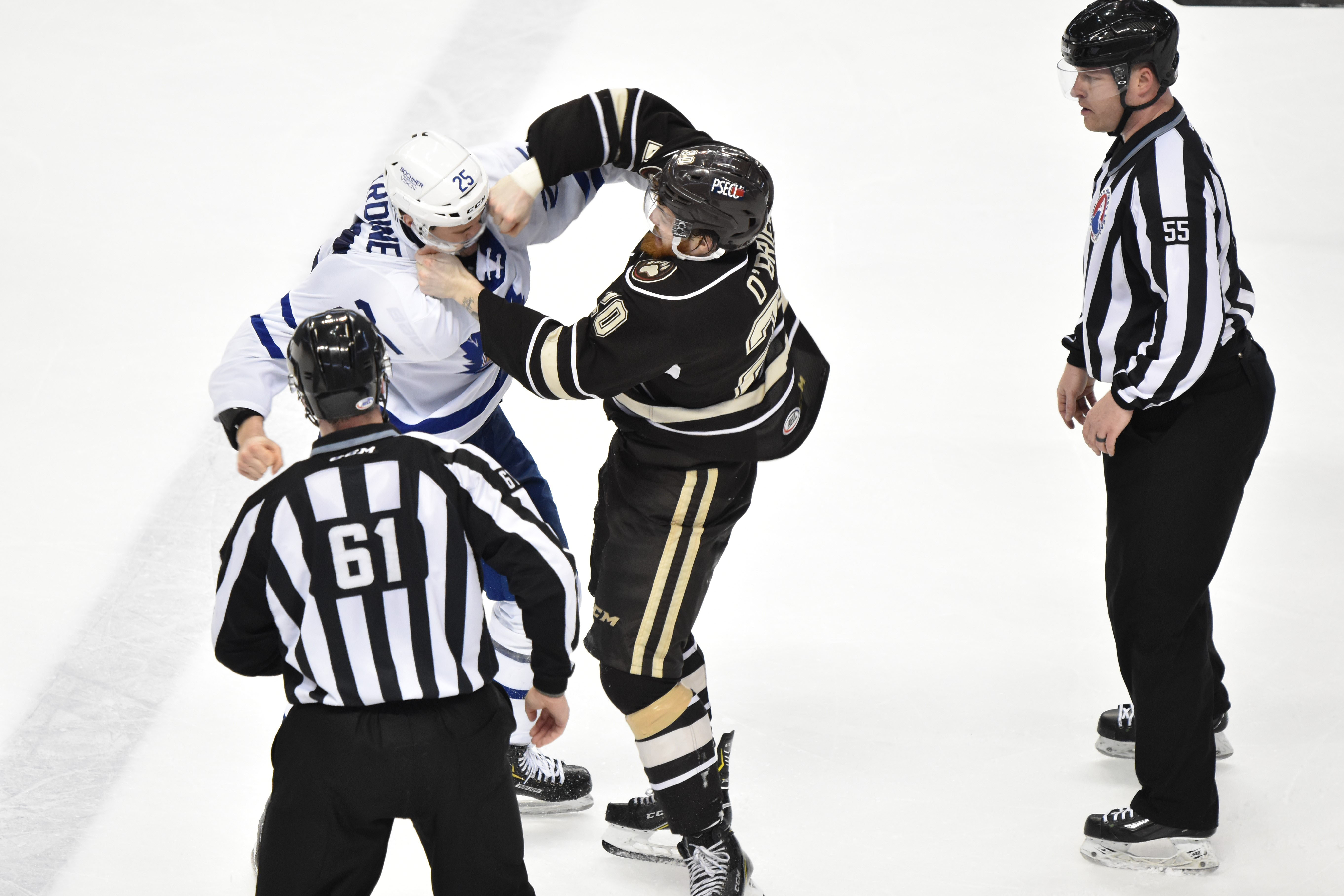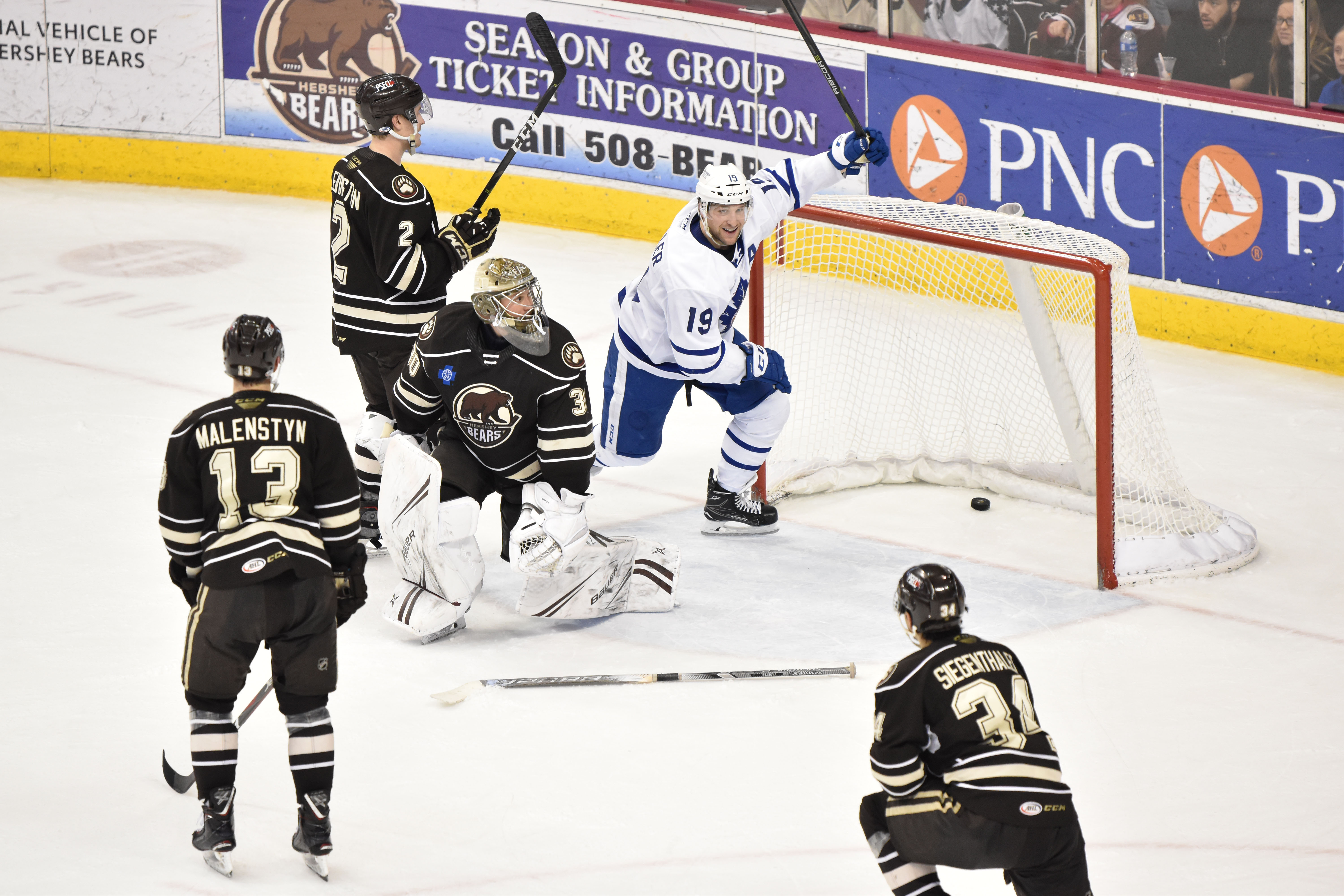 After a scoreless opening stanza where the Bears went 3-for-3 on the penalty kill, both teams exploded for six combined goals in the second period. Riley Barber was whistled for tripping at 7:03, and Adam Brooks capitalized on Toronto’s fifth power play chance of the game. Brooks buried a centering pass in the slot from Chris Mueller for his 17th goal of the season only 25 seconds after Barber’s penalty.