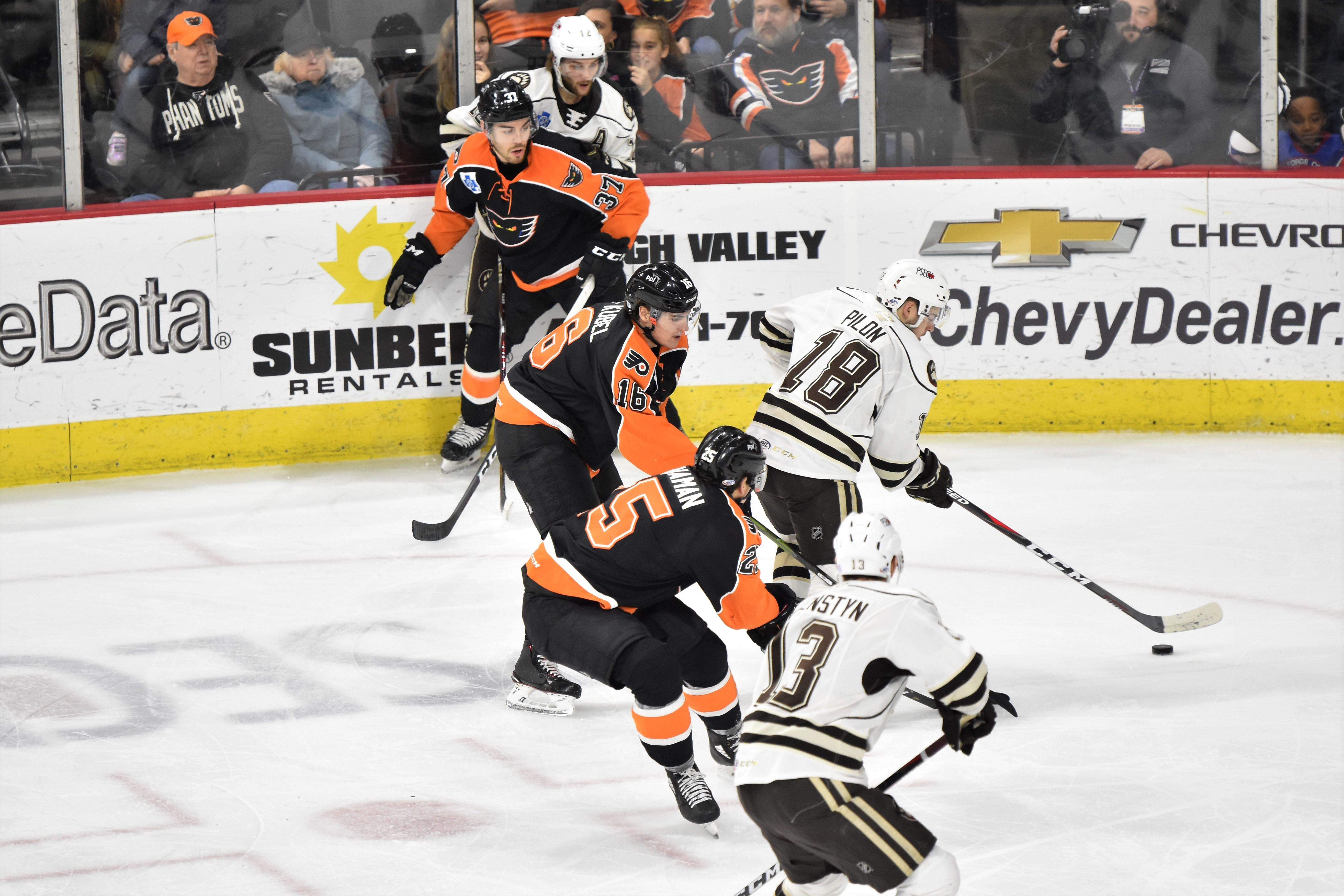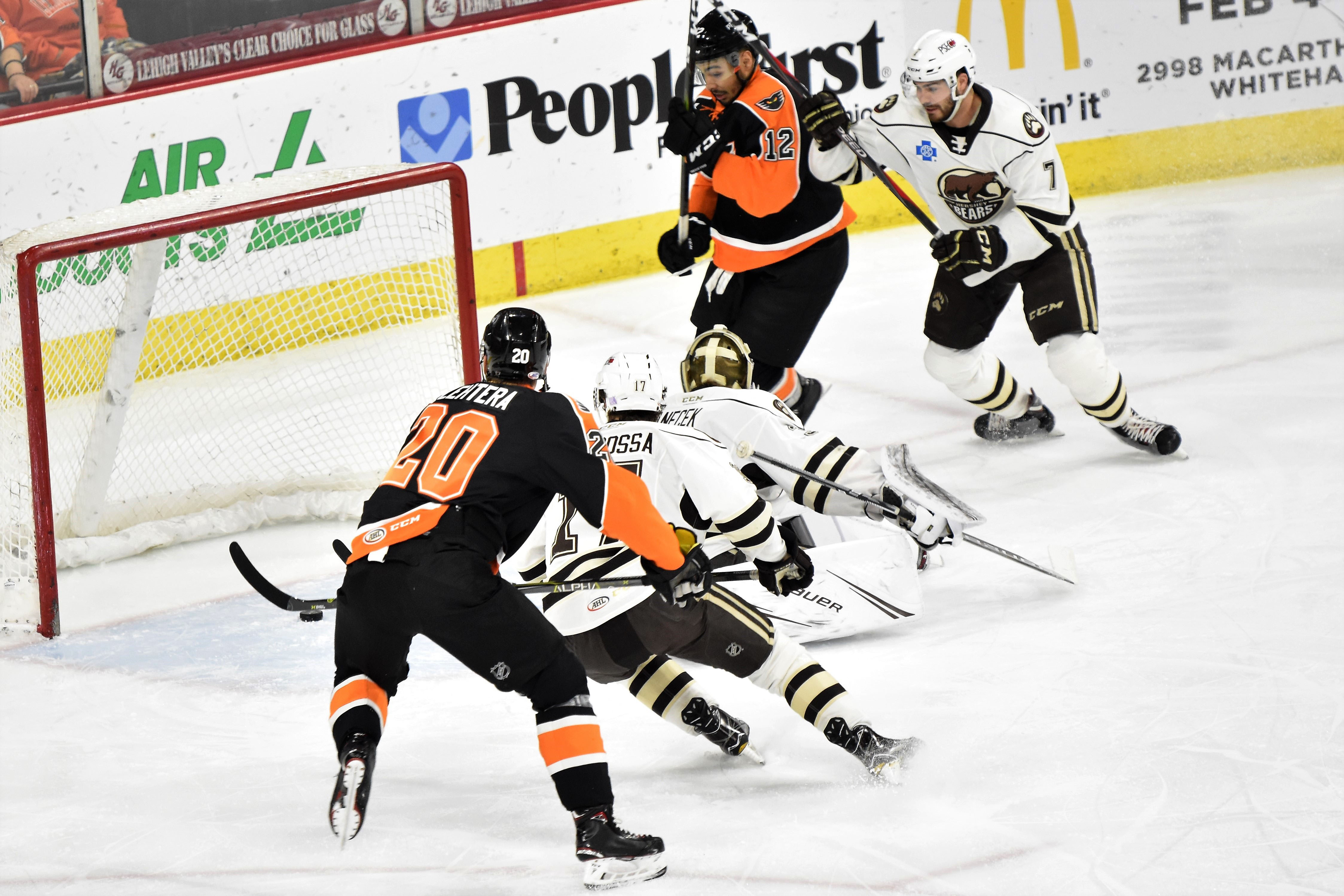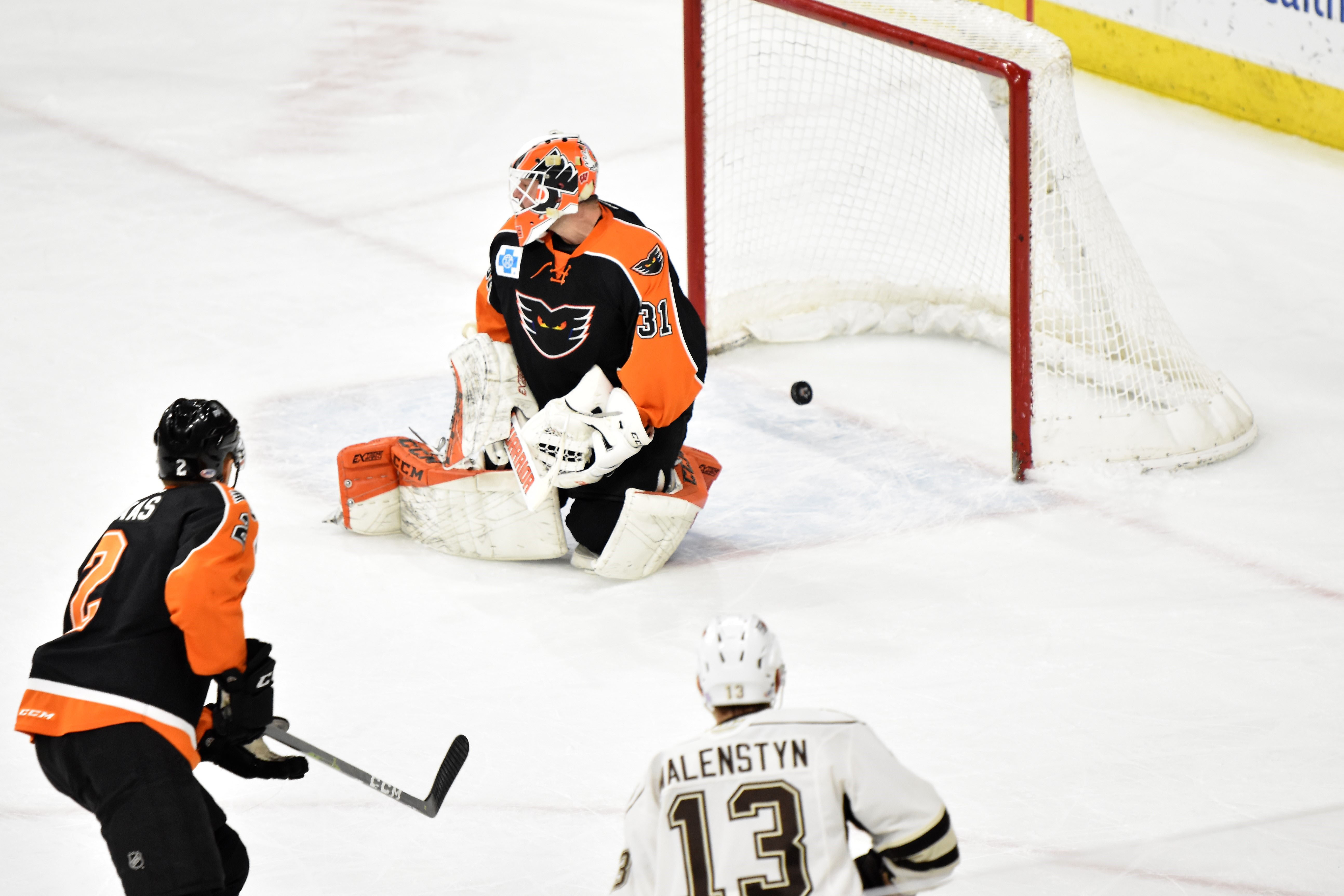 For the second straight night, the Phantoms drew first blood, but the Bears rallied right back. Only 7:38 in, Tyrell Goulbourne opened the scoring on a rebound after depositing a Jori Lehtera shot past Vitek Vanecek inside the blue paint. Before the period came to a close, Malenstyn scored twice on 2-time NHL All-Star goaltender Brian Elliott. First at 13:52, Malenstyn redirected a Ryan Sproul shot through the five-hole of Elliott.