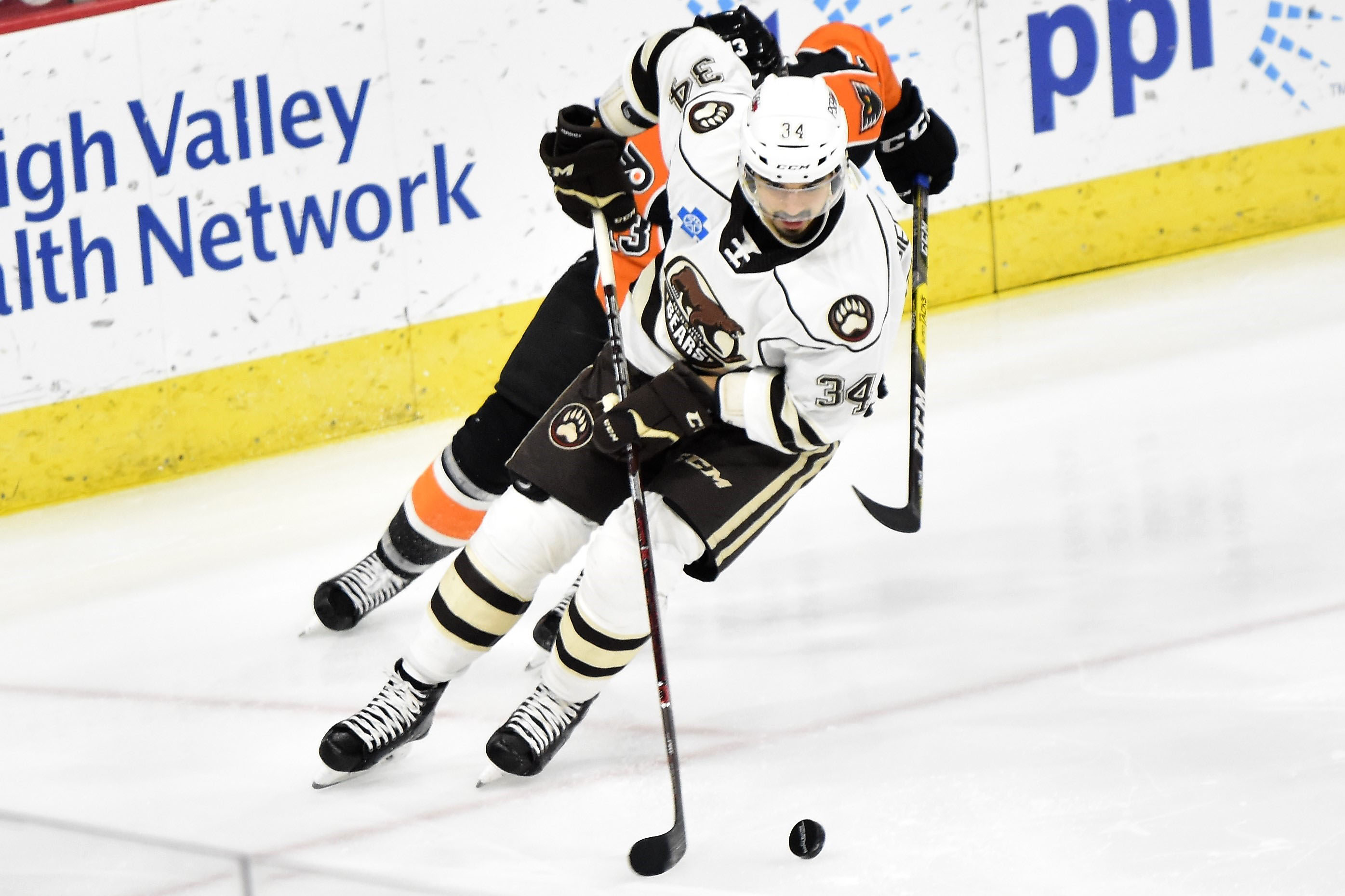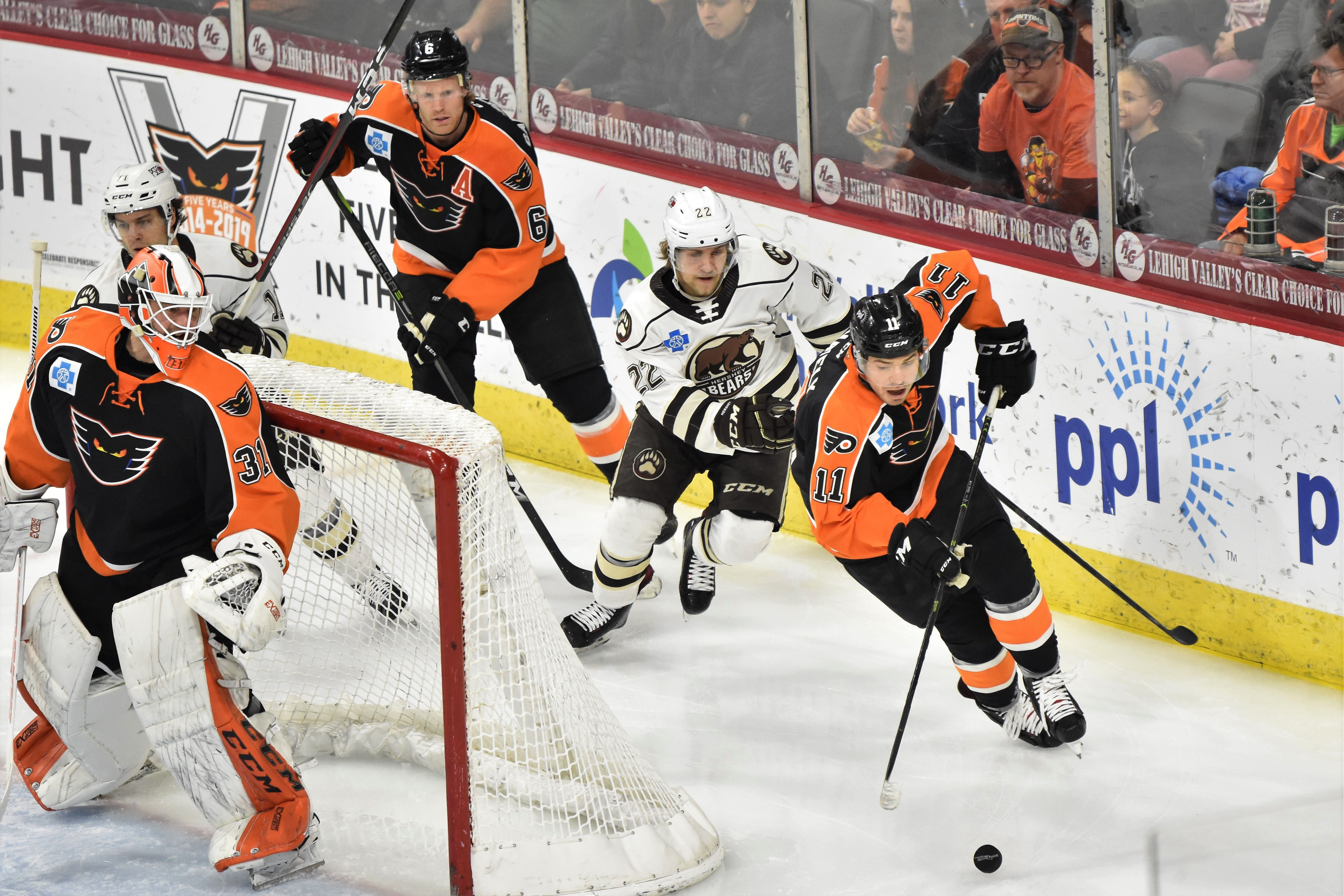 Lehigh Valley pushed in the third period to chip their deficit to one goal, but the Bears successfully hung on for a 4-3 final. Nicolas Aube-Kubel tallied at 2:07, and Mikhail Vorobyev brought Lehigh Valley within 4-3 after beating Vitek Vanecek from a sharp angle at 14:37. The Chocolate and White’s record improved to 29-20-0-3 with the victory, and the Bears have rallied their road record to 11-11-0-2