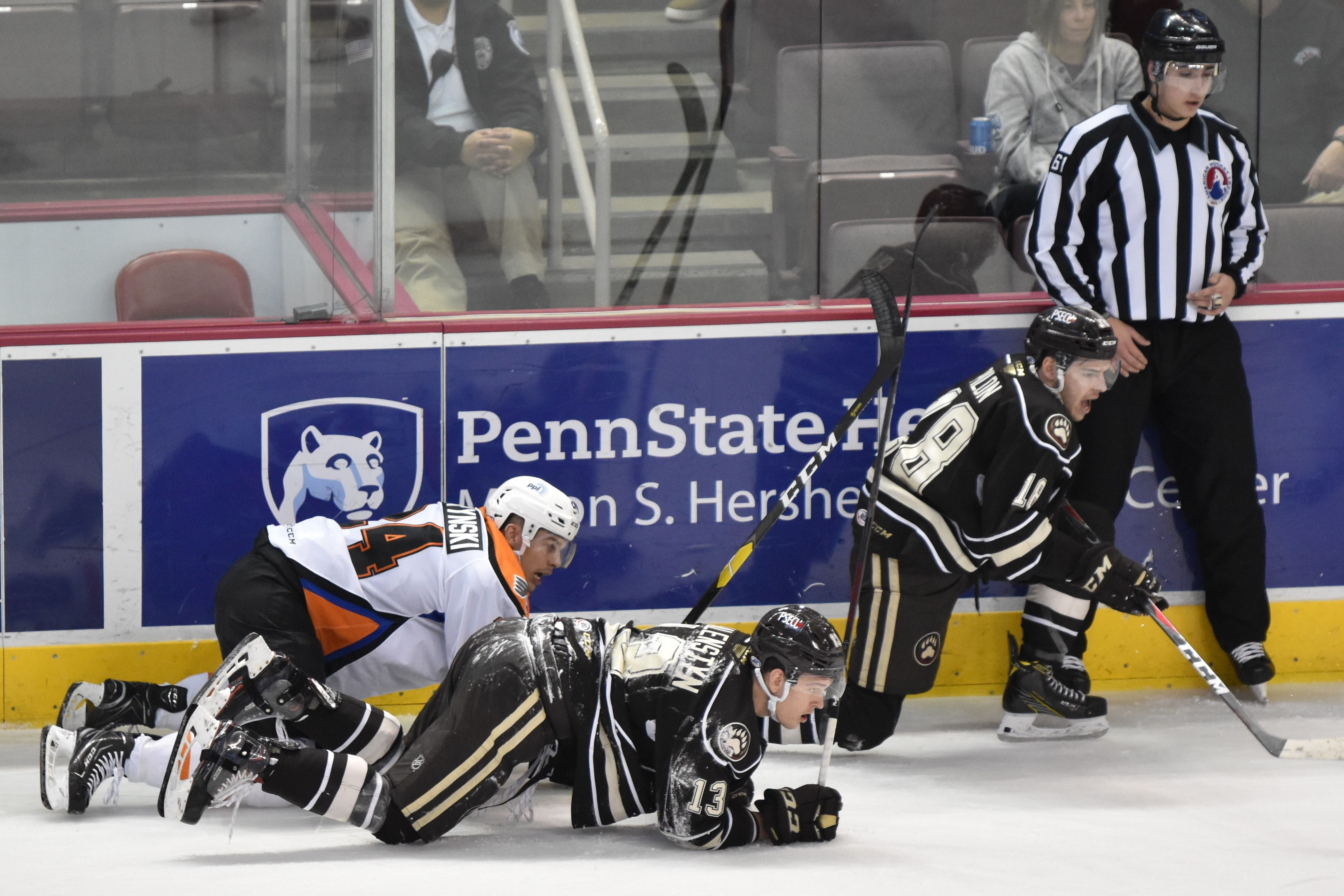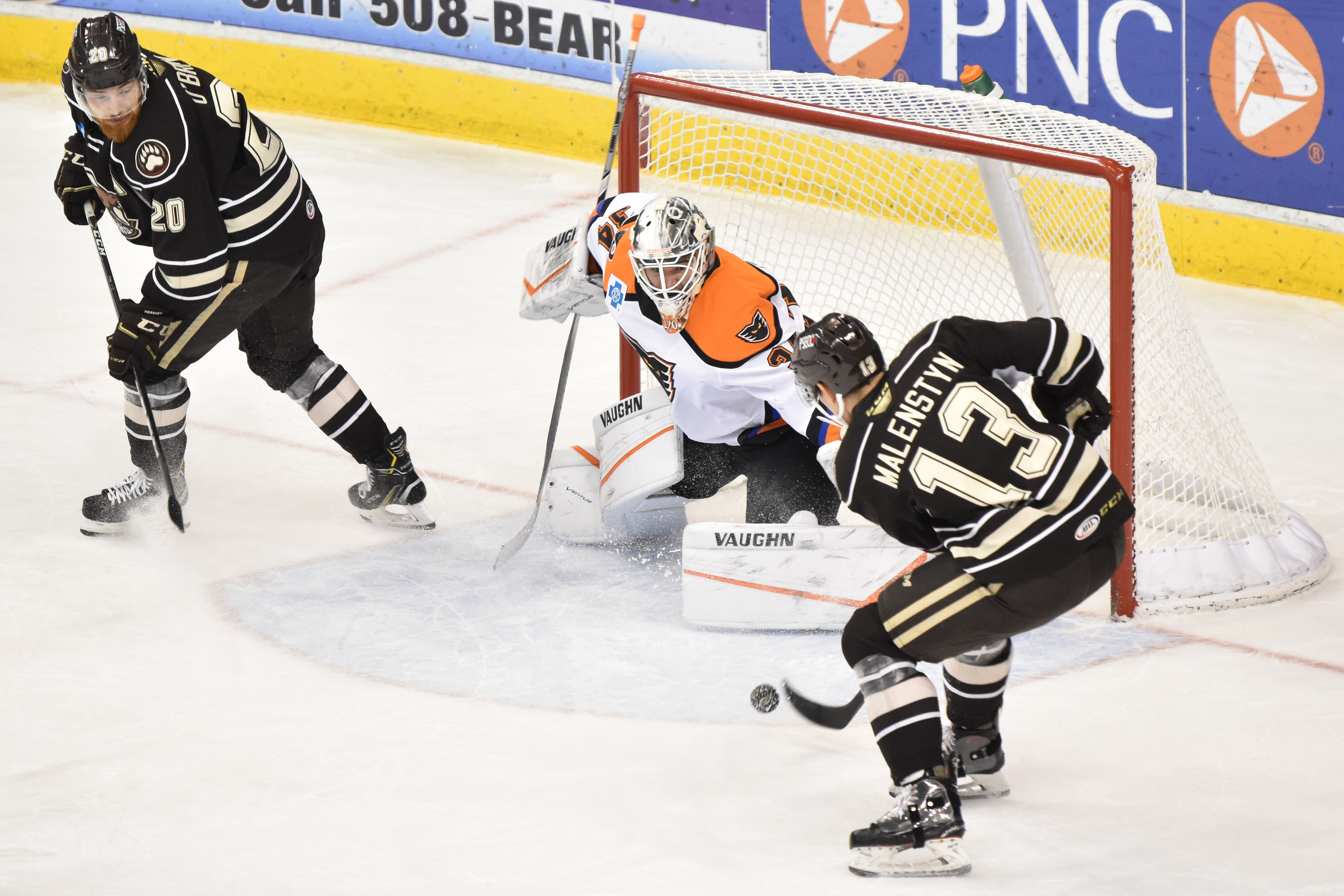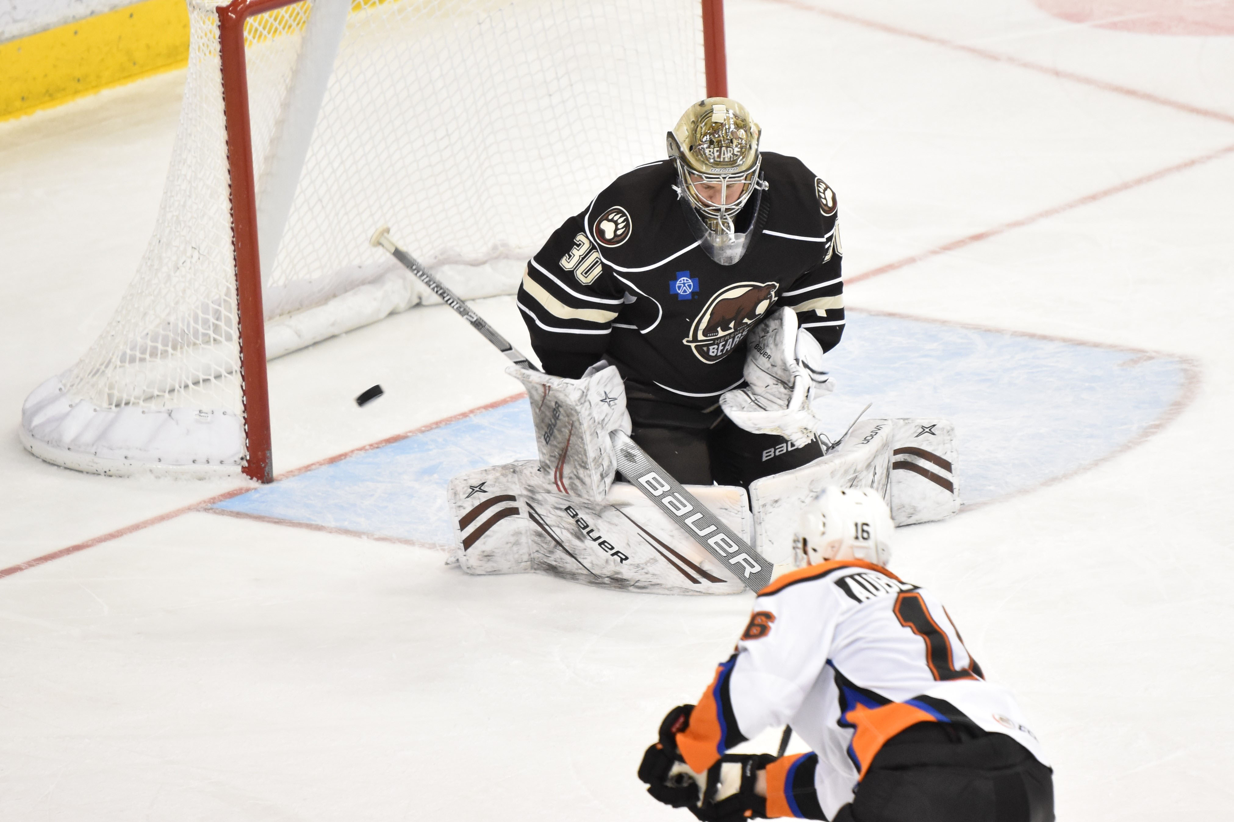 Both teams jumped out of the starting gate with a combined five goals in the opening period. The Bears chased Phantoms goaltender Branden Komm from the game after scoring three times on four shots within 6:36. Nathan Walker started the scoring for the Chocolate and White only 37 seconds in after redirecting a Joey Leach shot from the center point. Leach’s assist marked his first point of the season in his 11th game with the Bears.
