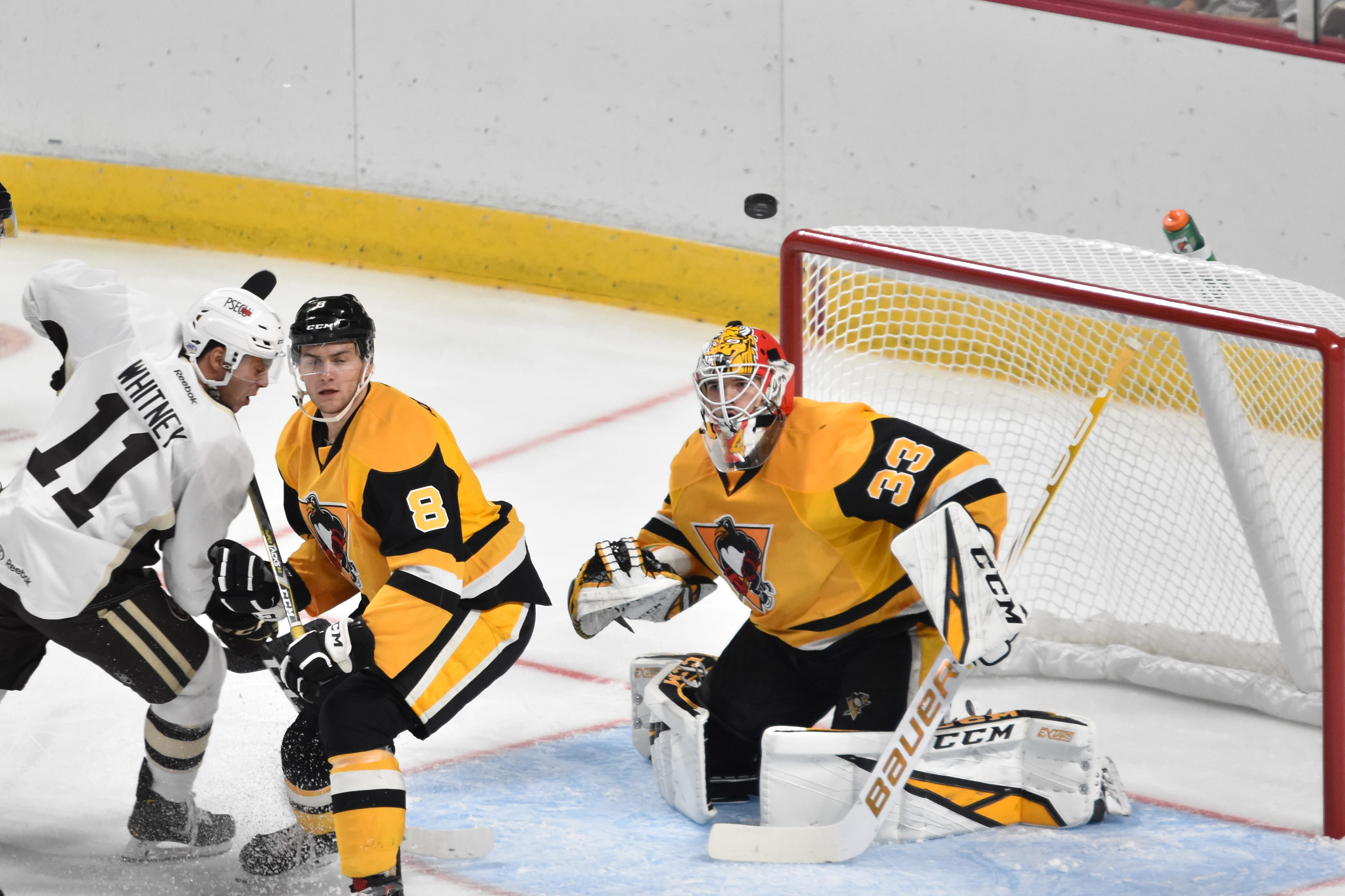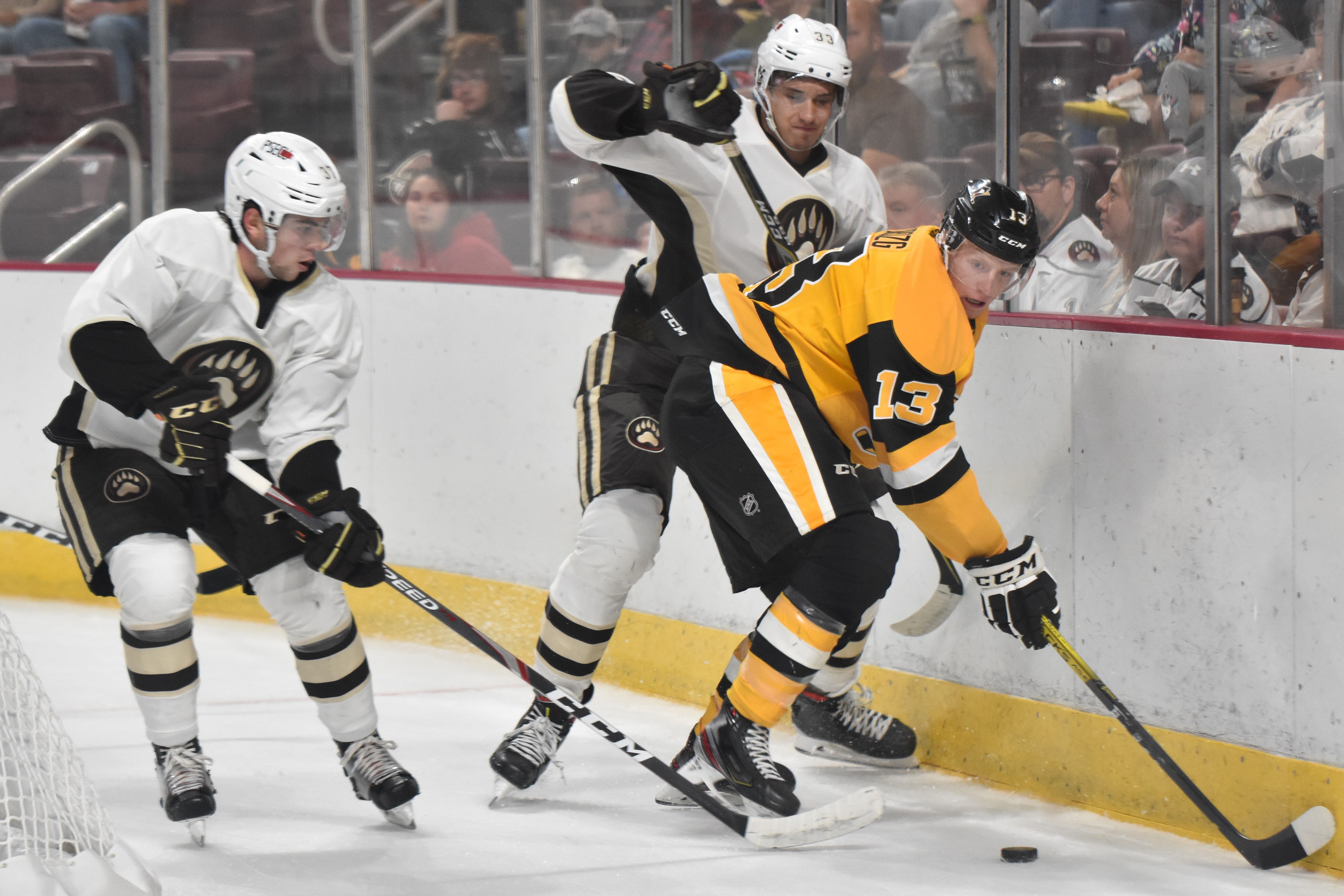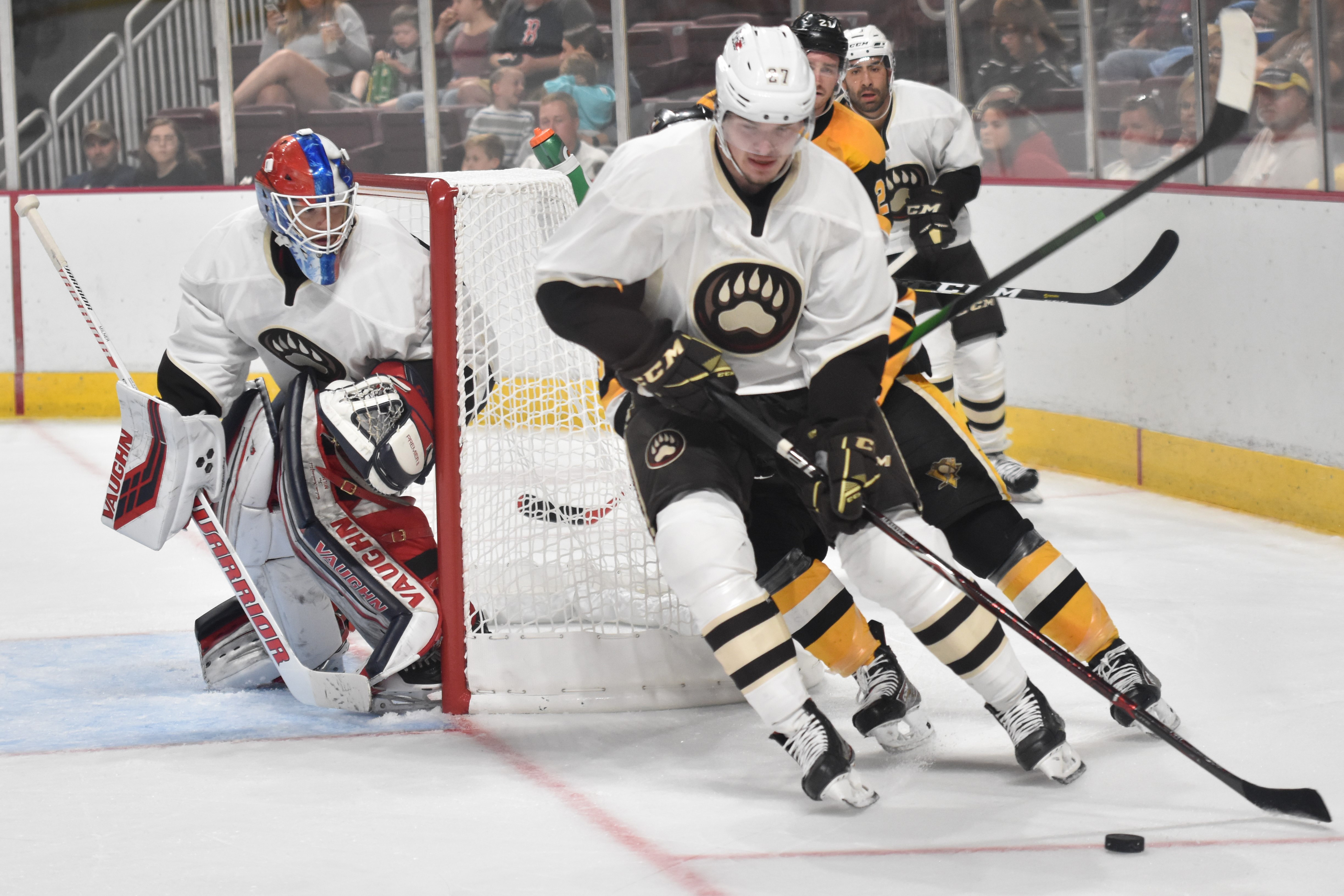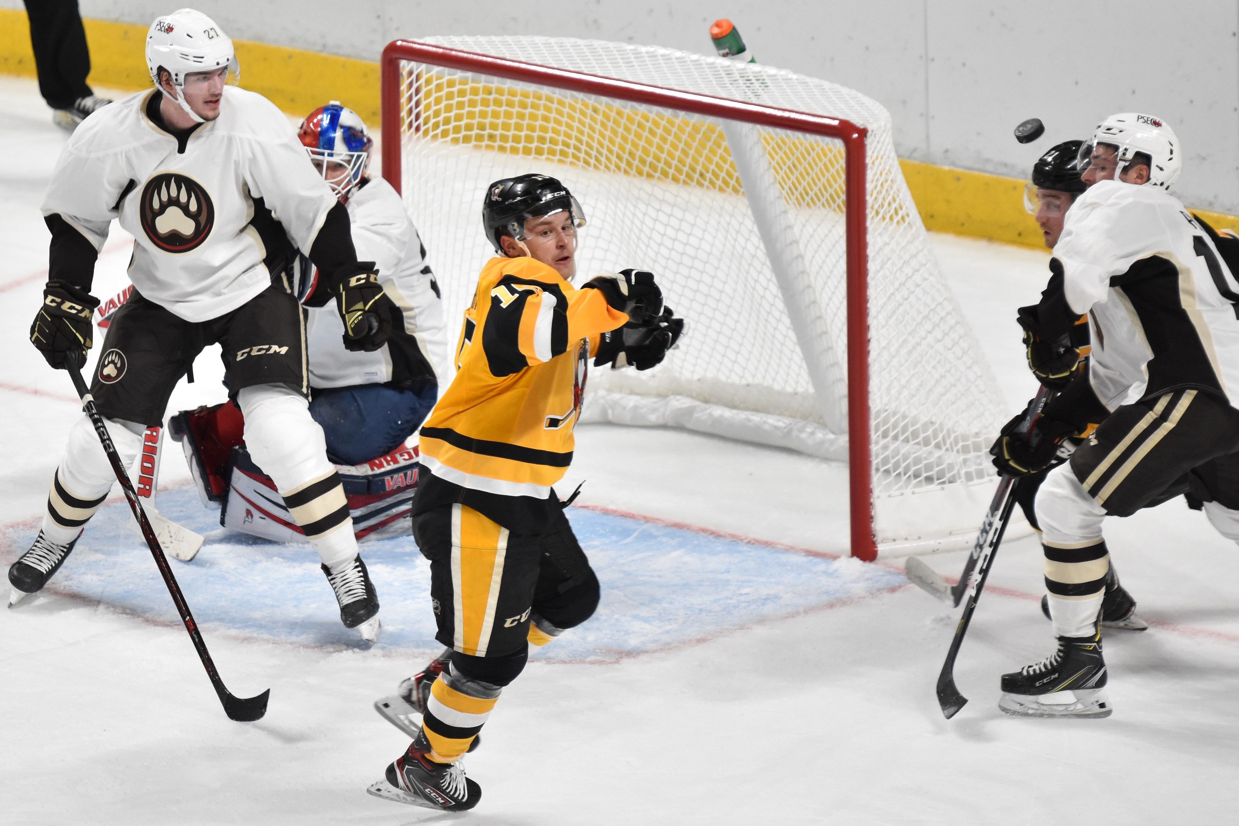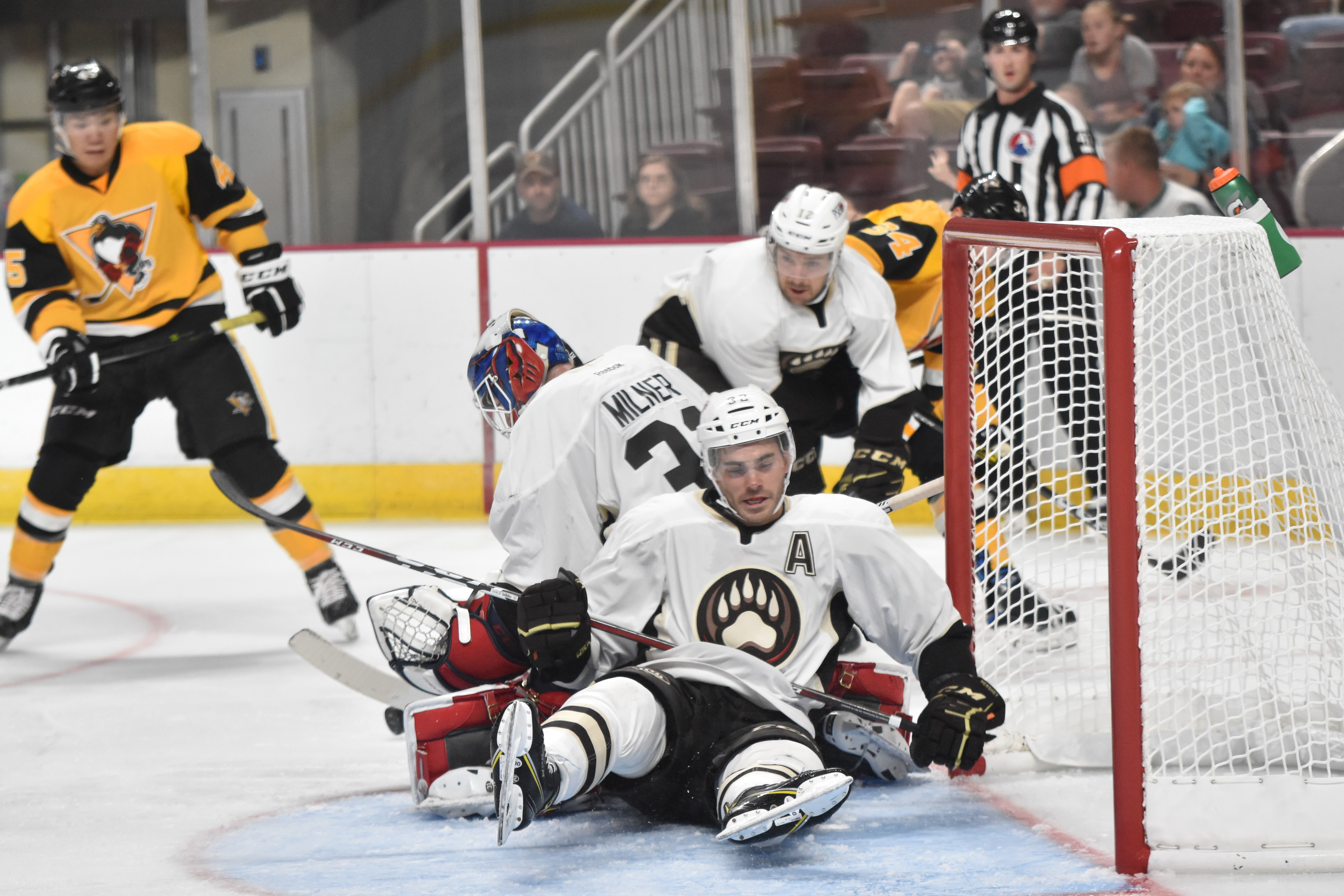 After a scoreless opening frame, the Penguins drew first blood in the final moments of the second period. On a sharp angle shot at 19:50, Kasper Bjorkqvist beat Milner short-side and low to the ice. Shots after 40 minutes were even at 18-18, with the Bears 0-for-2 on the power play and 3-for-3 on the penalty kill.