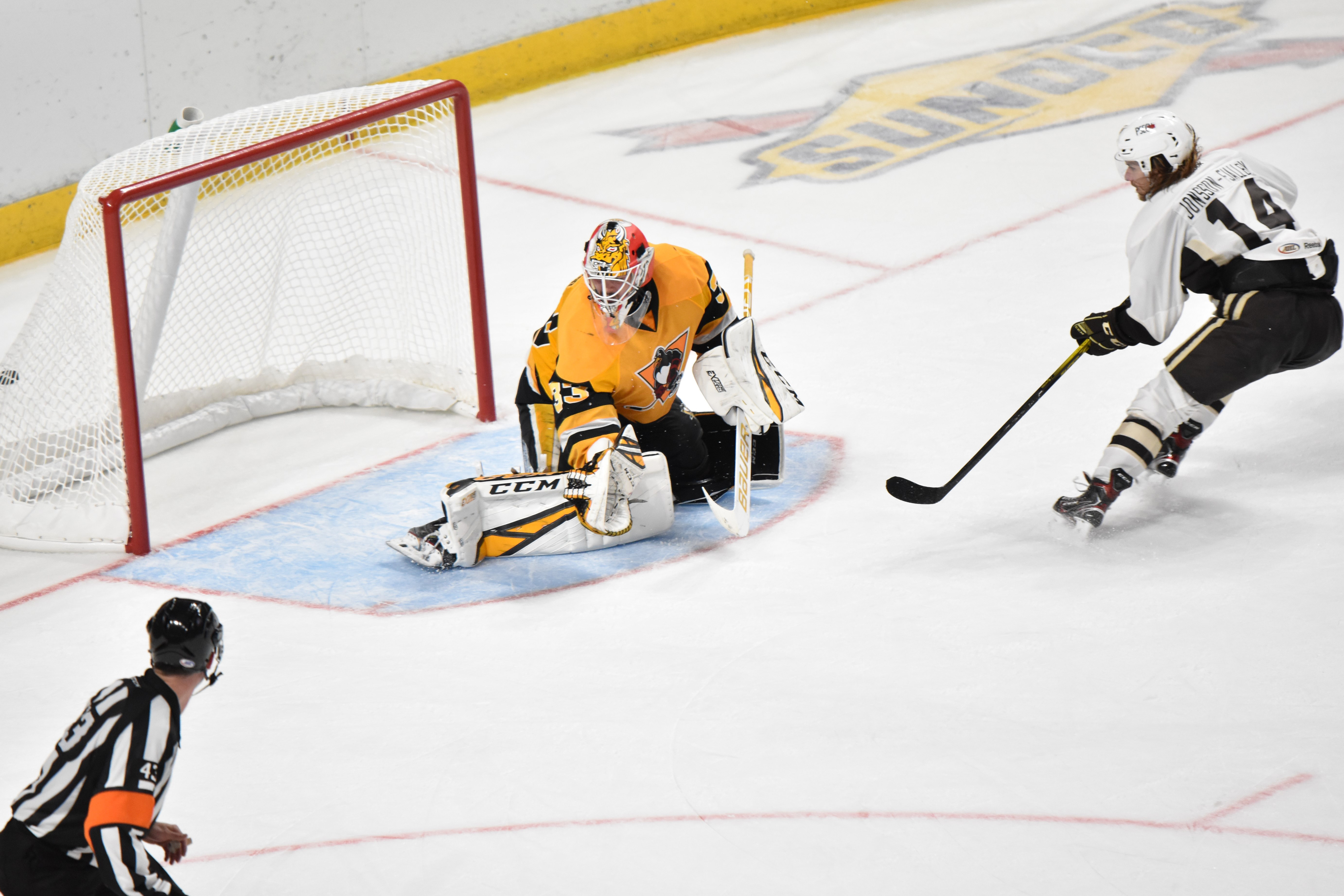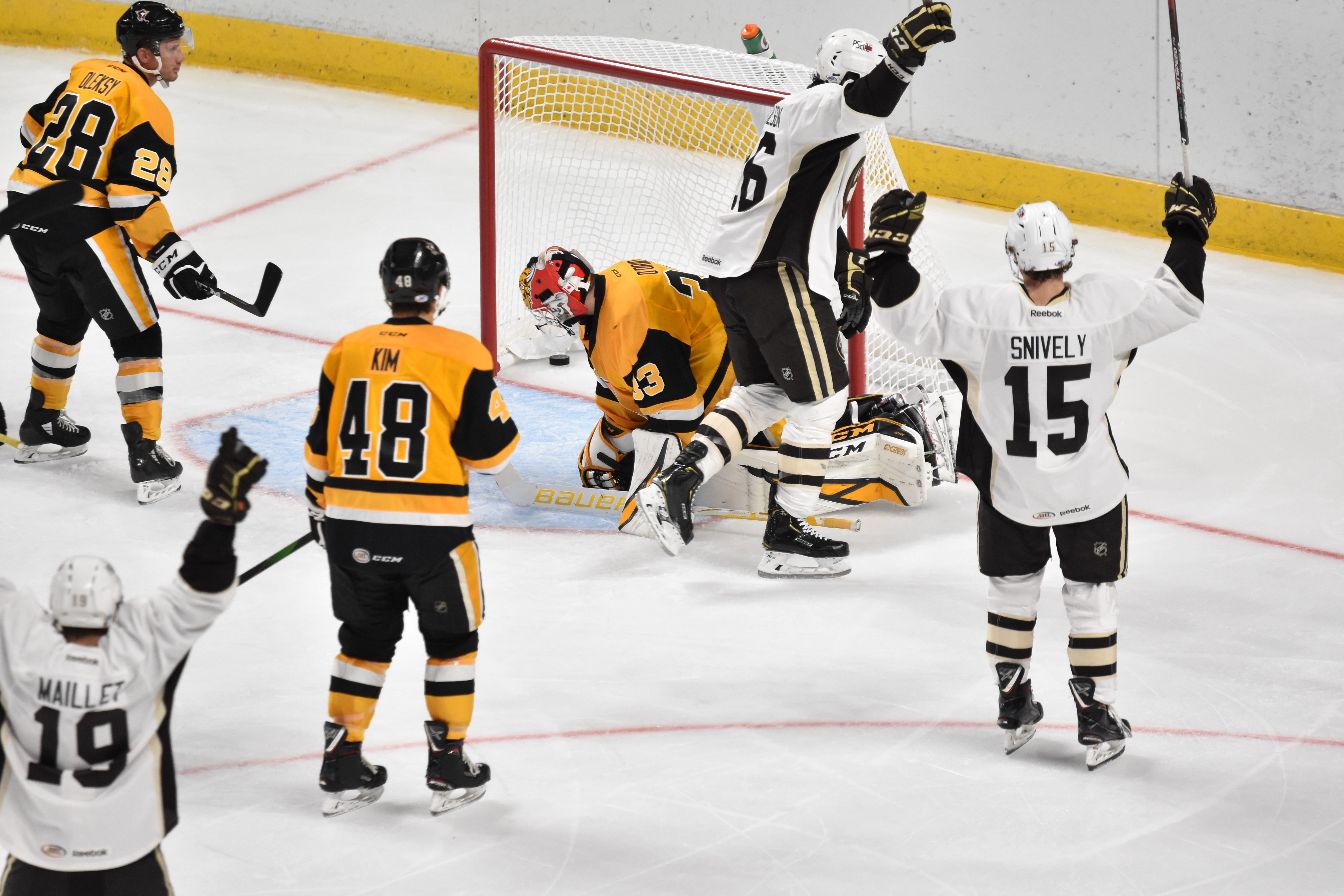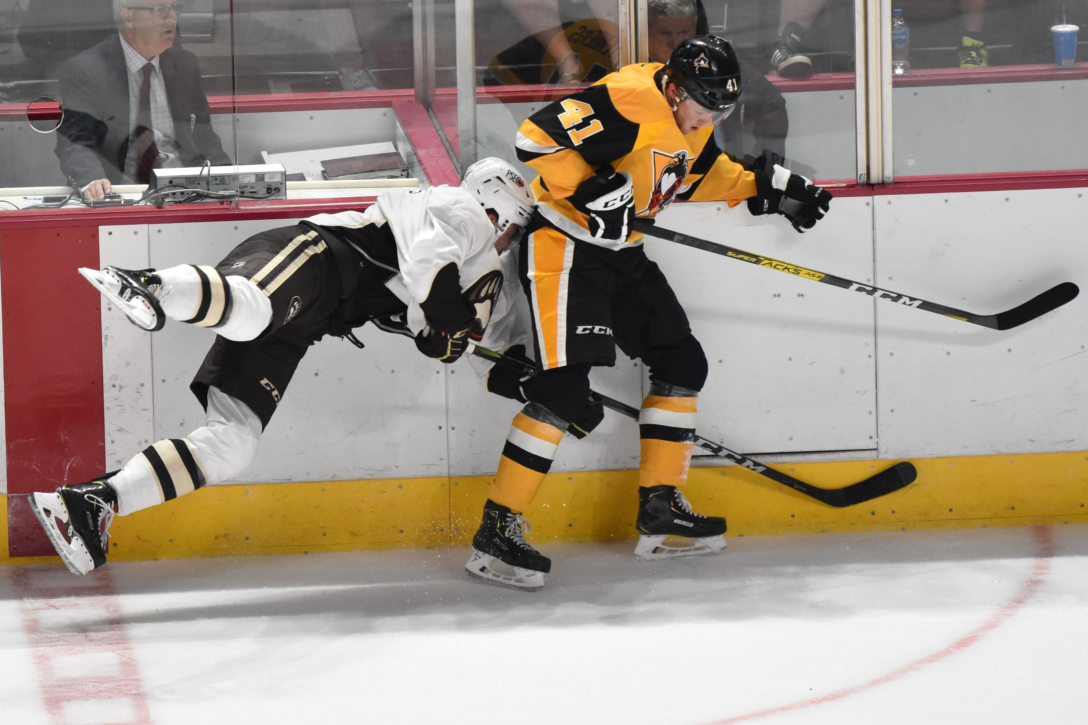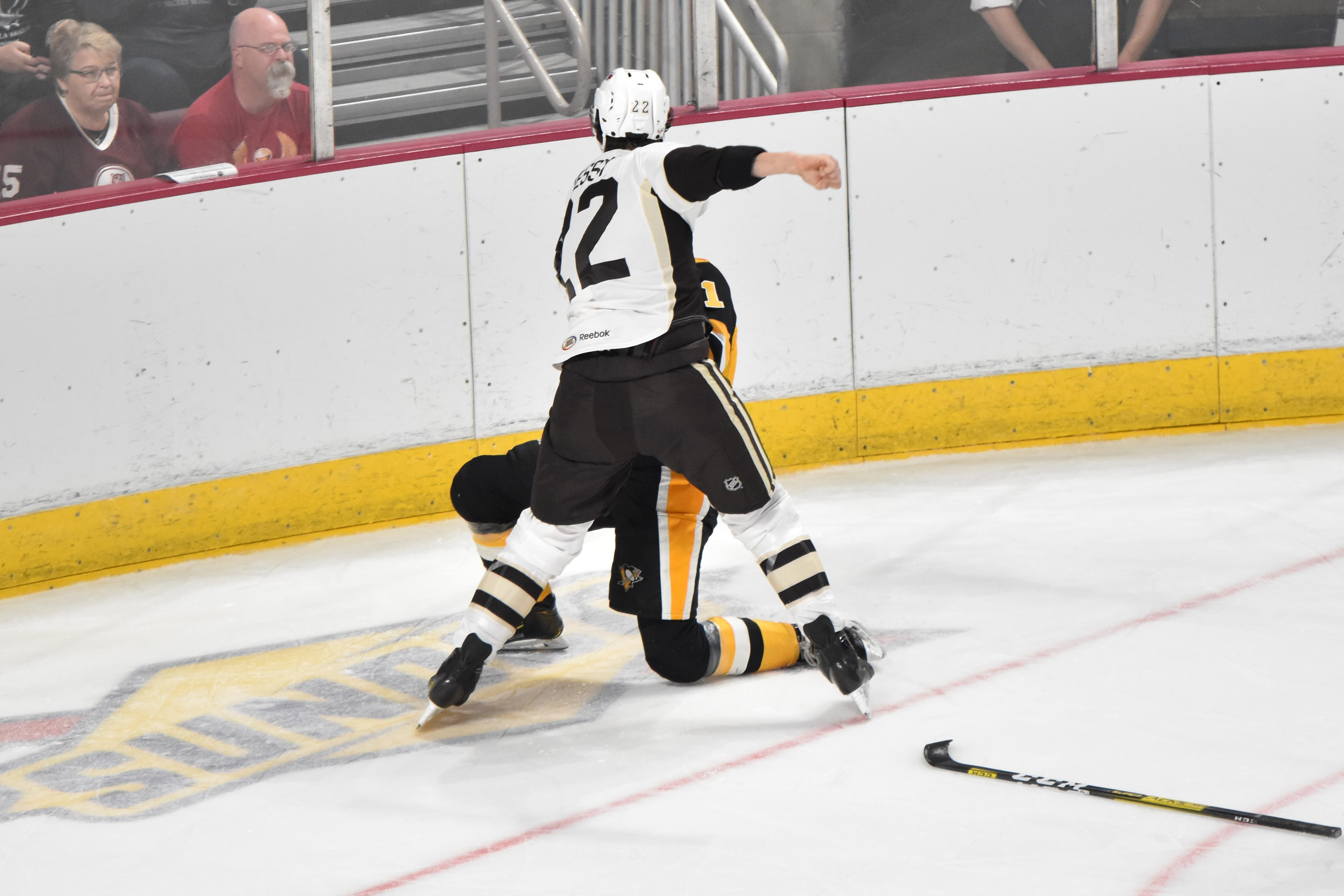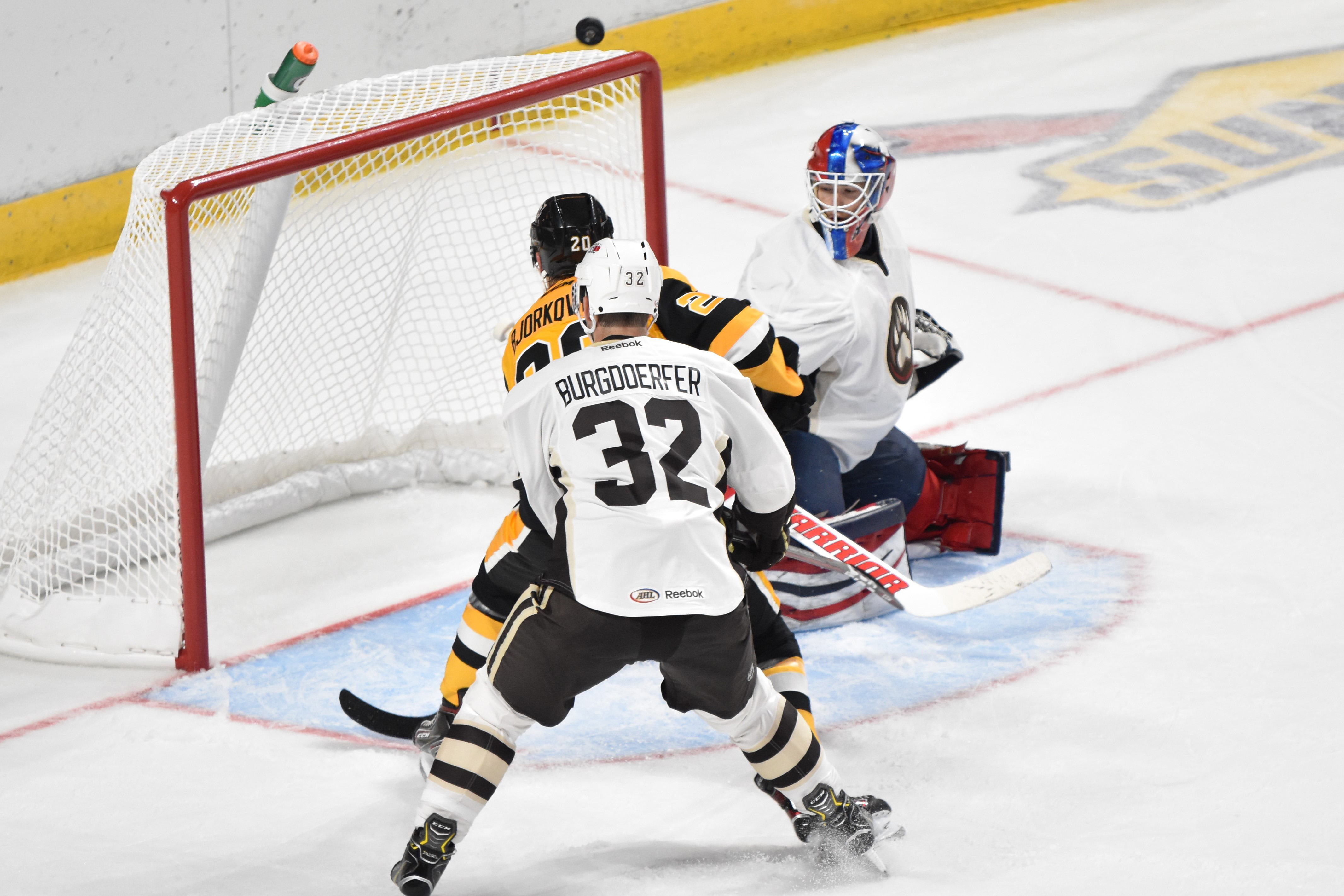 After a scoreless opening frame, the Penguins drew first blood in the final moments of the second period. On a sharp angle shot at 19:50, Kasper Bjorkqvist beat Milner short-side and low to the ice. Shots after 40 minutes were even at 18-18, with the Bears 0-for-2 on the power play and 3-for-3 on the penalty kill.