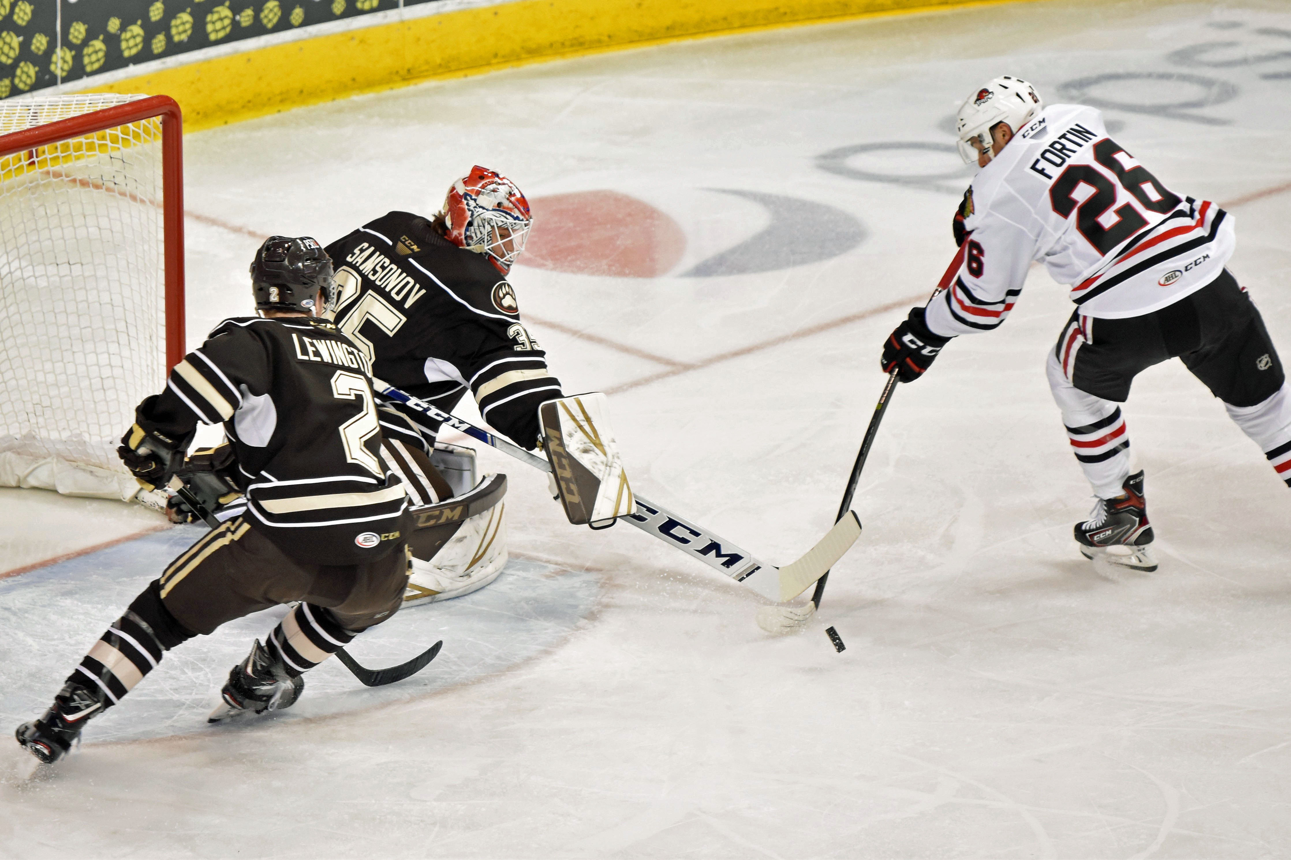 Hershey went 0-for-2 in the opening stanza on the power play, but drew even on an even strength goal. Ryan Sproul received credit for an unassisted goal at 14:54, after banking a sharp-angle shot off IceHogs goaltender Anton Forsberg and into the net. The IceHogs responded on a transition play in the later stages of the first period to grab a 2-1 lead before time expired. Along the left wing, Jacob Nilsson bombed a shot high-glove side on Samsonov at the 17:45 mark. Shots after 20 minutes were 11-8 Bears despite trailing 2-1.