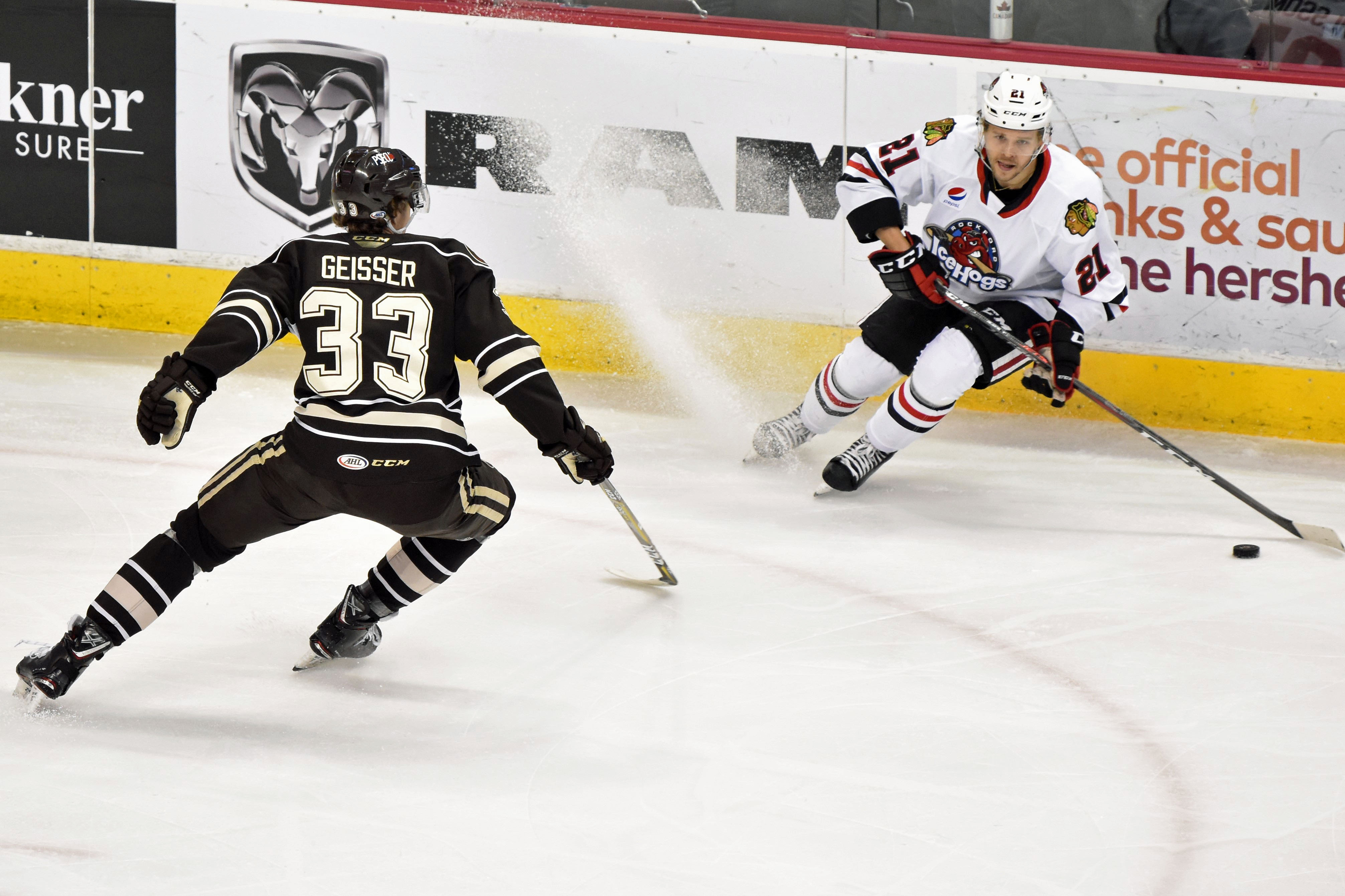 Both teams played to a scoreless middle frame with shots 19-12 Hershey after 40 minutes. Pilon’s third period equalizer came during a persistence play following a Rockford turnover. Beck Malenstyn threw a quick pass to an open Pilon in the slot. After IceHogs goaltender Anton Forsberg made the initial stop, Pilon followed his own shot and potted the rebound.