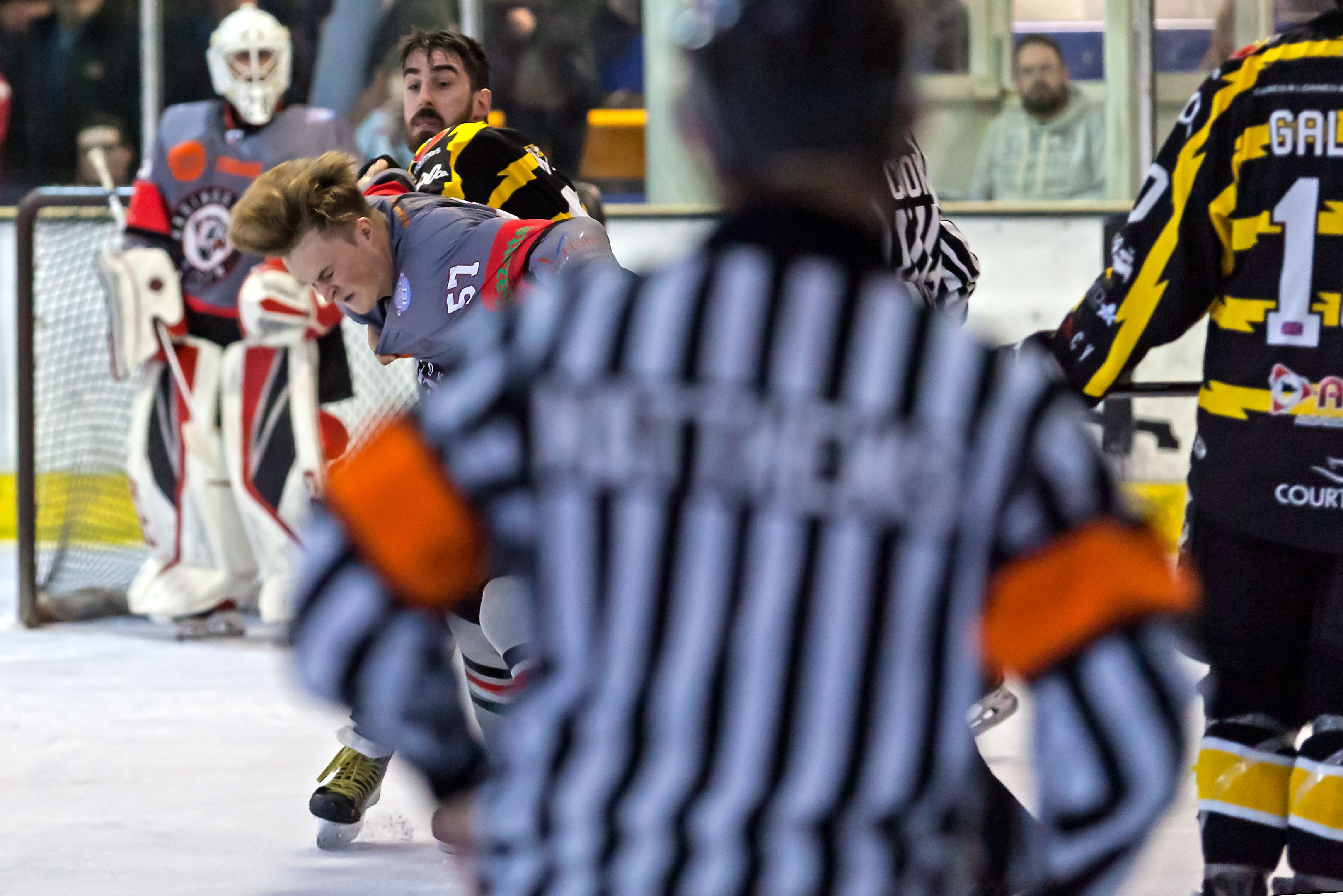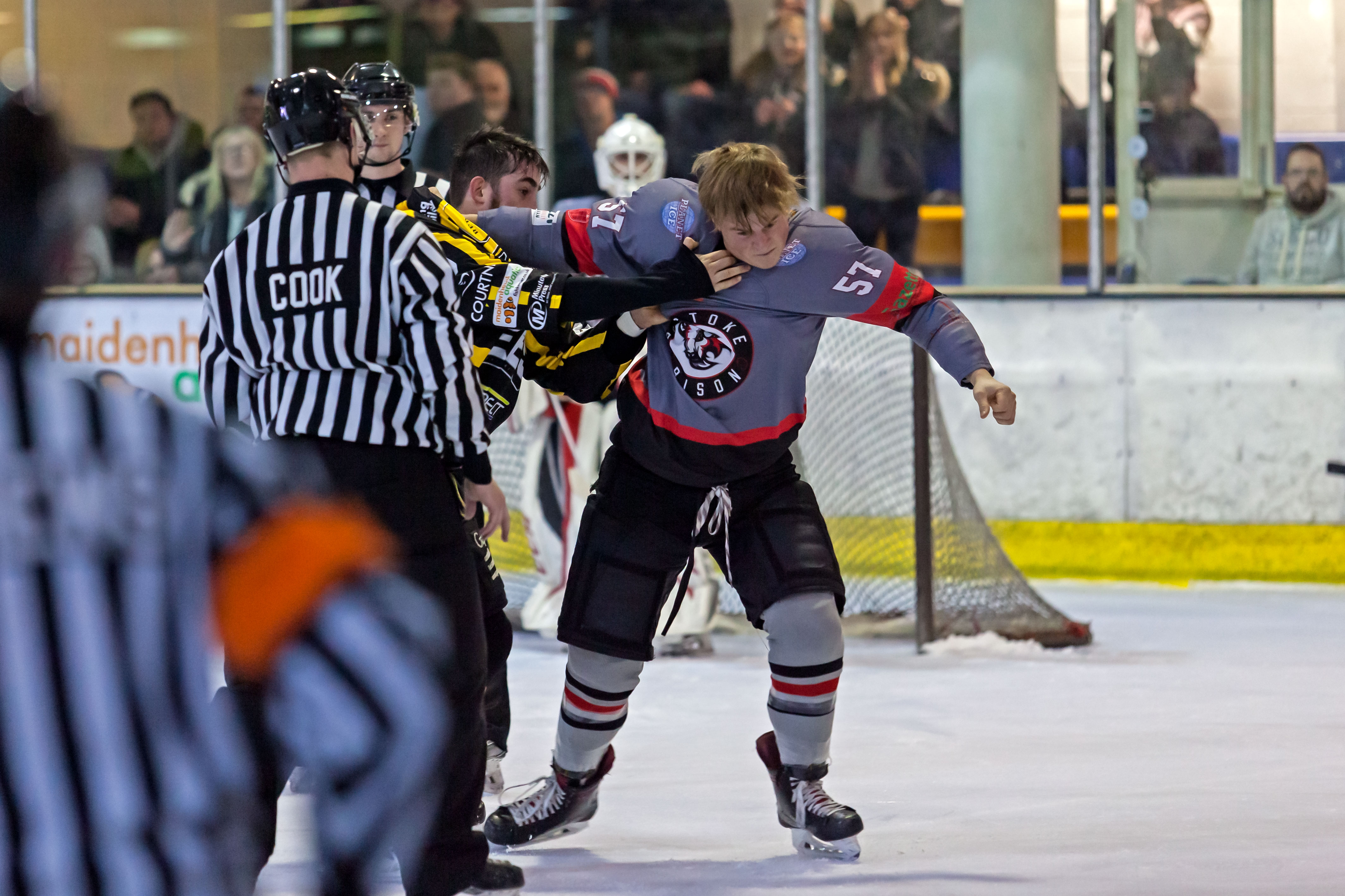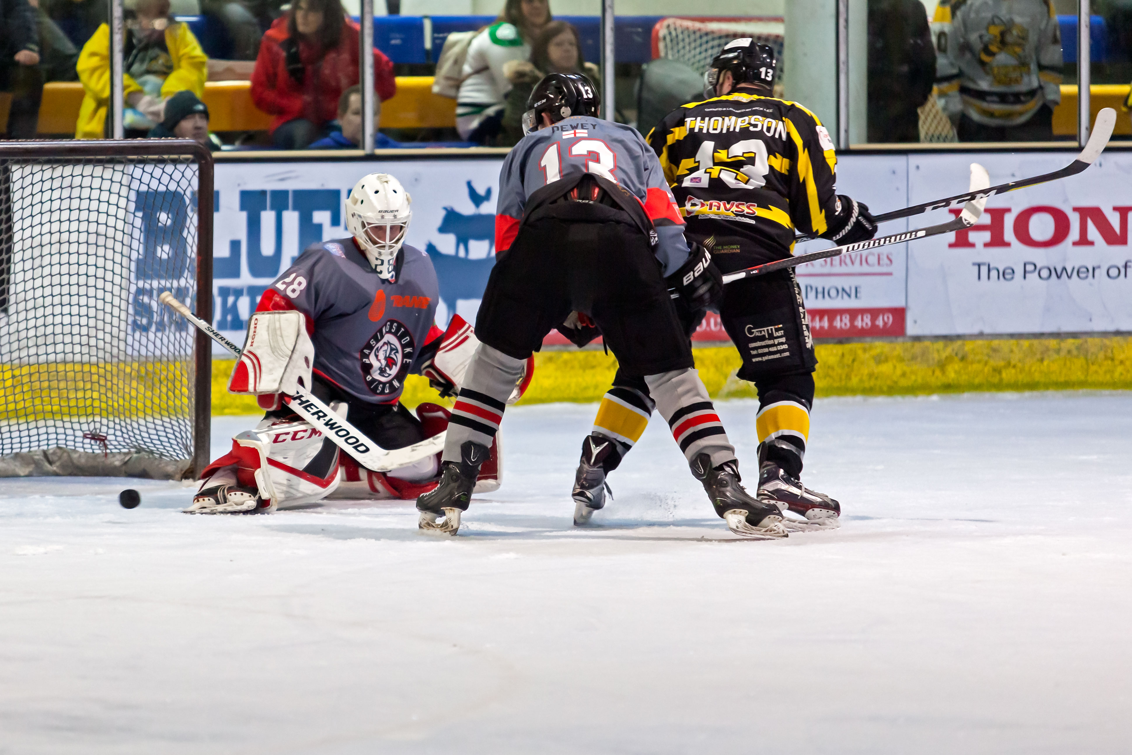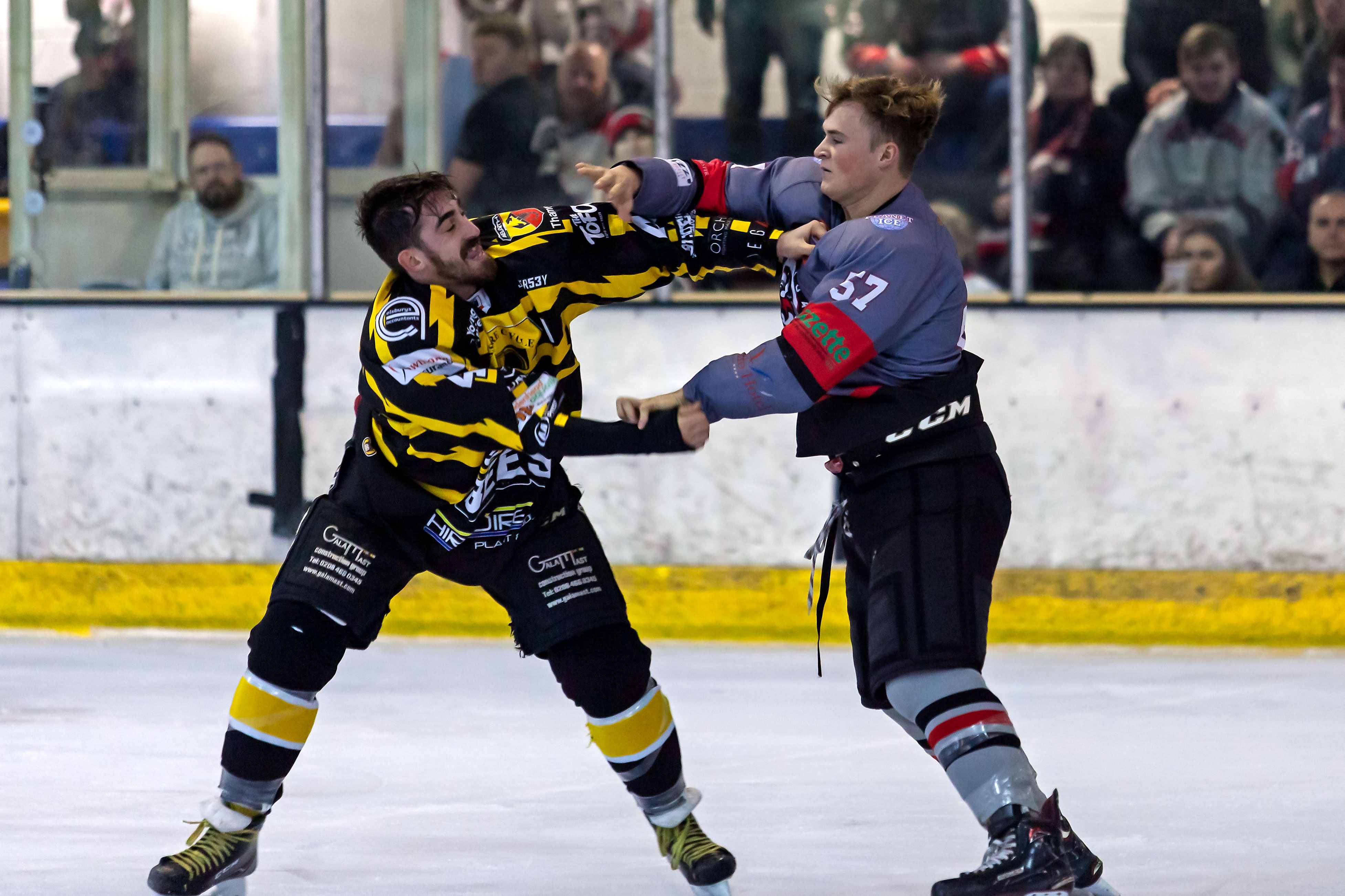 An unusually long opening shift eventually ended at 6.39 as Bison’s Alex Sampford scored the opening goal of the game after a fast paced shift that had seen chances come at both ends. Josh Martin and Adam Harding sat out roughing minors at 8.29 and at 4 on 4 Bison’s Tom Ralph netted their second of the night at 9.16. A third strike for the Bison at 10.42 from Adam Harding saw Dean Skinns come on to replace Danny Milton in net. Sklnns kept the net clear for the remainder of the opening period which saw a scrap between Ryan Watt and Danny Ingoldsby see both sit out double fighting minors together with a 2+10 for roughing served by Ben Paynter.