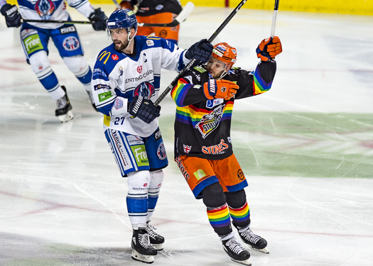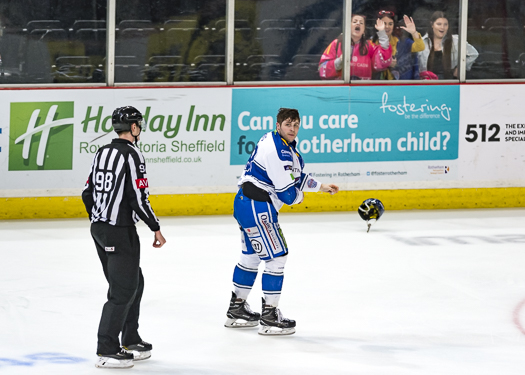 On 51.05, there was a flashpoint in the game as Sheffield’s Eric Neiley invaded Hackett’s crease, with the Blaze netminder responding in kind, the two each receiving 5 for fighting following the scuffle, the goalies penalty being sat by Florian.