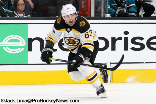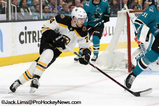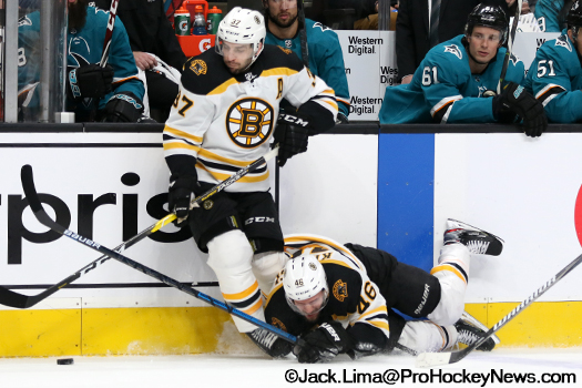 Bruins Patrice Bergeron (37) and David Krejci (46) fight for the puck along the boards – Photo by Jack Lima