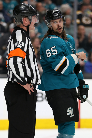 Sharks defenseman Erik Karlsson chats with referee Brad Watson during a timeout – Photo by Jack Lima