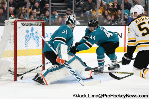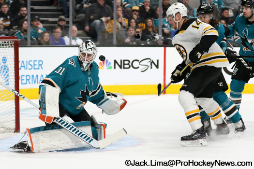 Sharks goalie Martin Jones looks for the puck as Chris Wagner (14) looks for a rebound – Photo by Jack Lima