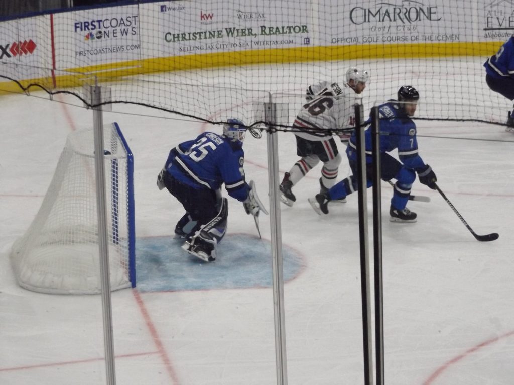 After being held off the scoreboard in their previous game, it took the Icemen just over a minute to score their first goal Wednesday. Following a faceoff win, Everett Clark snapped a shot from the slot that clipped past the reaching glove of Chase Marchand for the goal to put Jacksonville on top 1-0.