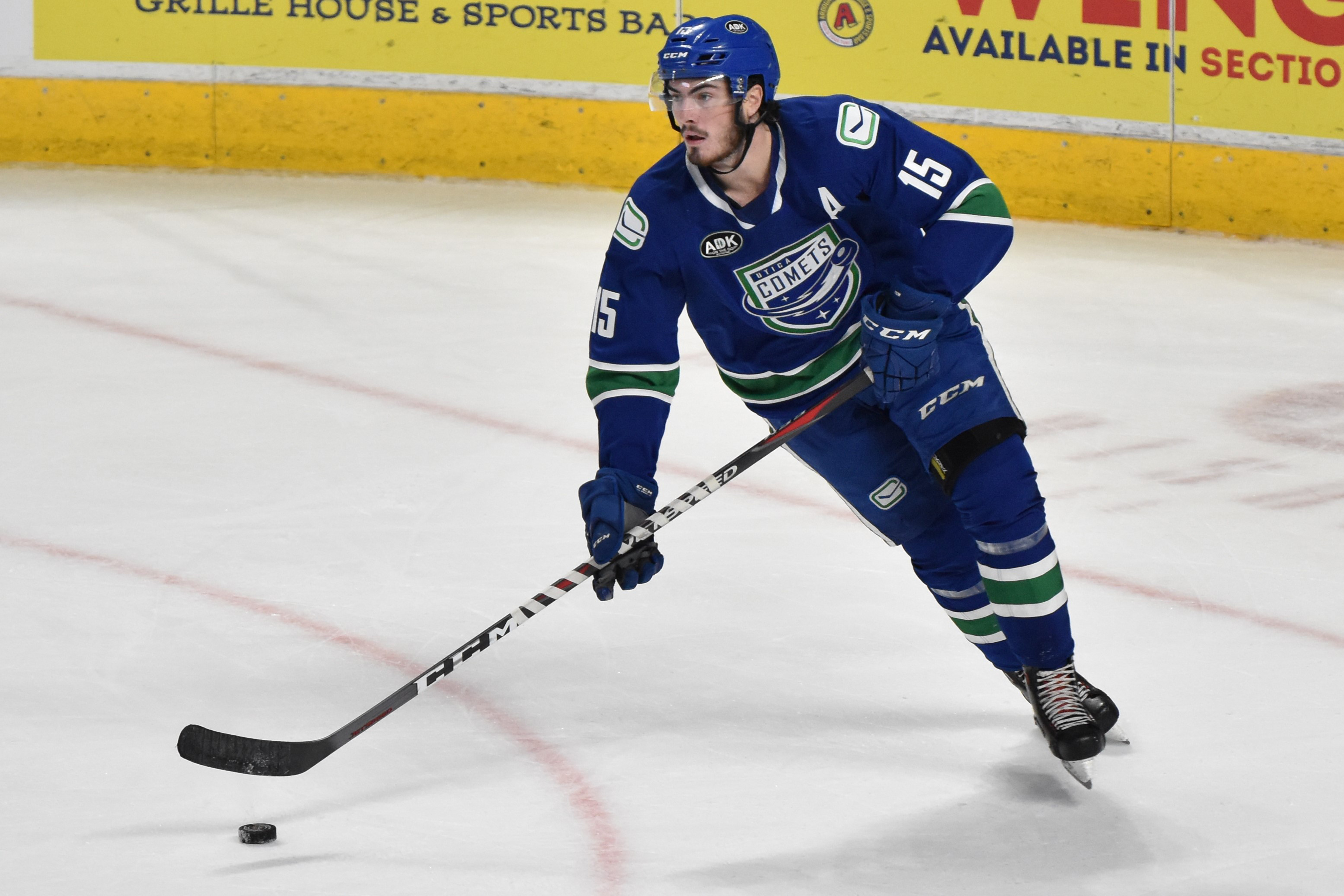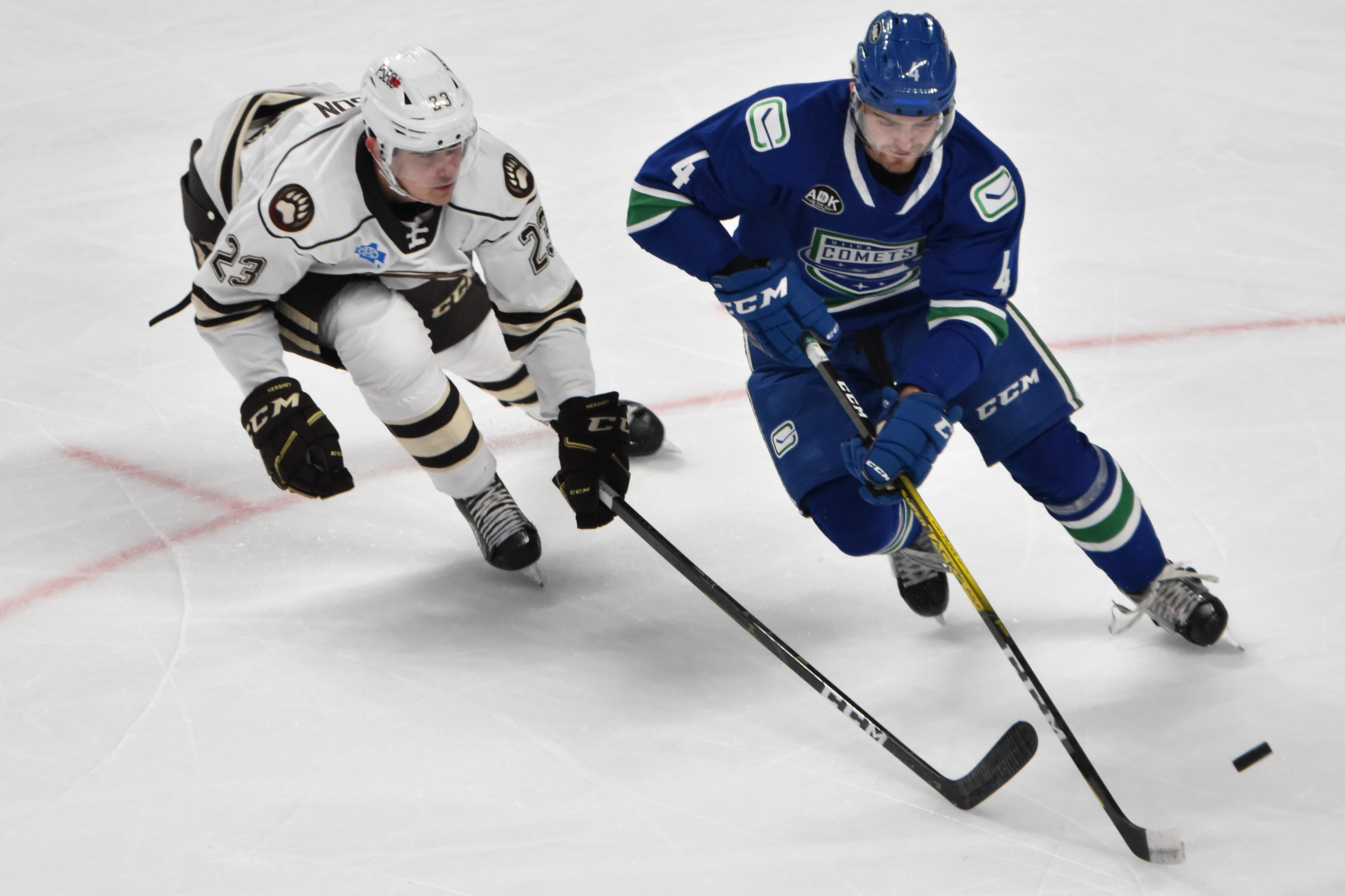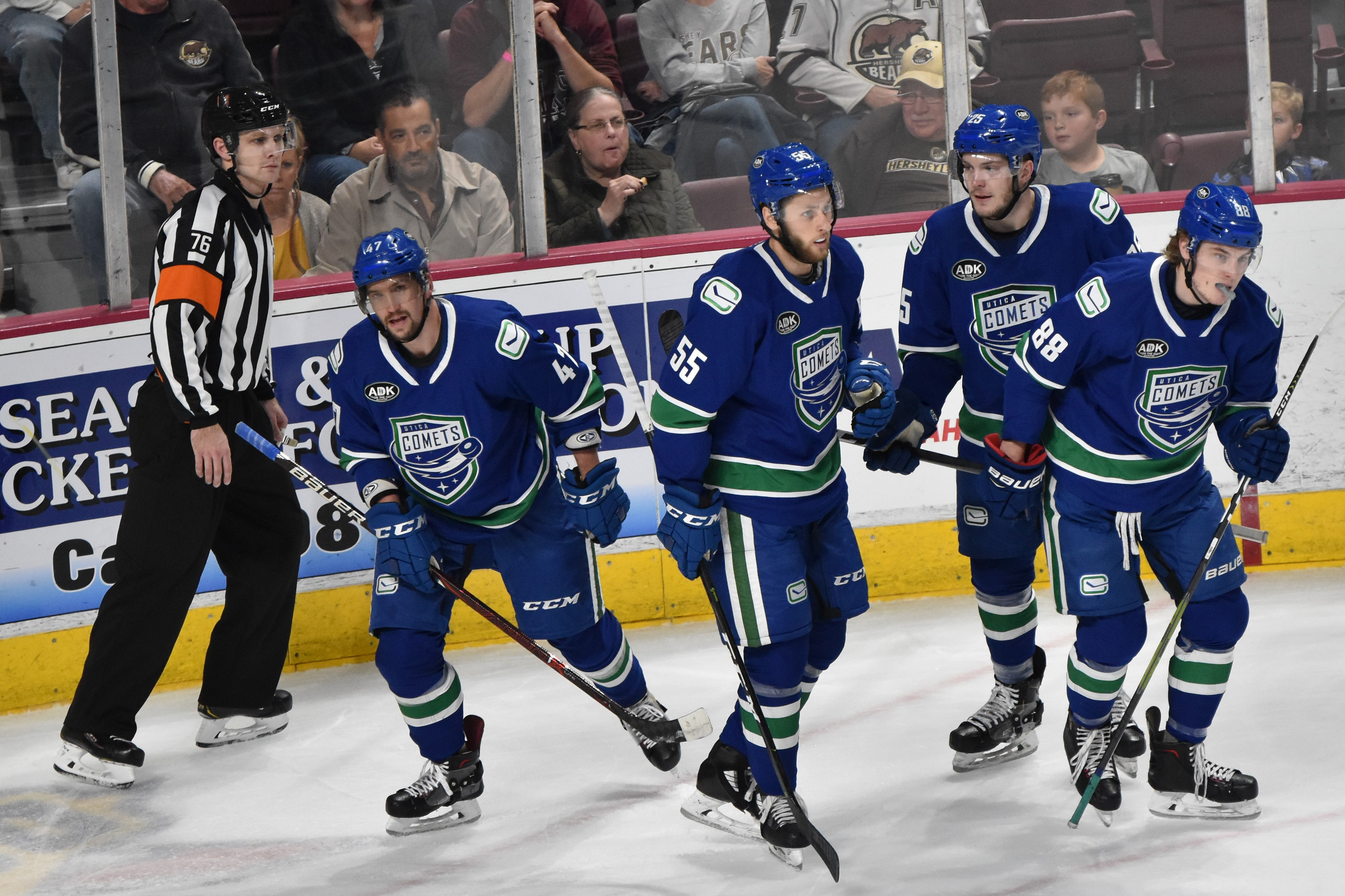 Creating multiple chances in the first period, the Comets were rewarded midway through the opening frame. Sven Baertschi hurried the puck up the ice along the right wing side before firing a rink-wide feed onto the tape of Adam Gaudette. After reeling the pass in, Gaudette carried into the Hershey zone and lasered a wrist shot from the left dot into the short-side corner of the net. Gaudette’s first of the year was the only goal of the period and sent the Comets into the break with a 1-0 lead.