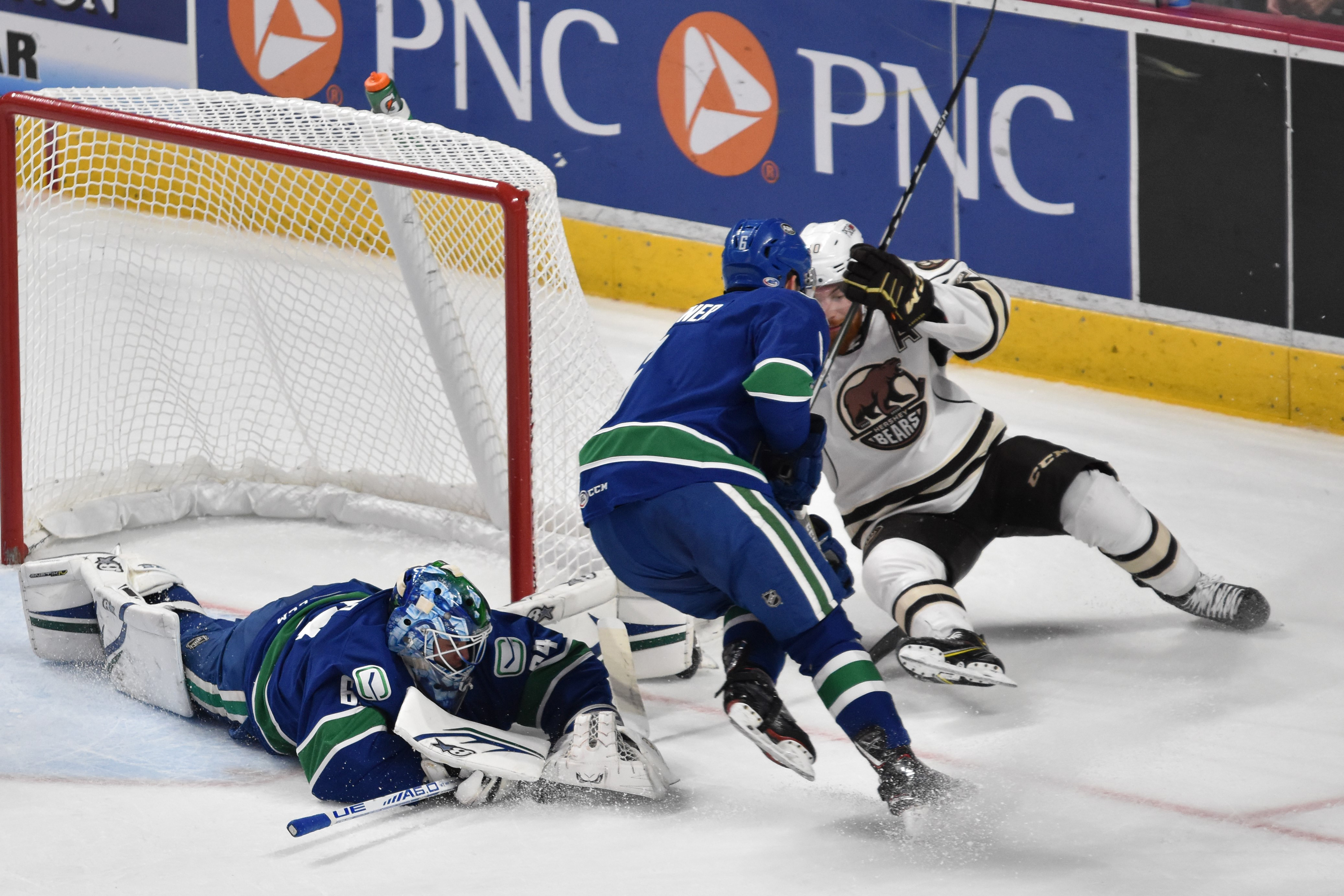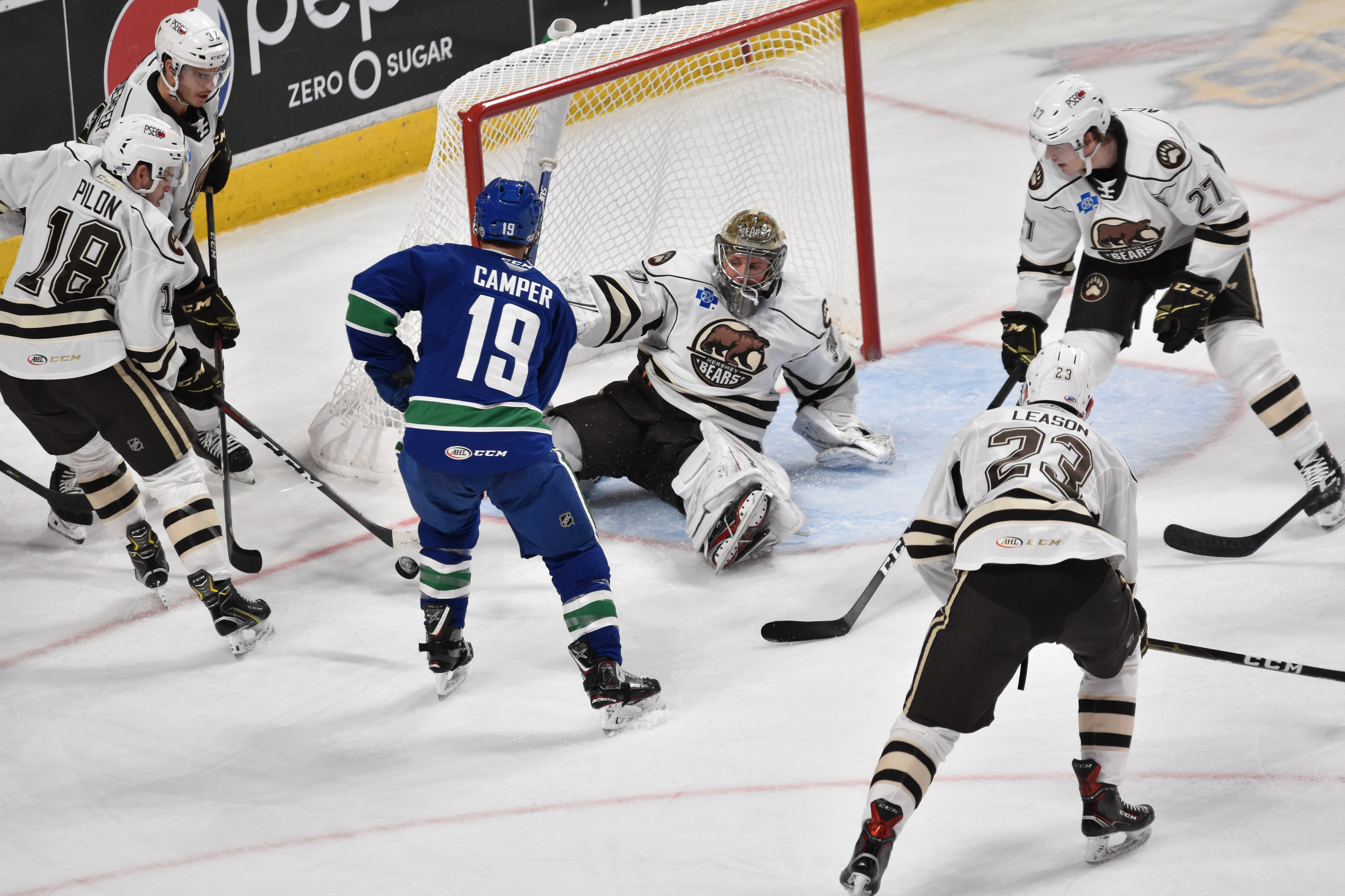 Hershey, Penn. – Michael DiPietro made 38 saves on his way to first star honors, and Reid Boucher earned the shootout winner as the Utica Comets defeated the Hershey Bears by a 2-1 margin on Saturday night at Giant Center