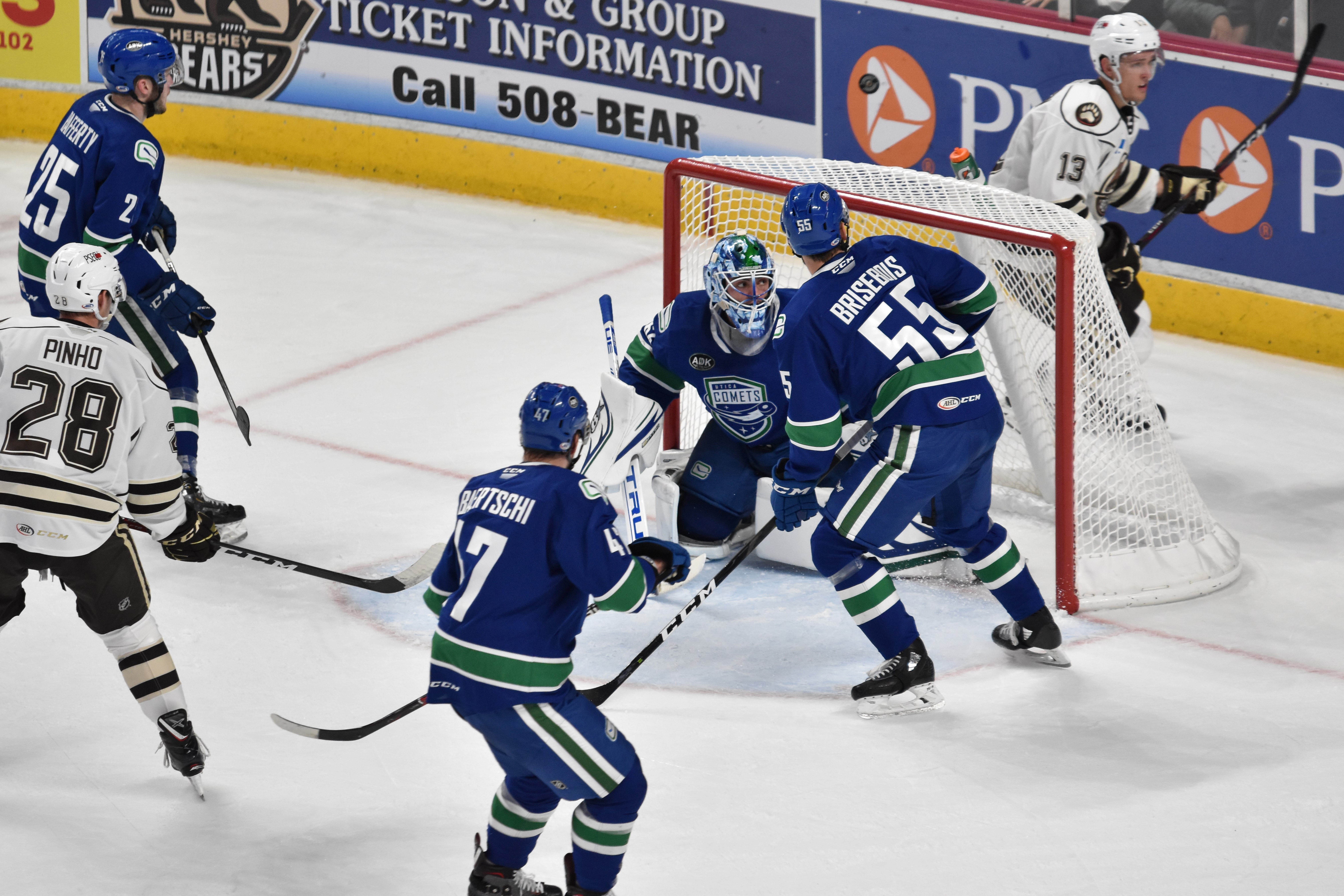 The second period saw the Bears gain their footing and outshoot the Comets by a 14-4 margin. However, DiPietro came up with a stop for each and every Hershey effort and the Comets penalty kill went 3/3 in the session, as the team maintained grip on their 1-0 lead into the second intermission.