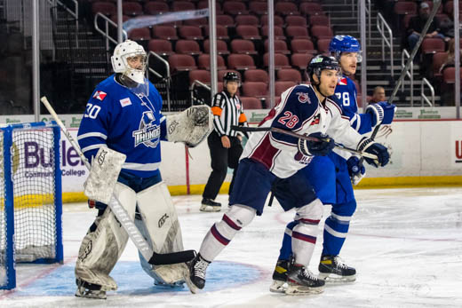 The Thunder scored first for the fourth game in a row. Crinella made quick work on a power play at 6:03, blasting a one-timer from the left circle past Daniel Mannella.