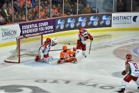 Matthew Myers picked up on a rebound after Matt Pope’s shot was saved by Tomas Duba and with no defensive cover, Duba was beaten under the blocker for 3-0 (19:14)