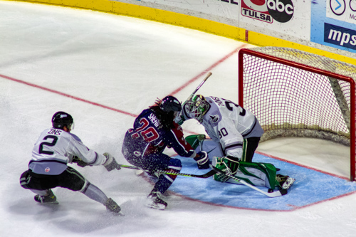 Tulsa Oilers forward Dante Sheriff (29), Idaho Steelheads goalie Bryan Thomson (30), Idaho Steelheads defenseman Trevor Zins (2)