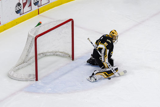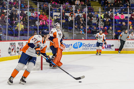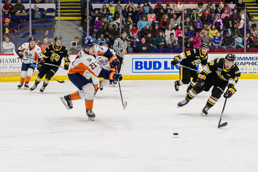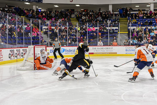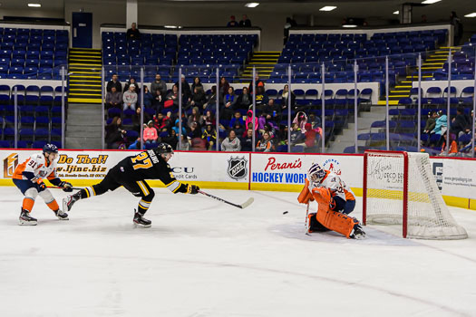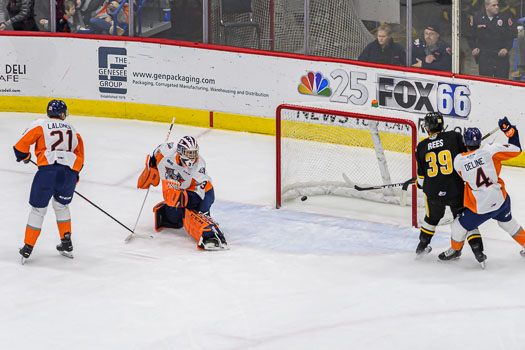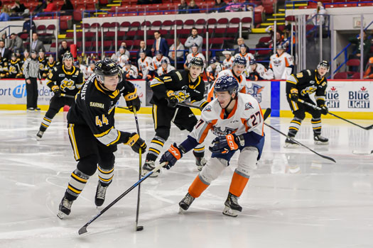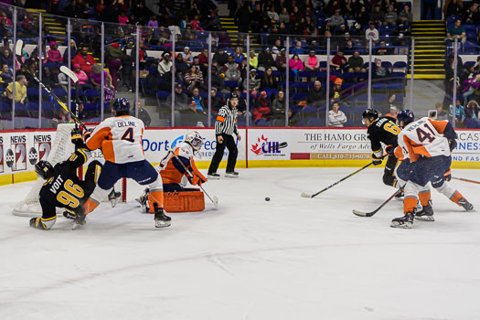 Jacob Perrault increased the Sting’s lead to three on a broken play in the neutral zone. Perrault found a loose puck on the right-wing wall and scored shortside at 8:29 of the middle period.