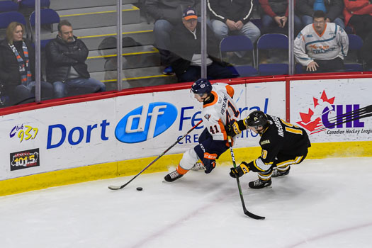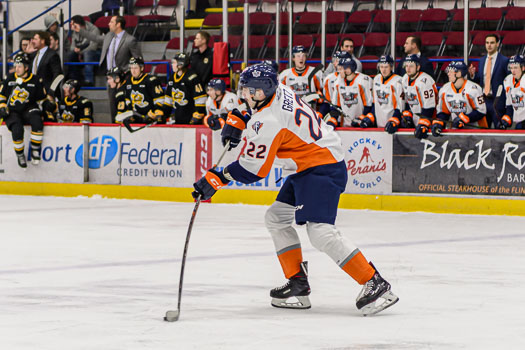 Cody Morgan scored for Flint at 15:39. From the right corner, Jack Phibbs fed the puck to Jake Durham in the right circle. Durham sent a pass that deflected off a Sarnia defender’s skate to Morgan backdoor, who found twine for his fifth of the season.