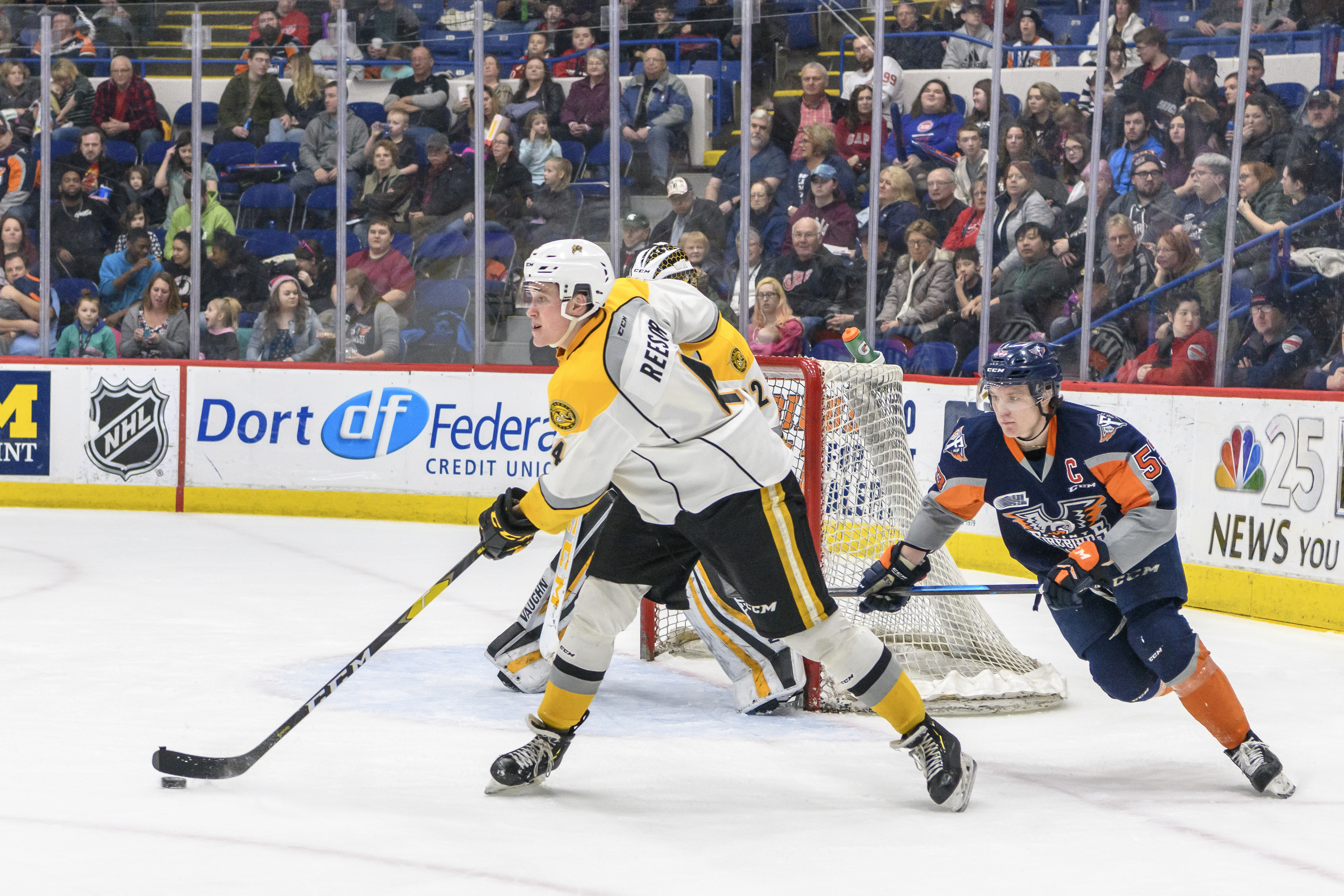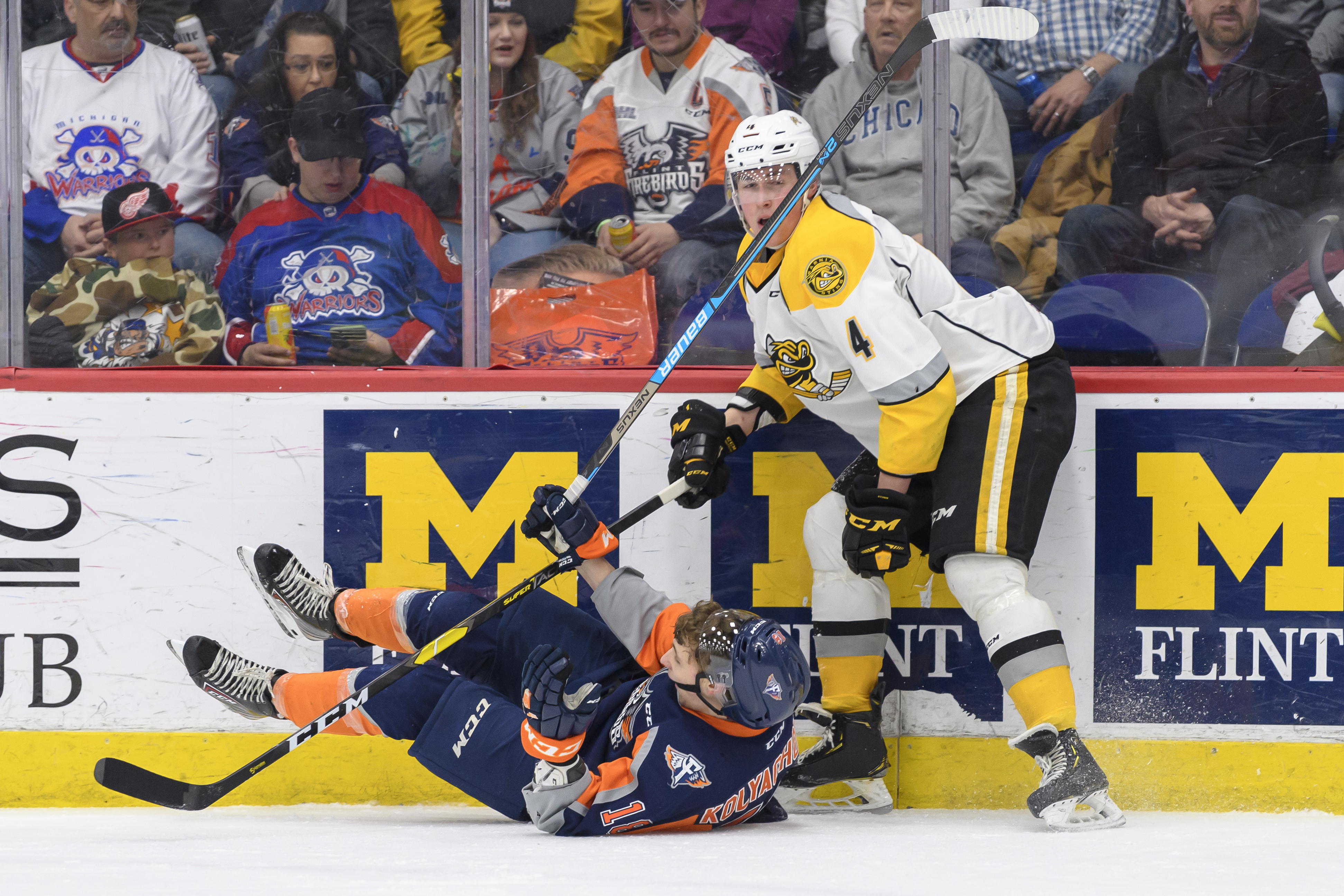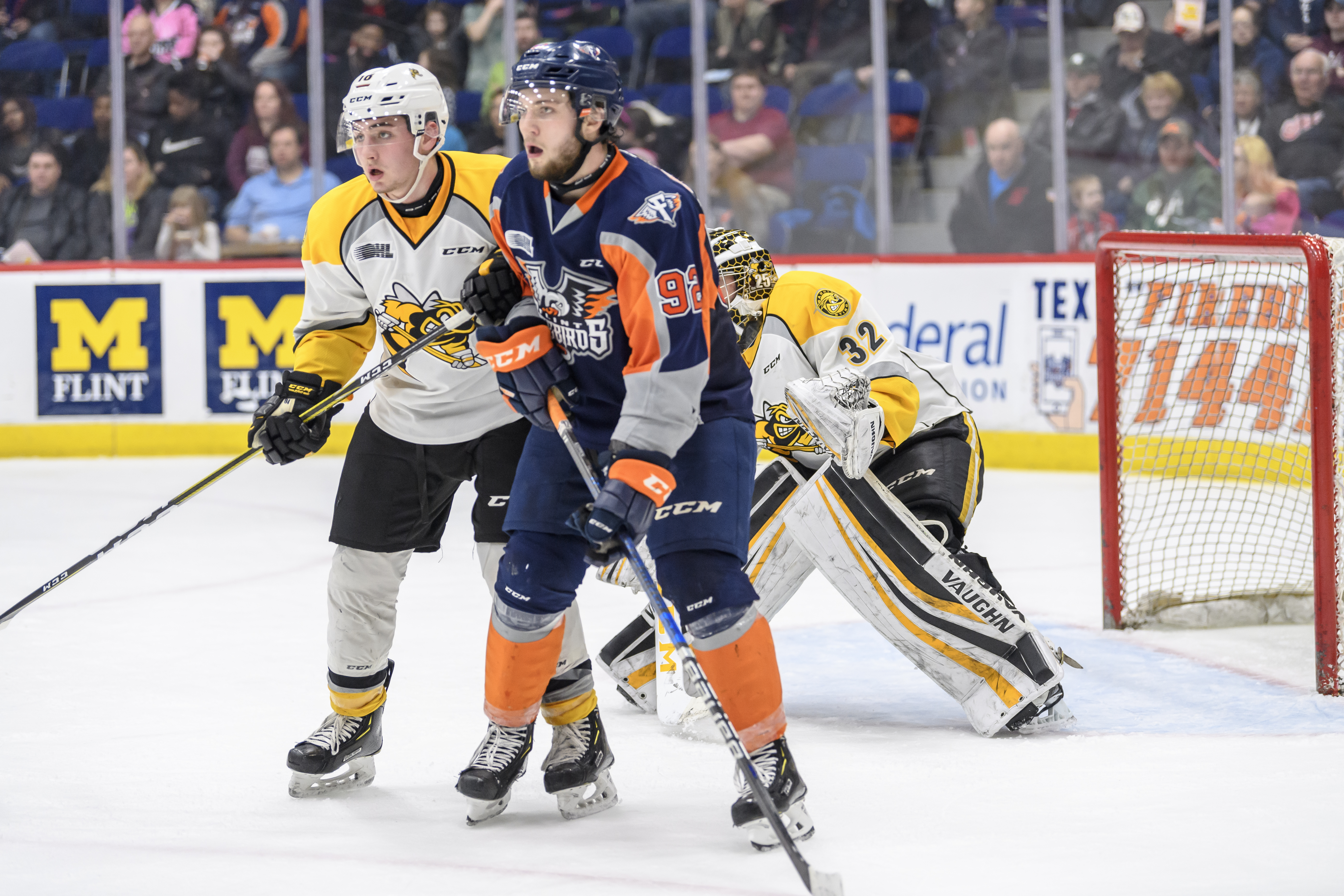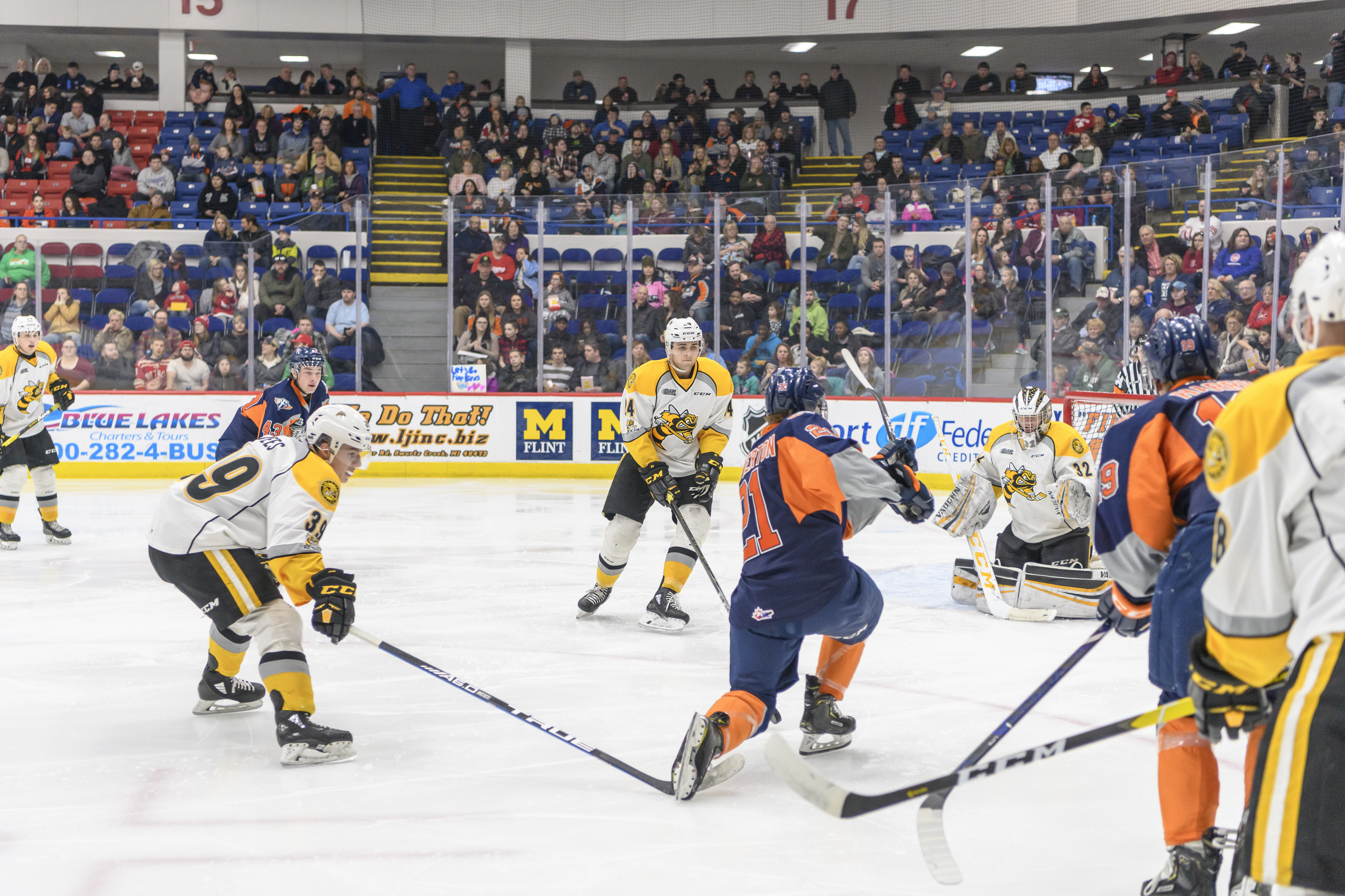 Hunter Holmes scored the next two goals of the game, logging his 12th and 13th. His first was a tap-in off a perfect pass from Evan Vierling (19). Jack Phibbs (7) picked up the second assist on the goal, recorded at 11:01 of period two. Next, Kyle Harris (8) sent the pass that sprung Holmes free from the offensive blue line in. He lifted the puck just inside the right post at 13:52 to give Flint the 4 – 1 lead. Vierling assisted on both goals by Holmes.