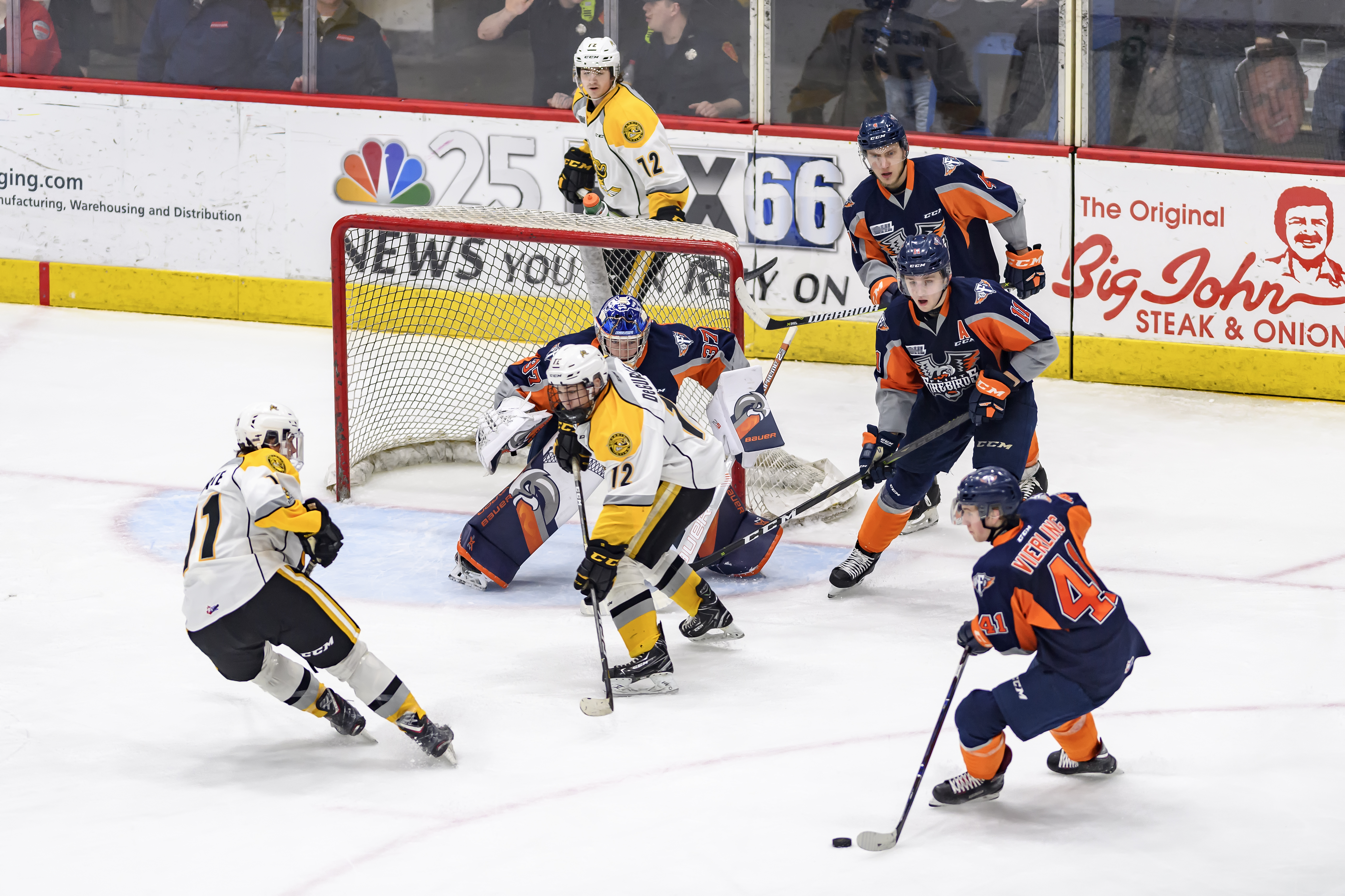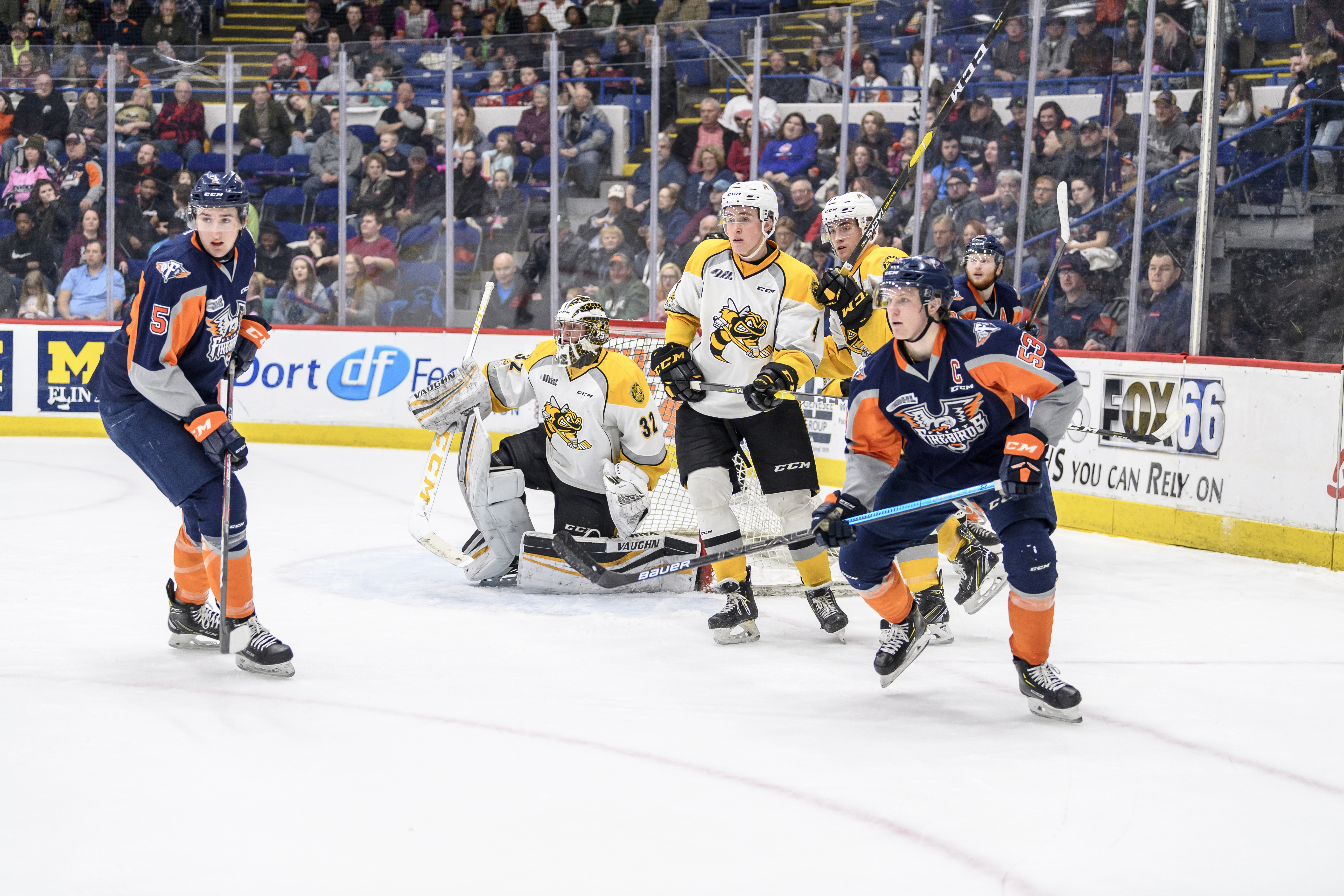 Flint was first to score at 9:57 of the first period. Jack Wismer made the set-up pass from the bottom of the left circle to Ethan Keppen at the top of the circle. Keppen dropped to one knee for a one-timer that found the top right corner of the net. The goal was his 29th of the season. The Sting tied the game at 15:24 on a breakaway tally from Jacob Perreault.