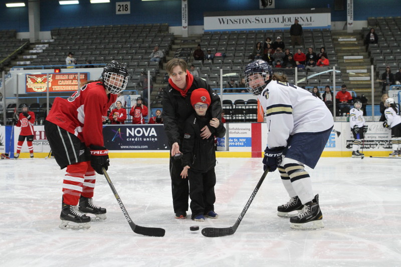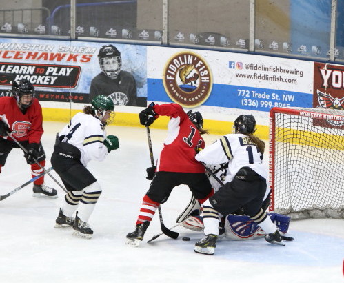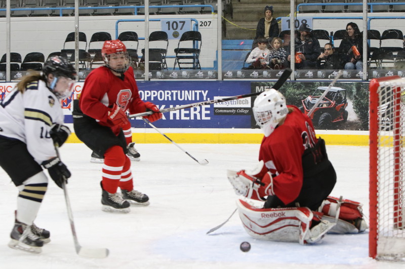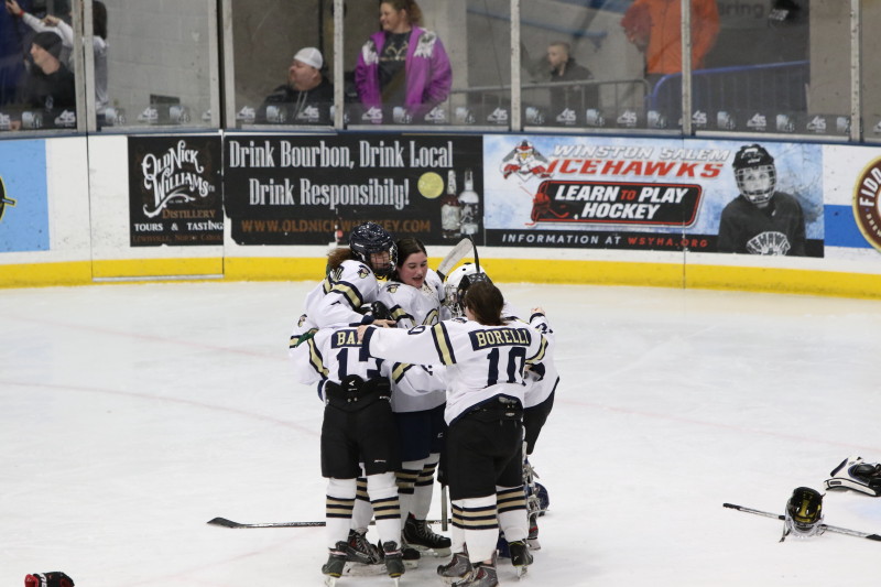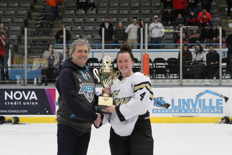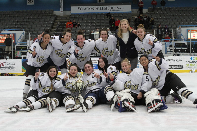 WINSTON-SALEM, NC: The George Washington University women won the first women’s ACC hockey tournament versus North Carolina State University, by a score of 4-3. The inaugural event was held on Saturday, February 15, prior to the men’s D2 semifinal games. Between periods, local girls hockey teams were able to take the ice to the delight of the crowd.