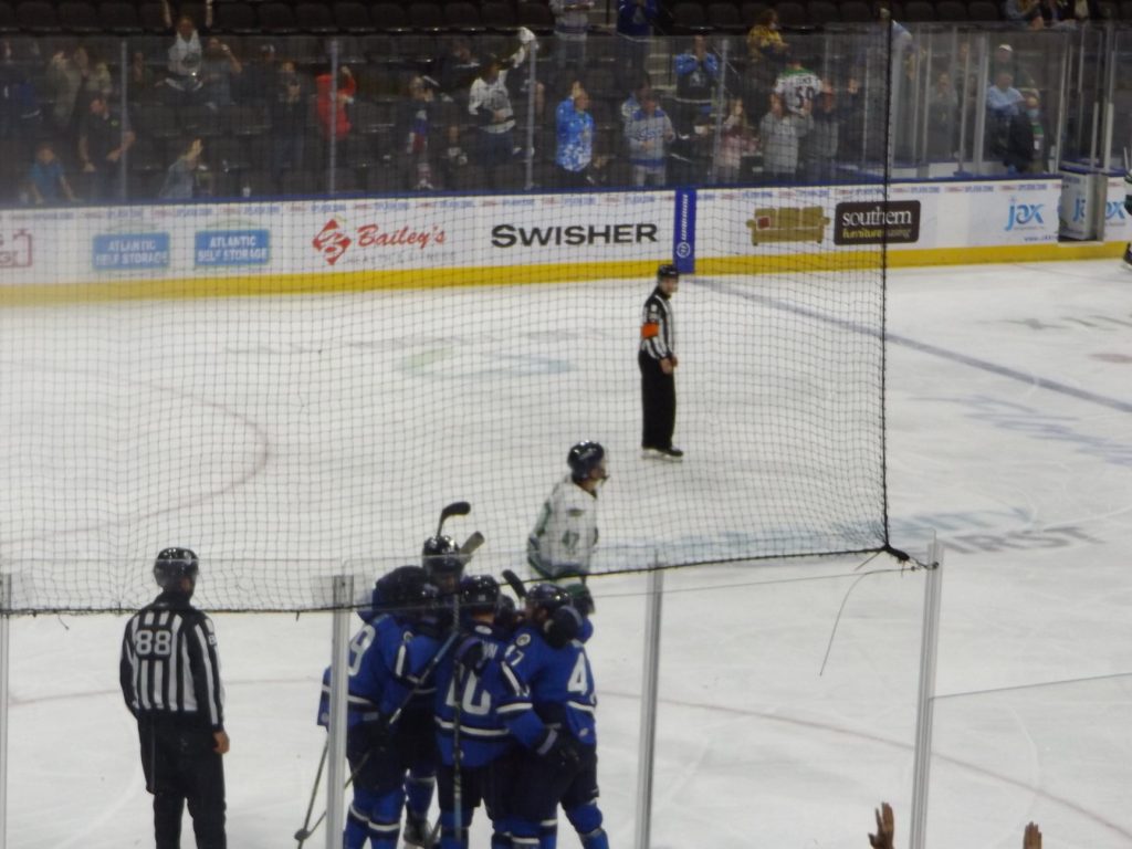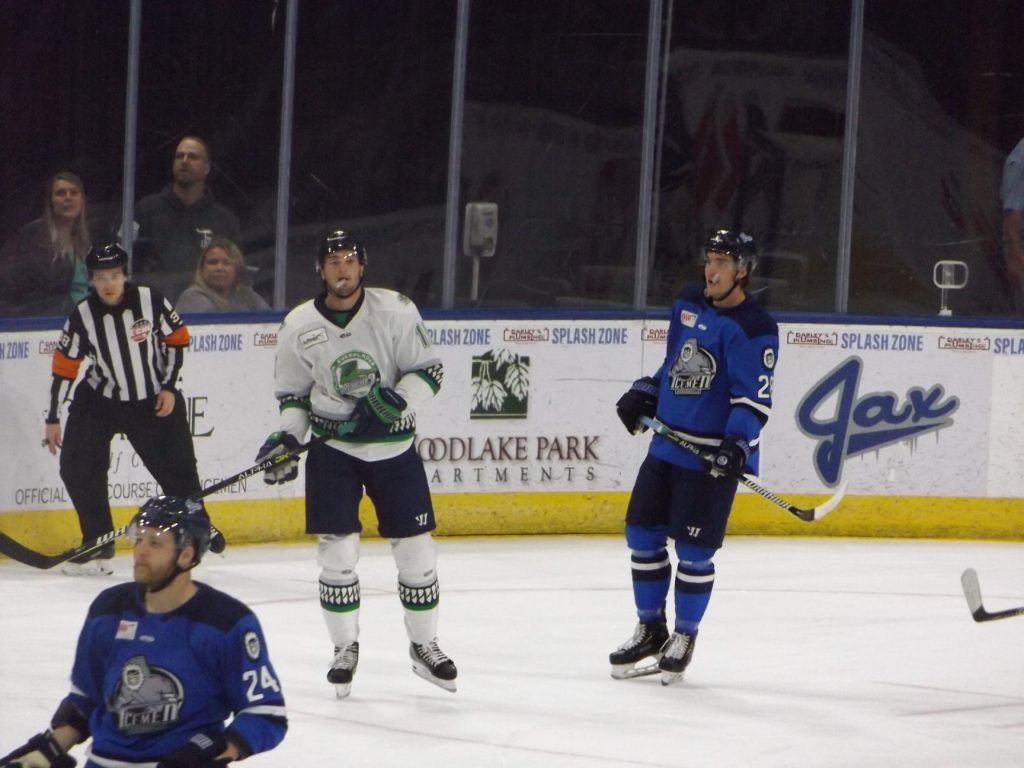 JACKSONVILLE, FLA – Jacksonville Icemen forward Abbott Girduckis was the hero on Saturday, April 10th, scoring a hat trick to lead the Jacksonville Icemen to a 4-1 victory over the first place Florida Everblades on Day 2 of Youth Sports Weekend.