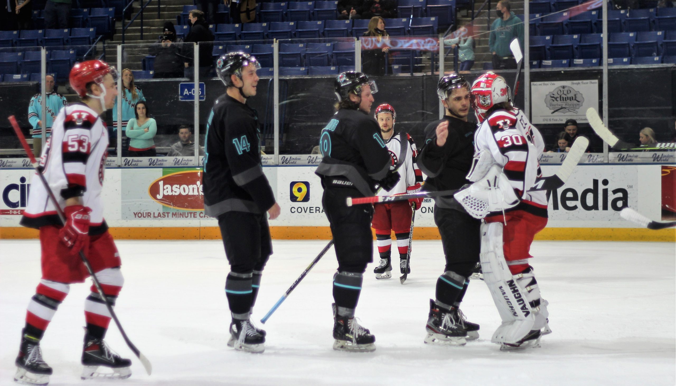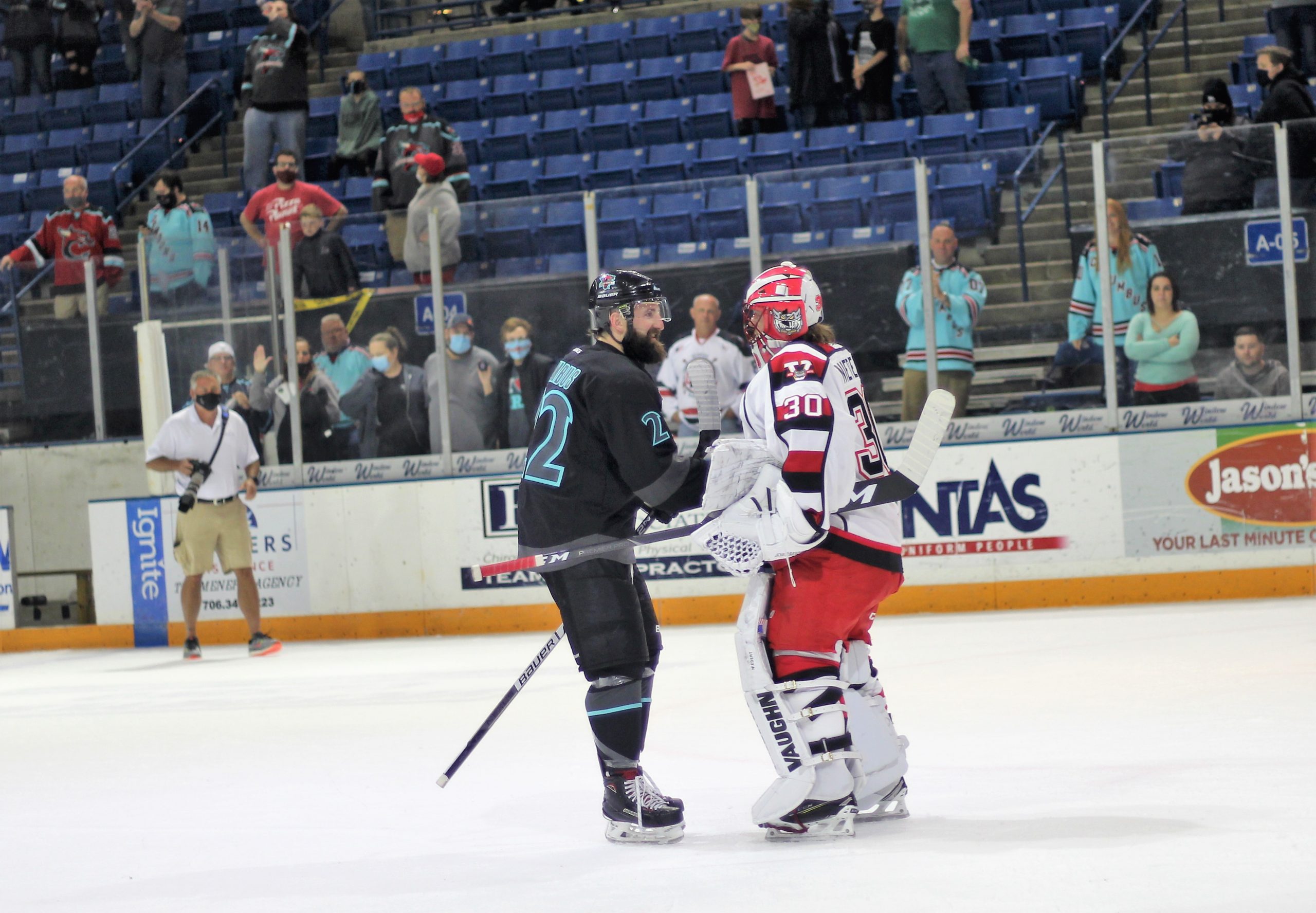 With about two minutes left in the game, Blake Scott vacated the crease after giving up the 11th goal and Nick Niedert returned to see his final pro game out from between the pipes, a massive sign of respect for a man who has given so much to pro minor hockey (800+ games dressed across 9 different minor leagues). After the game Prowlers and River Dragons skated over to Niedert’s crease to show their respect.