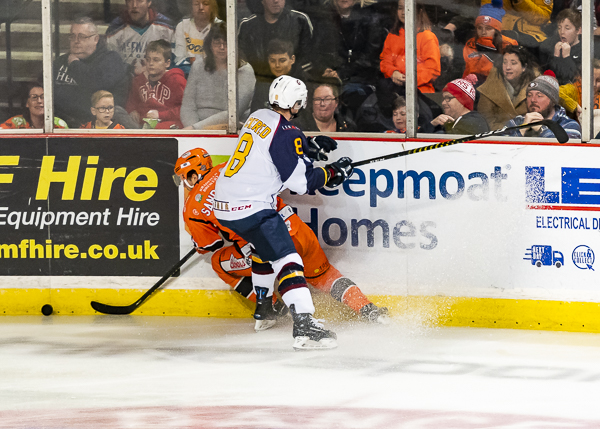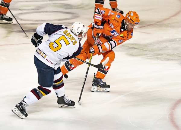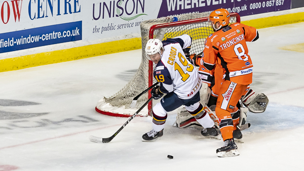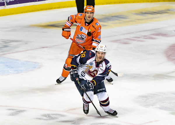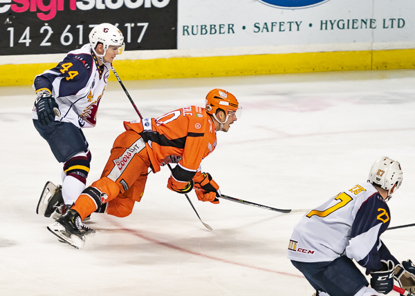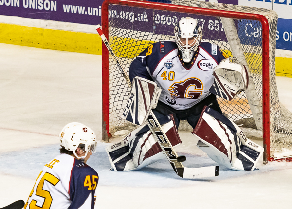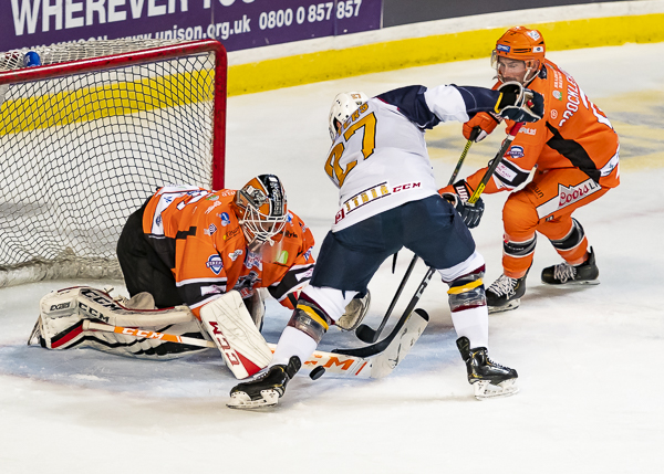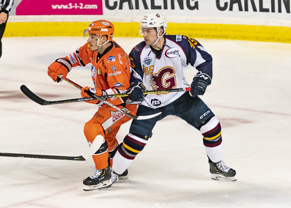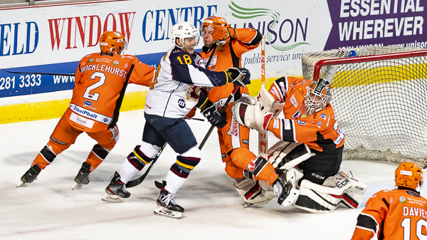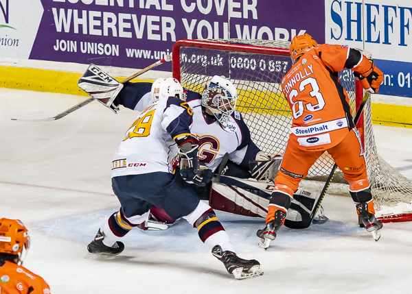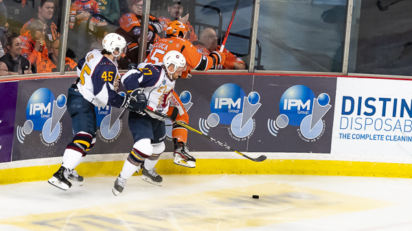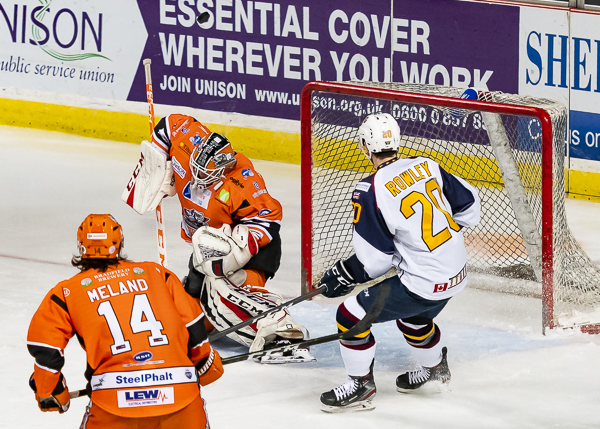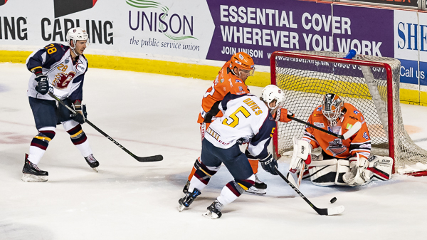 The Flames had the better of the opening exchanges and were rewarded with the lead at 7:41 as Ian Watters’ shot deflected and looped up over Tomásš Duba and into the net. However, Brendan Connolly’s one-timer levelled the scores at 8:47 with Travis Fullerton unable to hold on to the puck as the first ended one each.