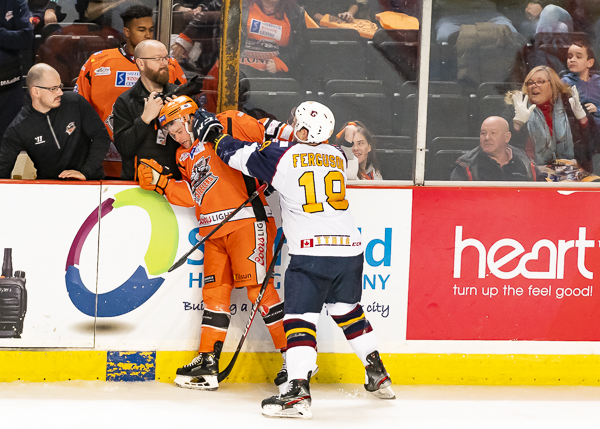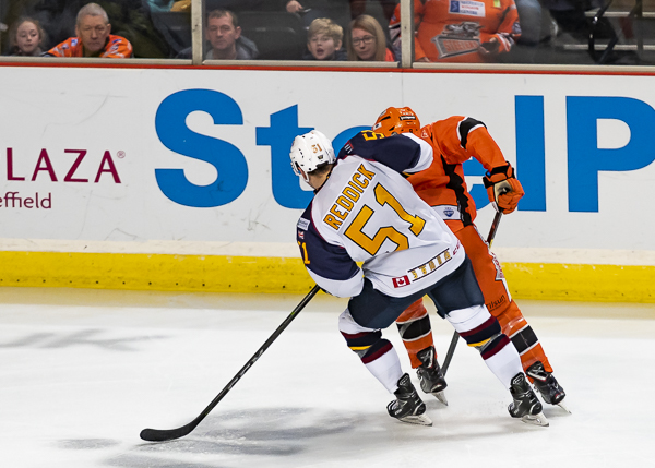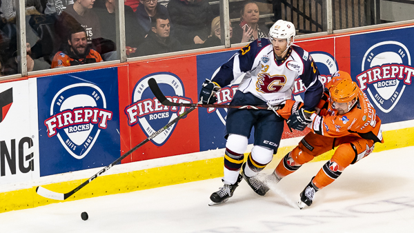 Period two was all about special teams. Powerplay goals for the Steelers from Tanner Eberle and Brendan Connolly at 27:48 and 29:47 respectively put the hosts 3-1 ahead, while the Flames were unable to take advantage of a 5-on-3 and two other one-man advantages in the period. Jamie Crooks’ missed penalty shot at 30:57 kept the visitors two goals behind.