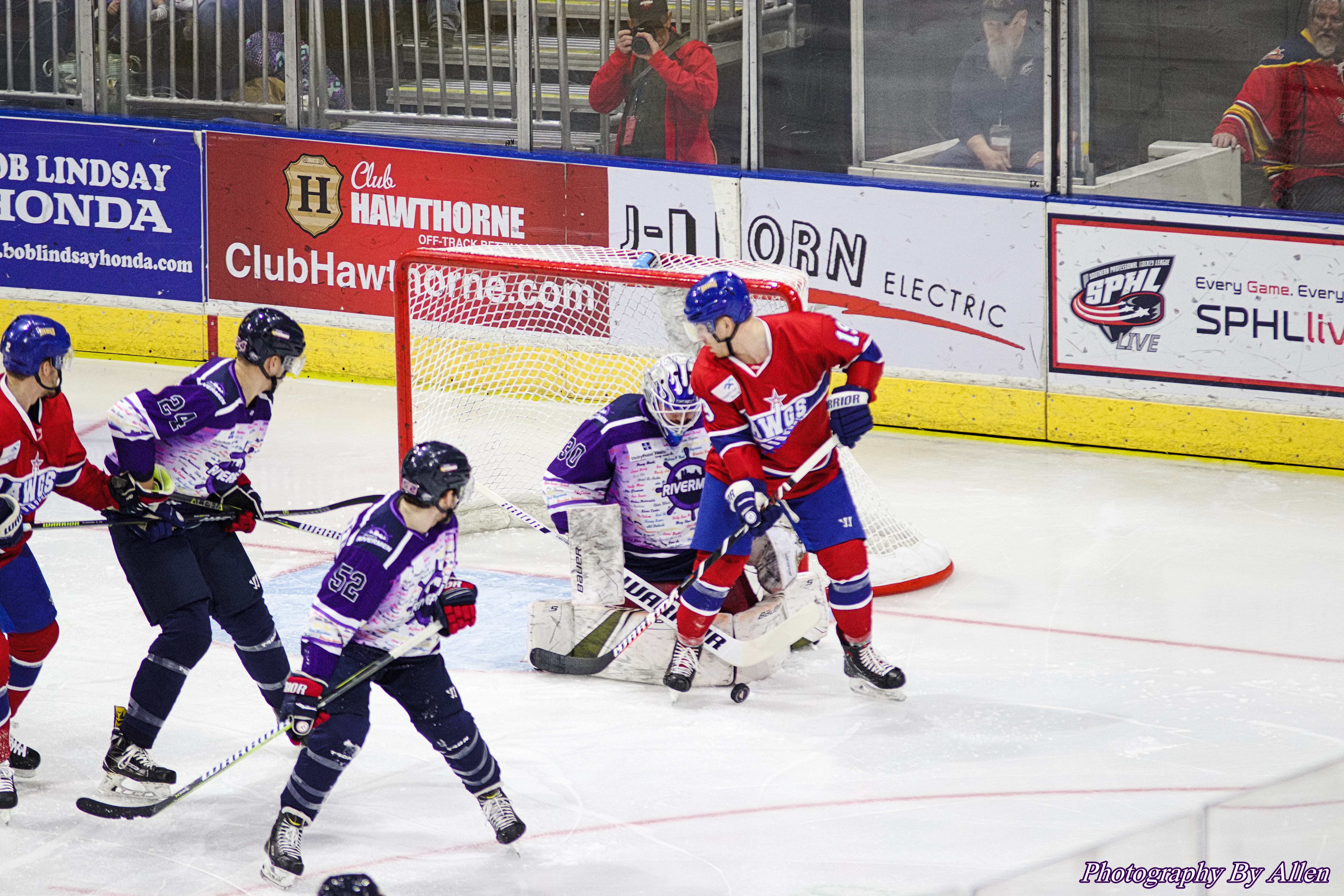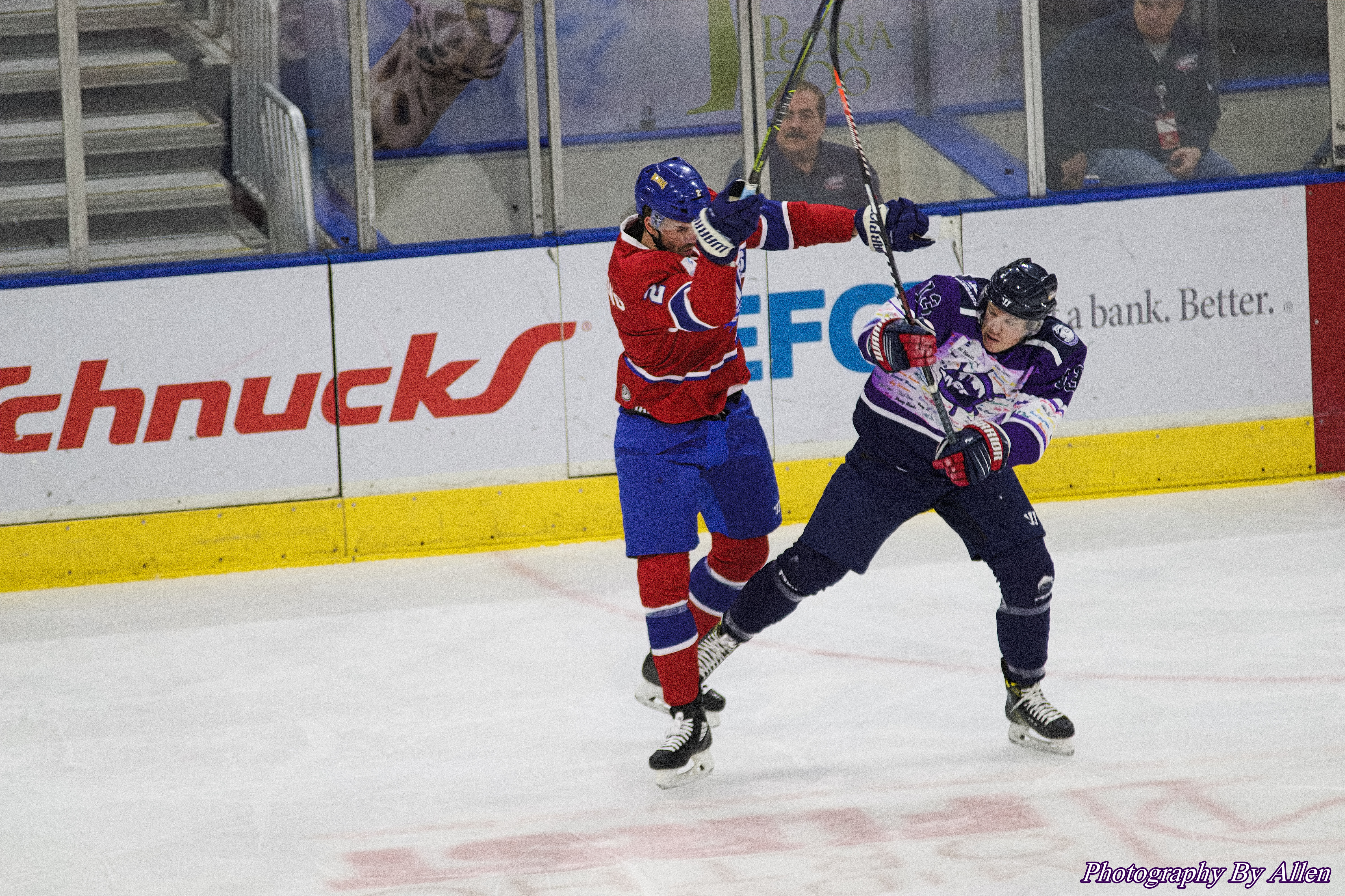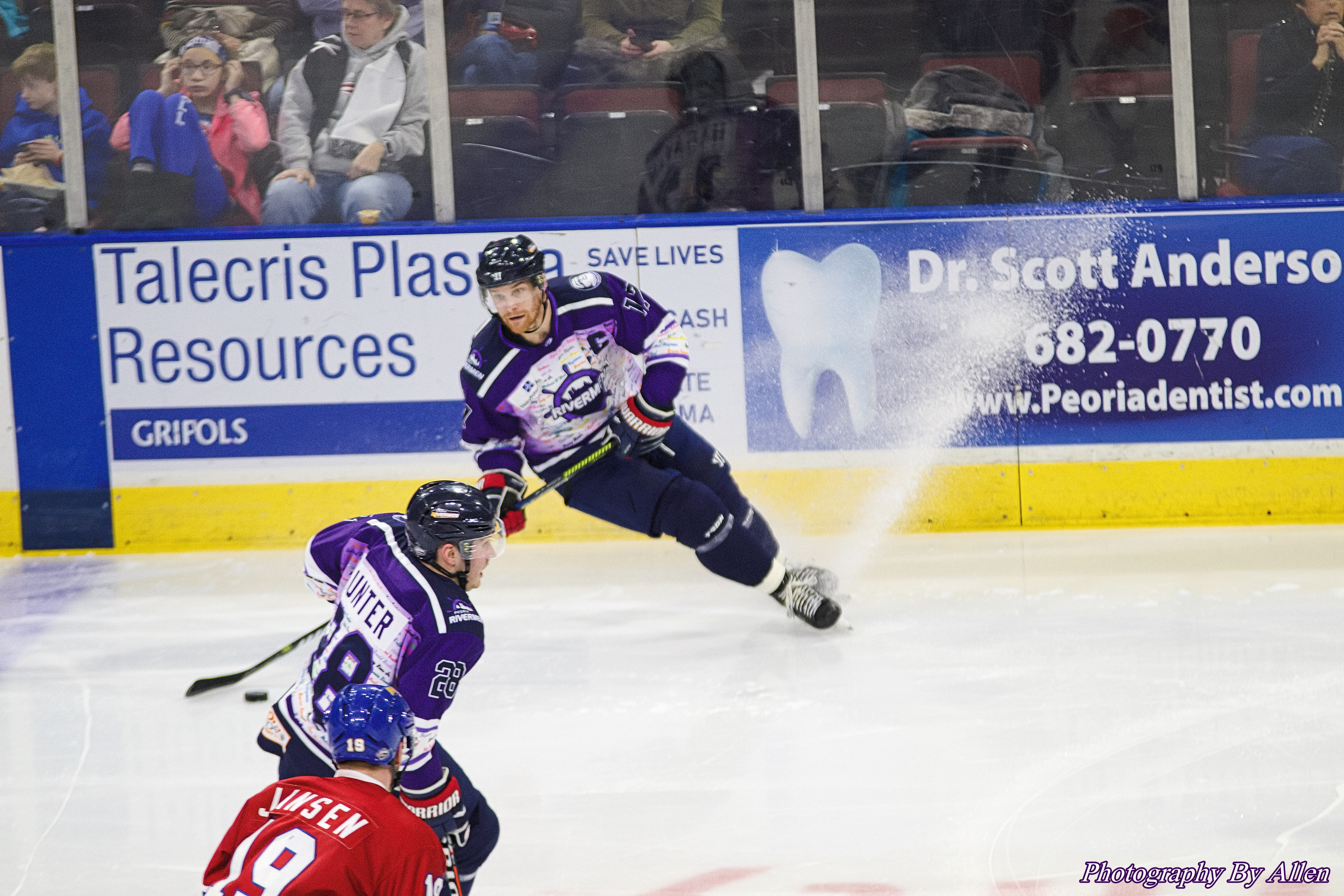Peoria, IL – The Peoria Rivermen and Roanoke Rail Yard Dawgs exchanged goals for three periods before Guillaume Naud played hero in overtime, giving Peoria a 4-3 victory Saturday night at Carver Arena. Peoria’s third straight win improves them to 33-4-5 on the season before tomorrow afternoon’s weekend finale.