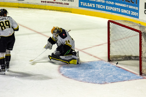 Tulsa Oilers goalie Gage Alexander (35), Iowa Heartlanders forward Brett Budgell (24), Tulsa Oilers defenseman Mike McKee (24)