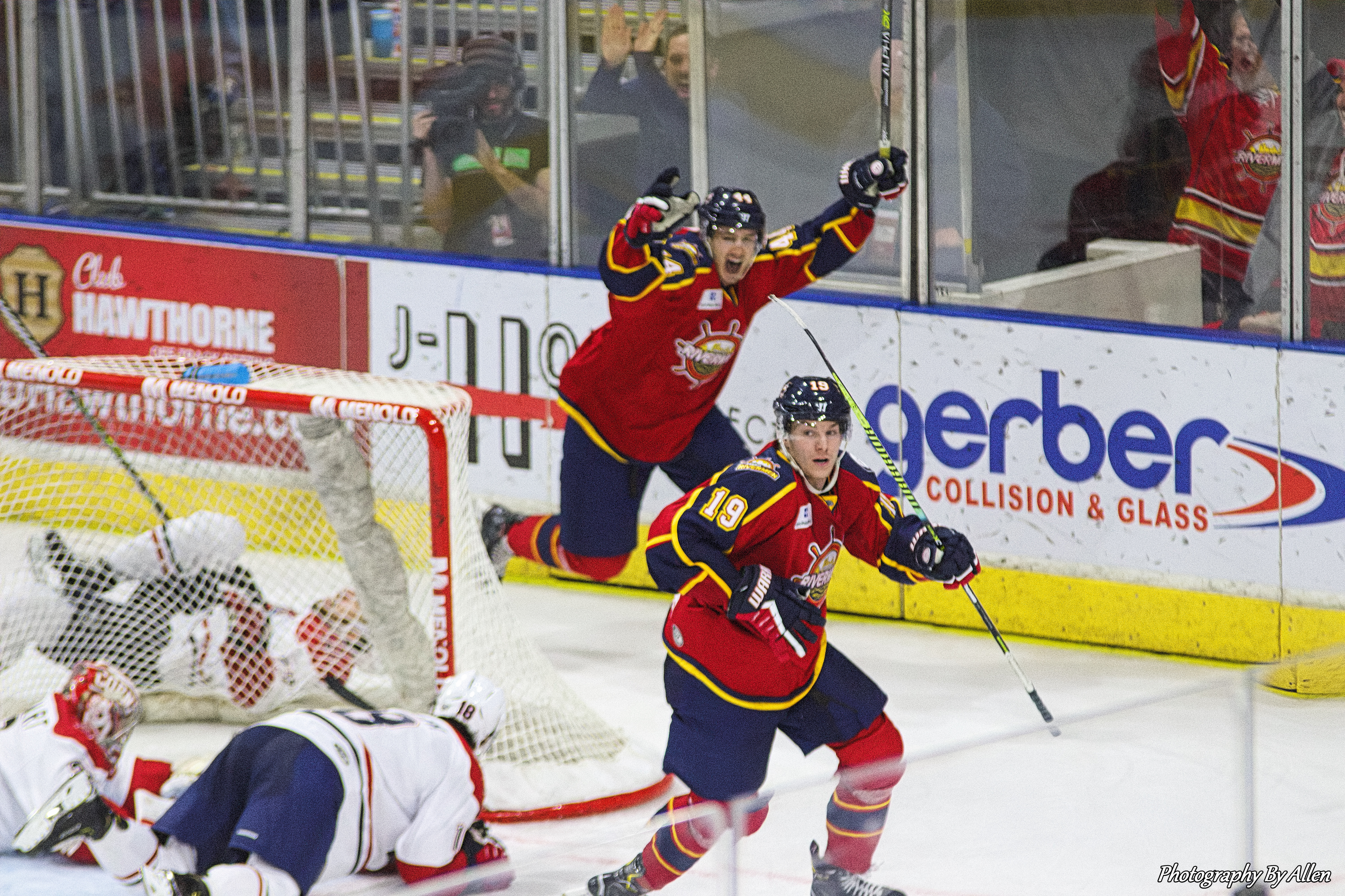 The Rivermen evened the score just beyond the midway point of the contest when Brandon Rumble sent a pass through the neutral zone to Jordan Carvalho, who sped into the offensive zone and snapped a shot that was stopped by Mayhem goaltender Hayden Stewart, but the rebound popped back to Carvalho who swatted a backhand shot over the blocker of Stewart to tie the game, 1-1 at 11:45 of the middle frame.