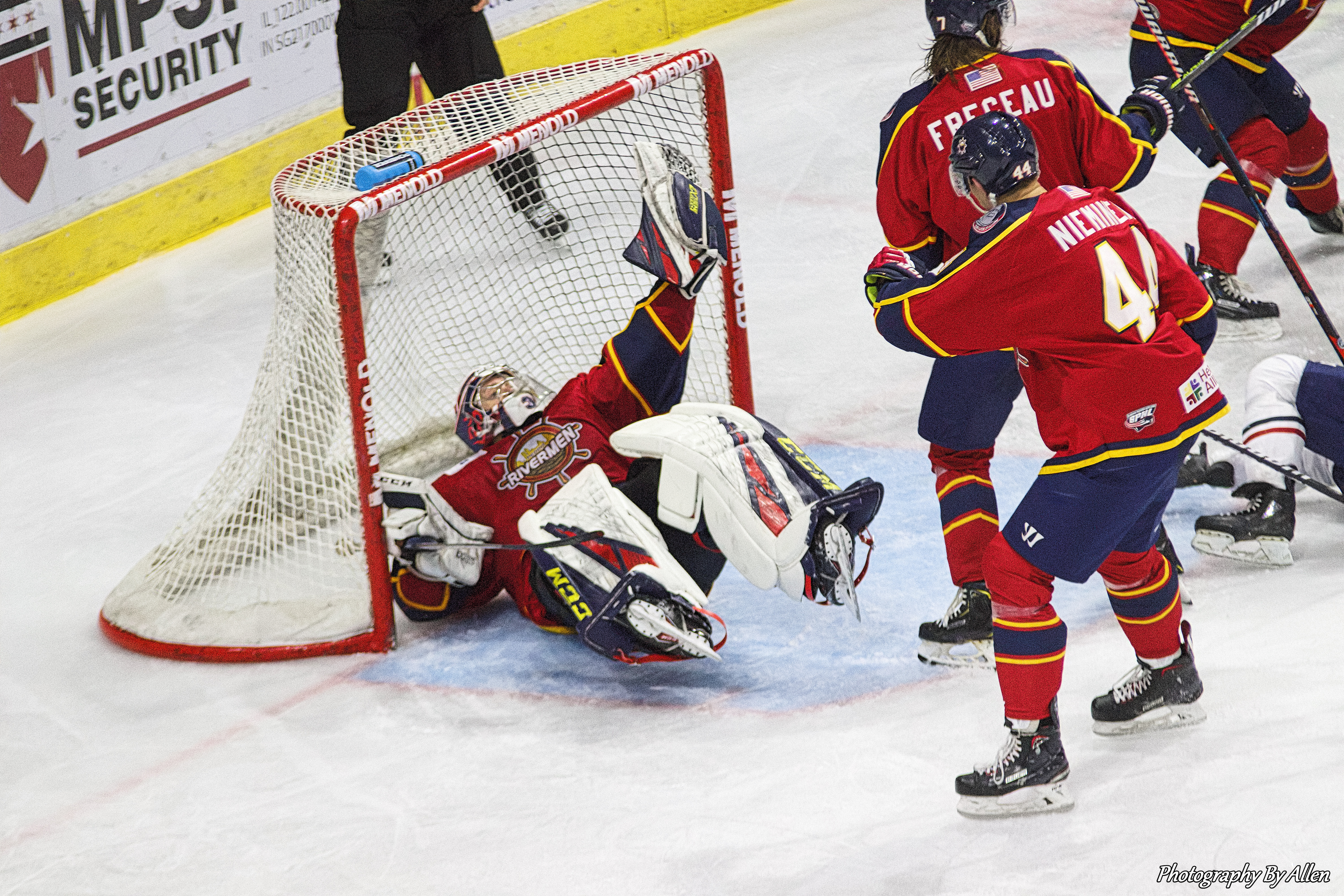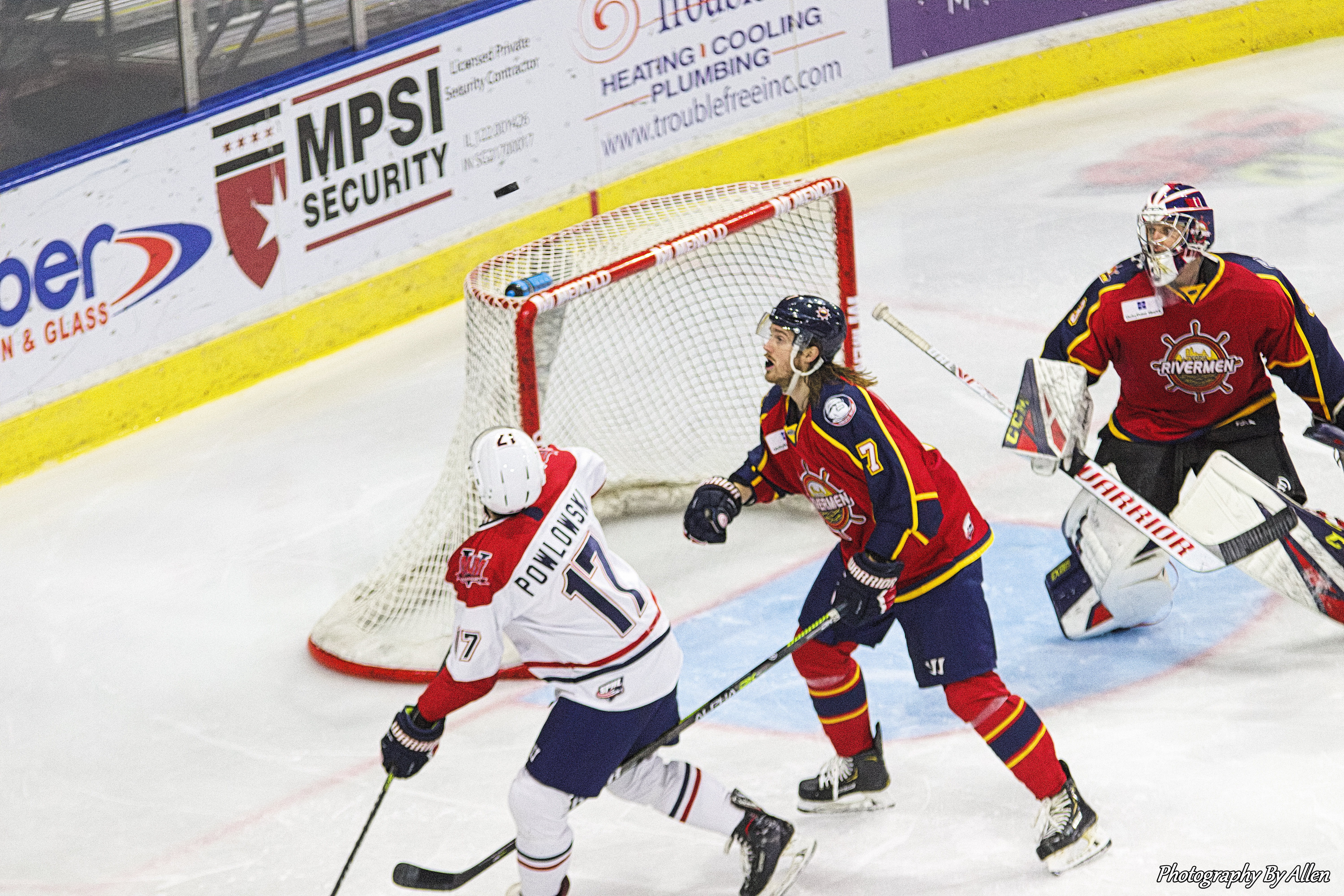 The Rivermen evened the score just beyond the midway point of the contest when Brandon Rumble sent a pass through the neutral zone to Jordan Carvalho, who sped into the offensive zone and snapped a shot that was stopped by Mayhem goaltender Hayden Stewart, but the rebound popped back to Carvalho who swatted a backhand shot over the blocker of Stewart to tie the game, 1-1 at 11:45 of the middle frame.