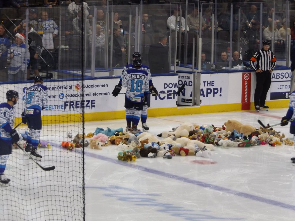 JACKSONVILLE, FLA – Tim Harrison netted a hat trick to pace the South Carolina Stingrays to a 4-3 victory over the Jacksonville Icemen at Veterans Memorial Arena on Saturday, December 21st. Despite the loss, the Icemen and their fans donated and collected 11,371 stuffed toys in the Annual Teddy Bear Toss Game.
