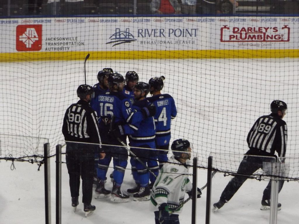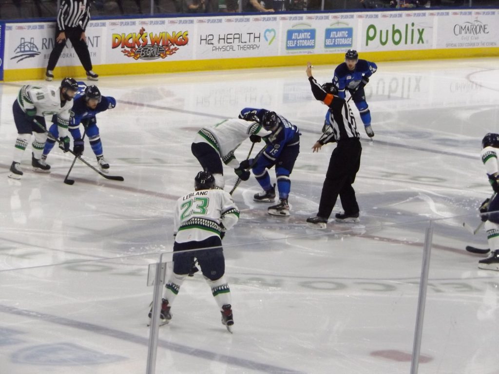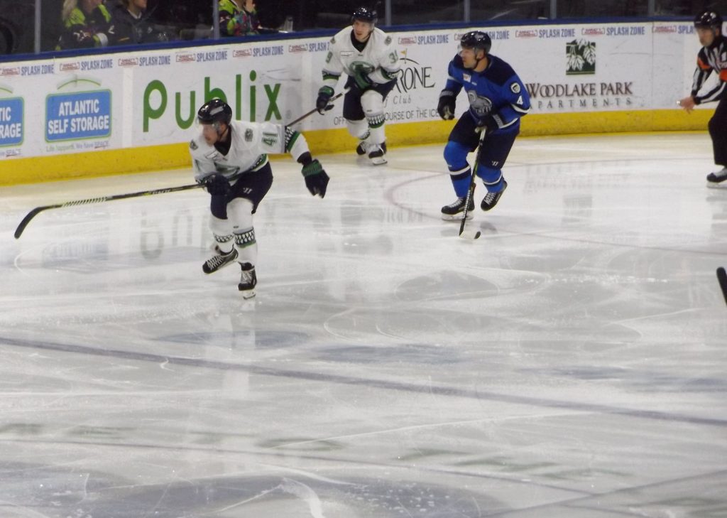 The battle opened in the first period when just 1:42 in, the Everblades Cameron Hebig celebrated his return by firing a wrist shot from the near side boards through a screen. The shot beat Jacksonville goalie Kyle Keyser for Hebig’s 5th of the season. The score stayed that way until with one minute remaining before the internission, Just as a power play was ending, Icemen defenseman Ryker Killins launched a shot from the point that deflected off of teammate Derek Lodermeier and past Everblades netminder Jake Hildebrand for Lodermeier’s 14th of the year to make it a 1-1 game.
