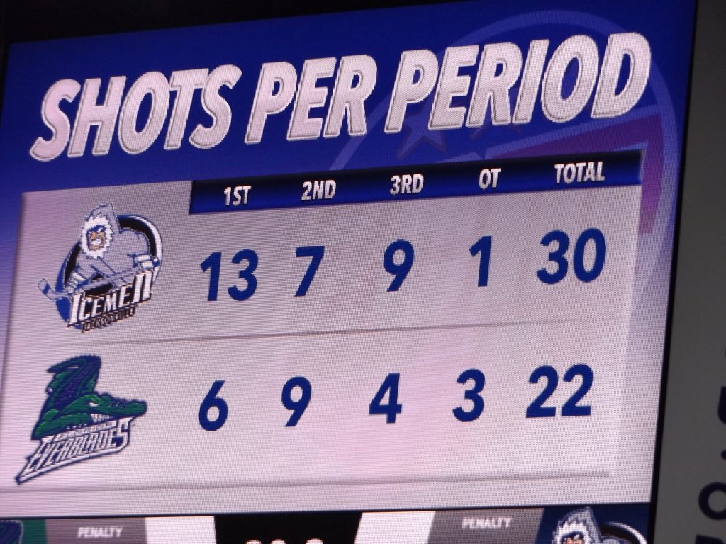 Florida took its third and final lead of the game 7:24 into the final frame. On a two-on-one break, rookie Zach Solow held on to the puck and went top shelf on Keyser’s glove side for his first with the Everblades to give the visitors a 3-2 lead. The Icemen battled for the game-tying tally and finally got it with 62 seconds left in regulation. Jacksonville worked the puck around the perimeter before Brandon Gignac sent it toward the net. Nazarian was in the right place to deflect it into the back of the cage for his 21st of the season and a 3-3 deadlock.