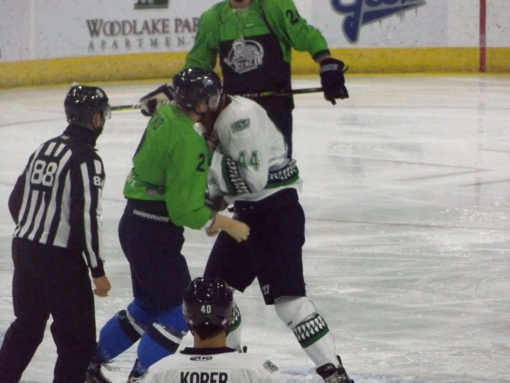 Just over a minute into the game, Icemen defenseman Jacob Friend and Everblades defenseman Cody Sol got into a spirited scrap and both received five-minute majors for fighting.