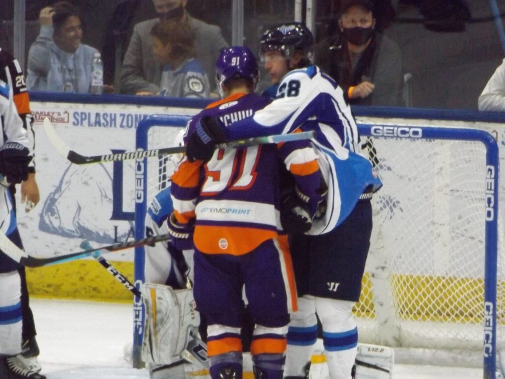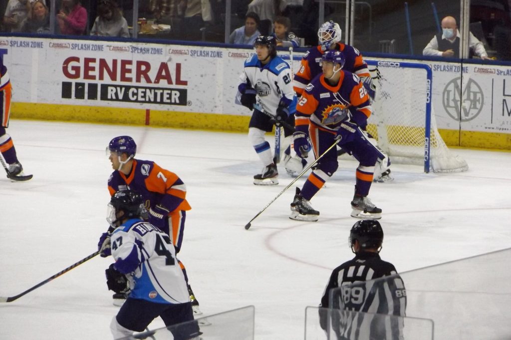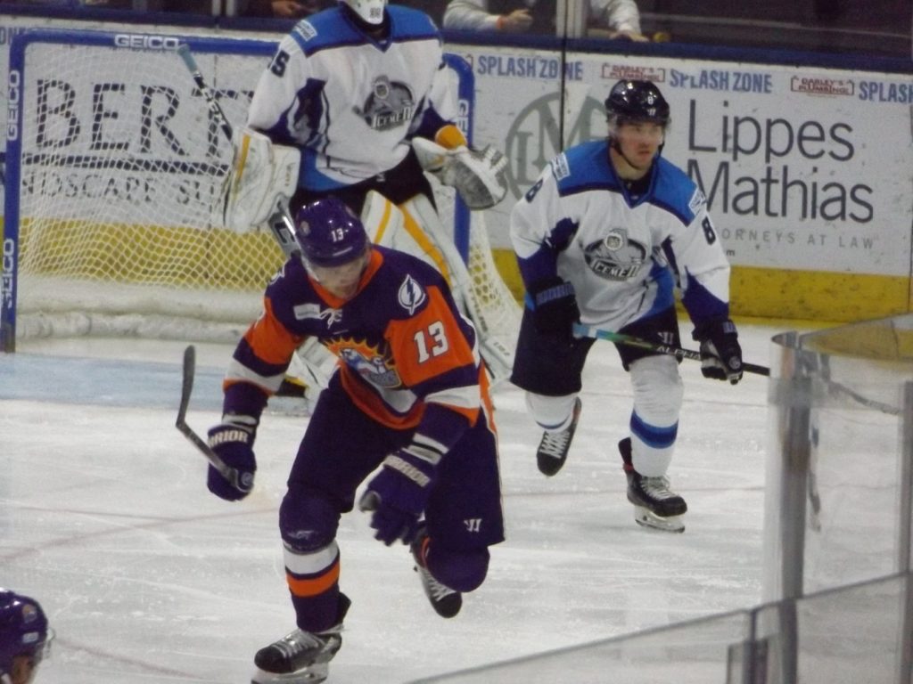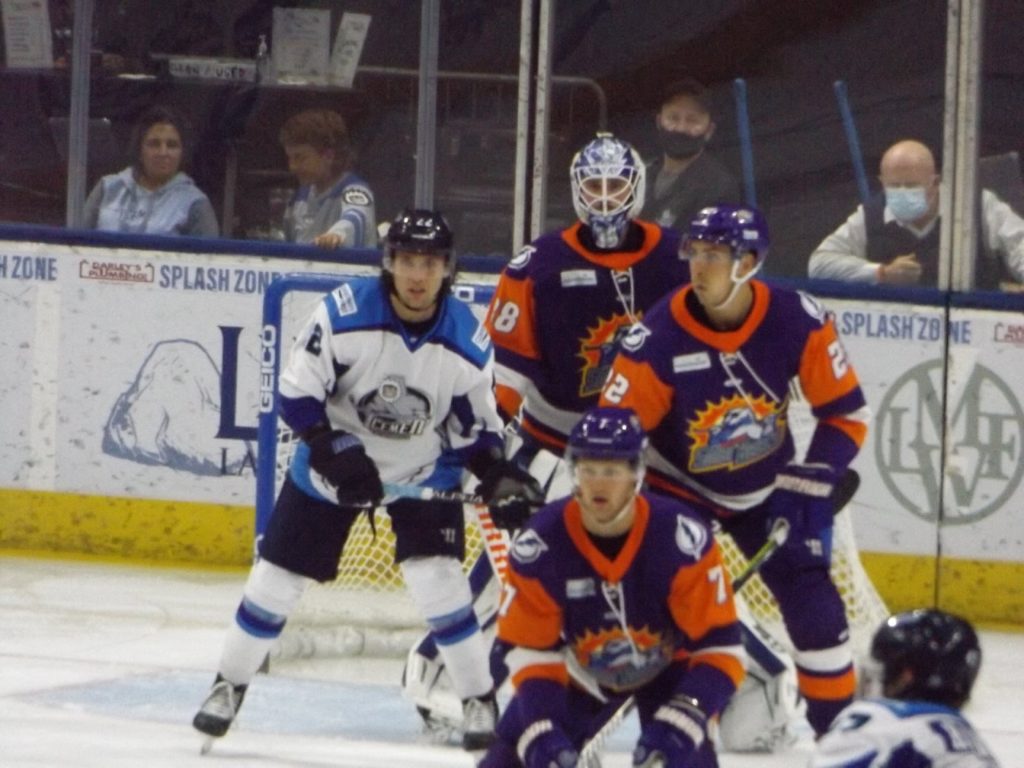 Nearly 30 seconds into the third period, the Icemen had another powerplay as Orlando’s Tristin Langan was called for tripping. On the powerplay, Icemen forward Abbott Girduckis scored off a great cross-crease pass from Bradford to increase the lead to three.