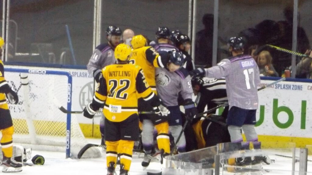 The calmness of the first stanza morphed into a goalfest in the second. The Nailers took the lead at 1:37 when Cody Sylvester scored his 19th on a man advantage with Patrick Watling and Josh Winquist getting assists. The Icemen responded a little less than two minutes later on Abbott Girduckis’ 10th goal off of assists from Mike Szmatula and Jacob Friend.