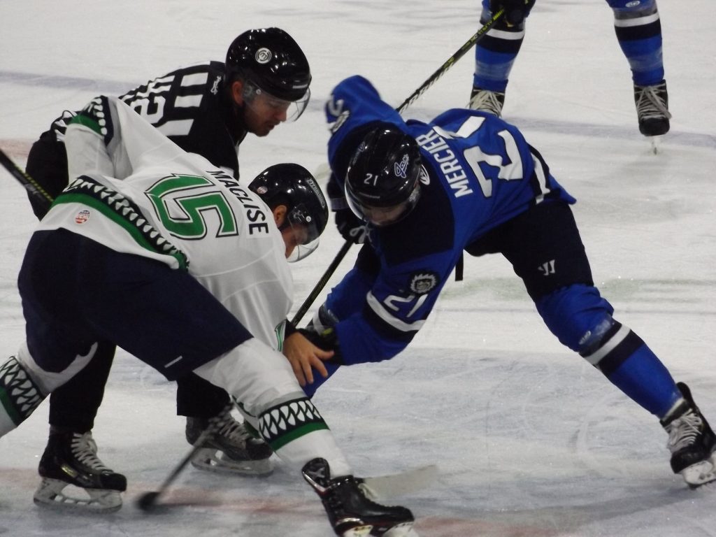 Three minutes later, the Icemen netted the tying goal. Jacob Cederholm raced into the zone with the and feathered a pass across to Pierre-Luc Mercier in the slot. Mercier curled a shot high into the corner of the net to even the score at two.