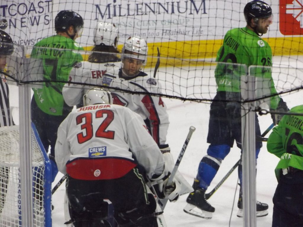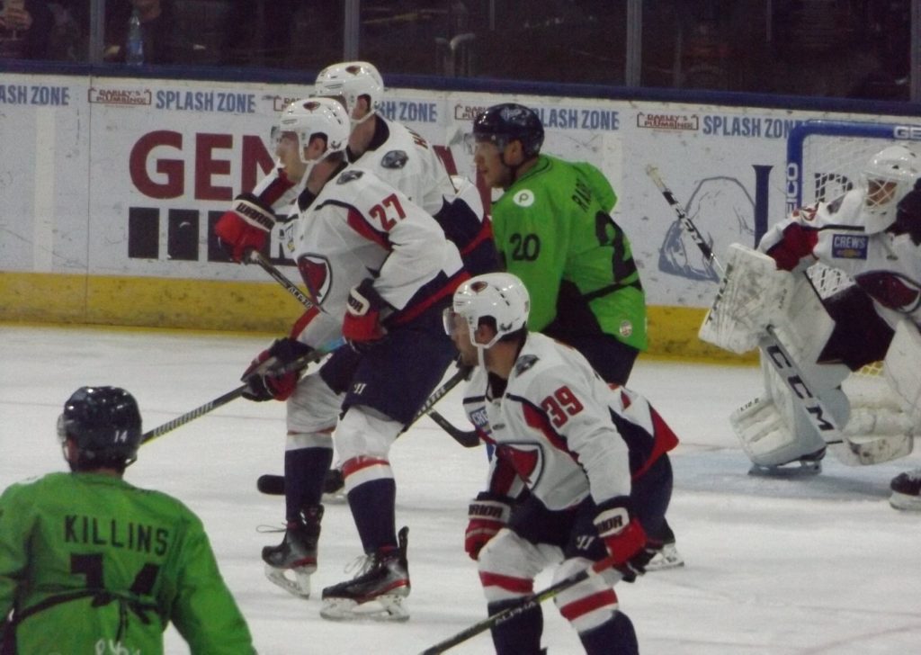 Following a scoreless second frame, it took more than half the final stanza for another goal to be registered. Playing on a power play, Jacksonville’s Erik Bradford fired a shot on Stingrays netminder Matt Jurusik. Jurusik made the save but Icemen sniper Ara Nazarian dug out the rebound and shoved it under the goalie to even the score at 1-1 with 6:38 remaining in regulation.