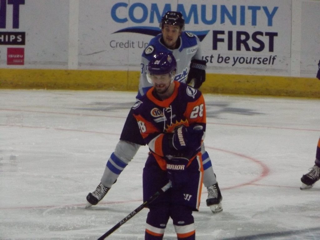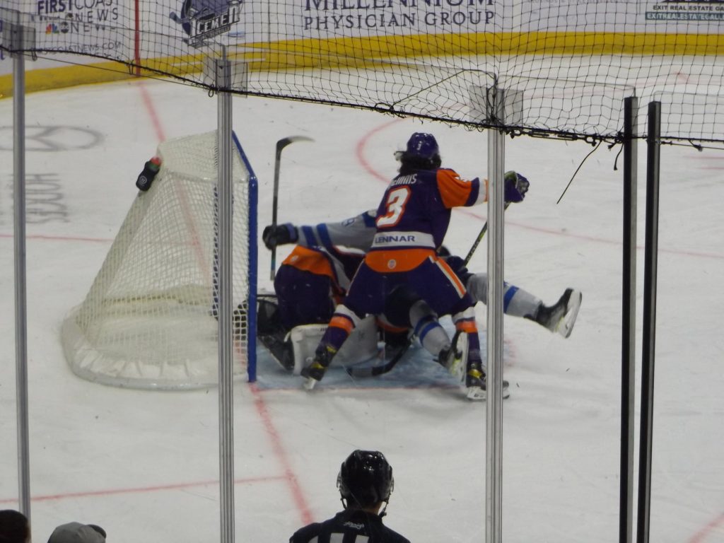 Midway through the final frame, the visiting Solar Bears struck for what would be the only score of the night. It came when defenseman Luck McInnis’ shot from the point was deflected past Broussard by rookie Shawn Element for his first ECHL tally.